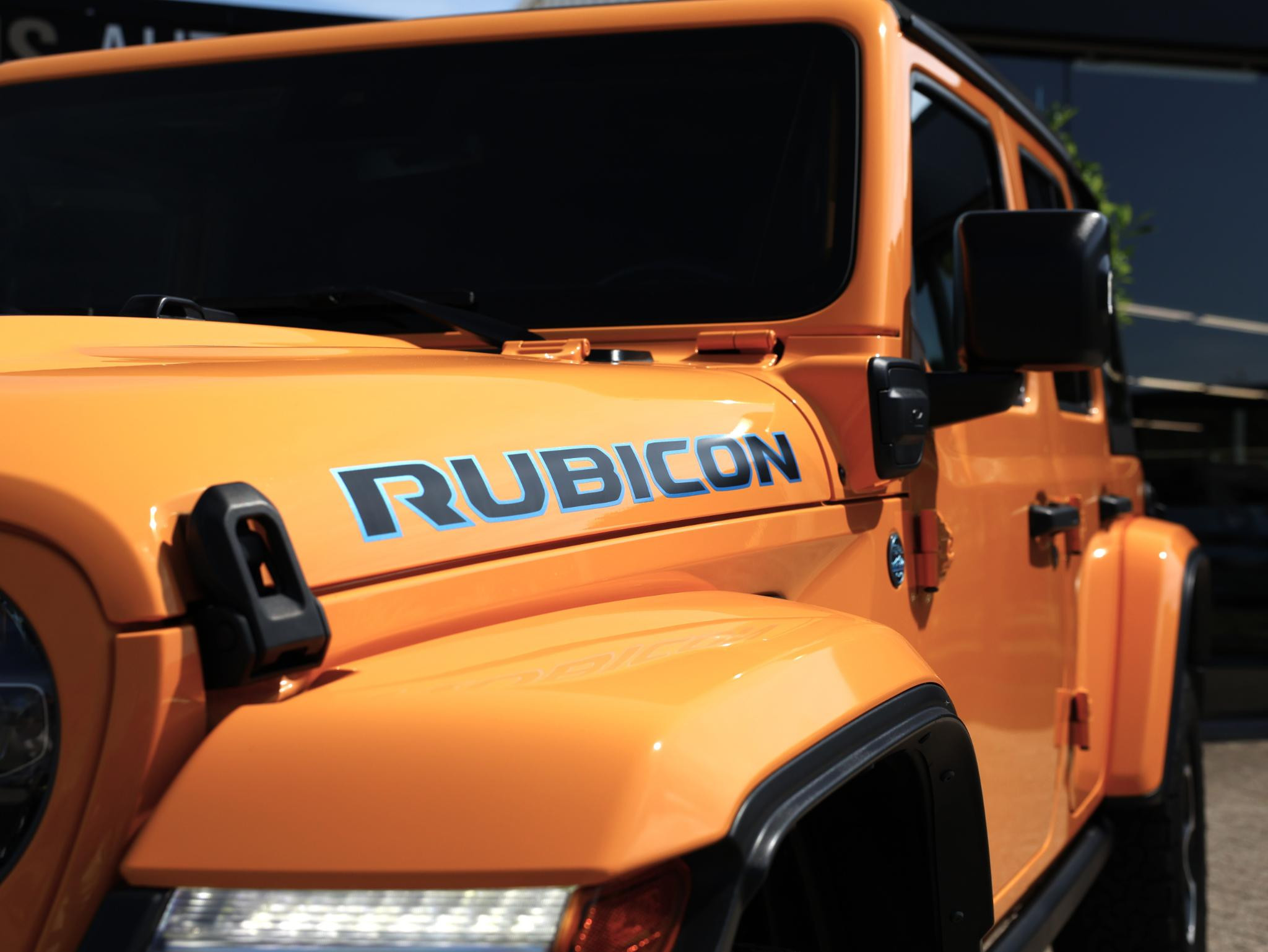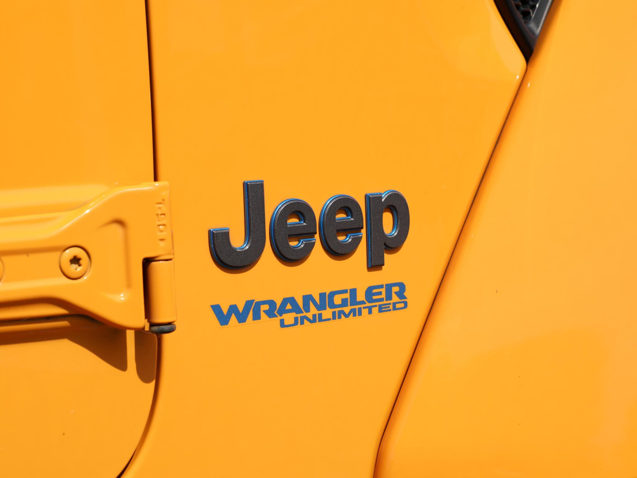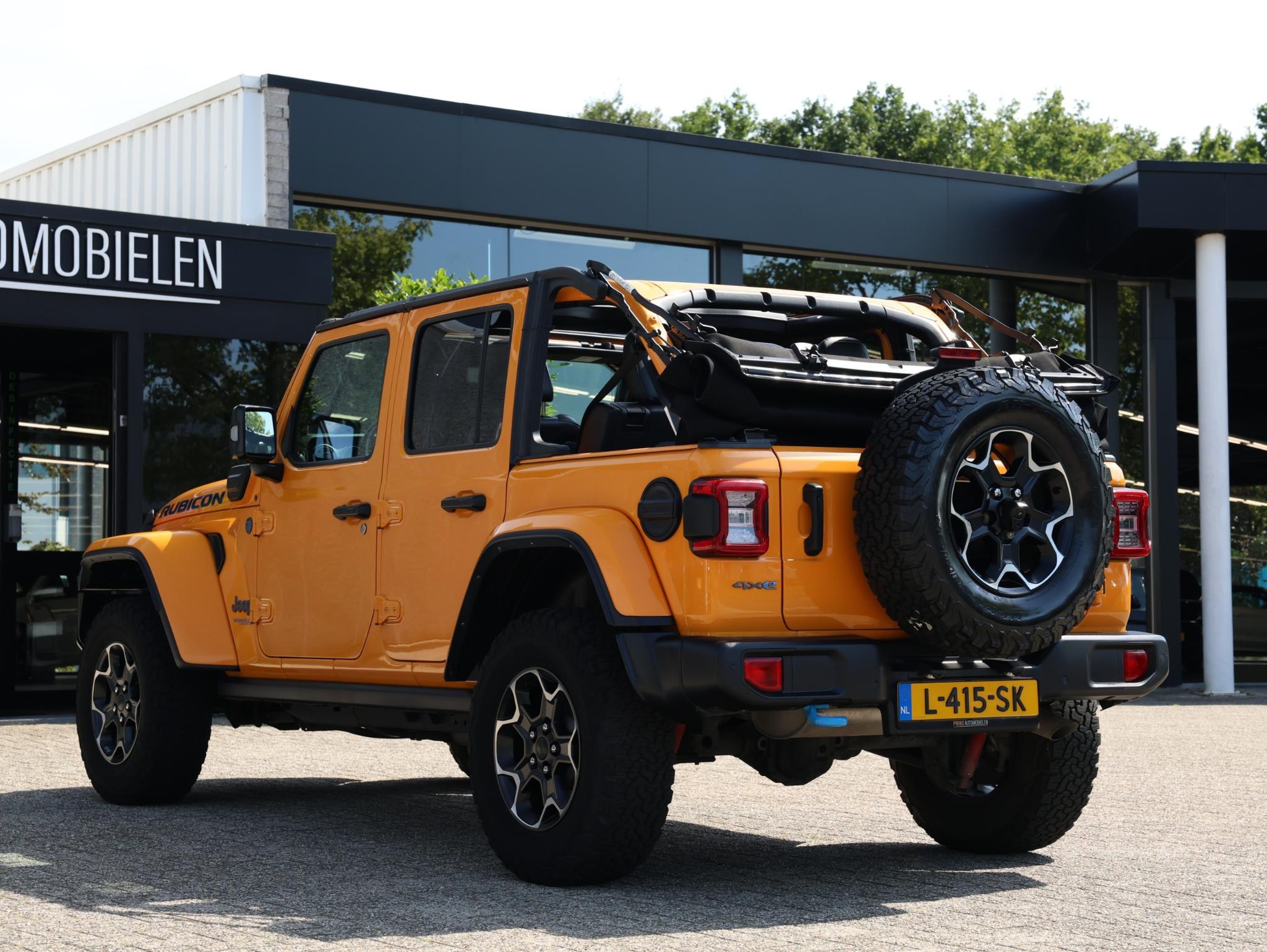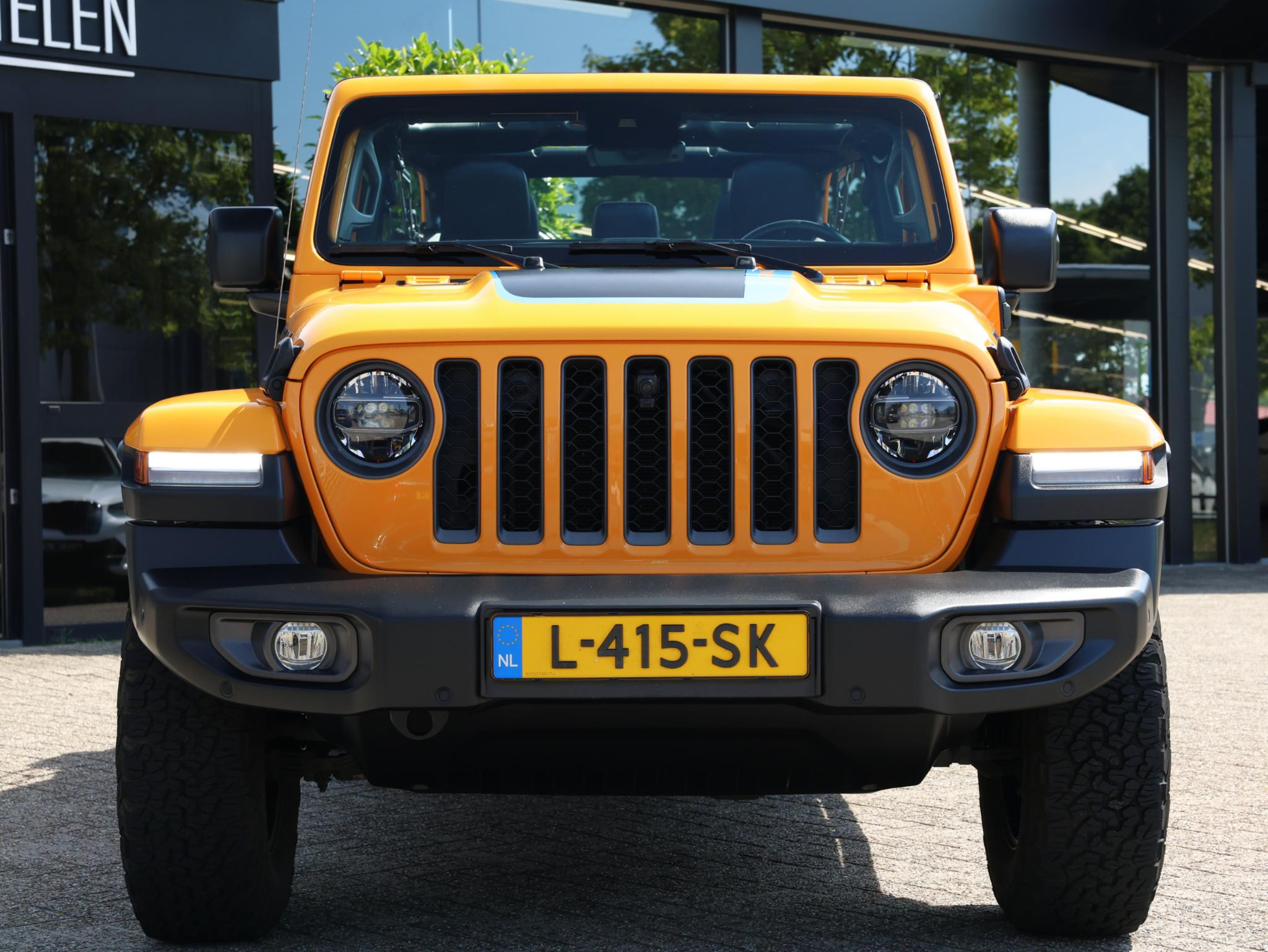 Nacho! Dat is de kleurbenaming van de lak welke deze ruige JEEP Wrangler Rubicon 4XE draagt en daarmee valt hij nog meer op!