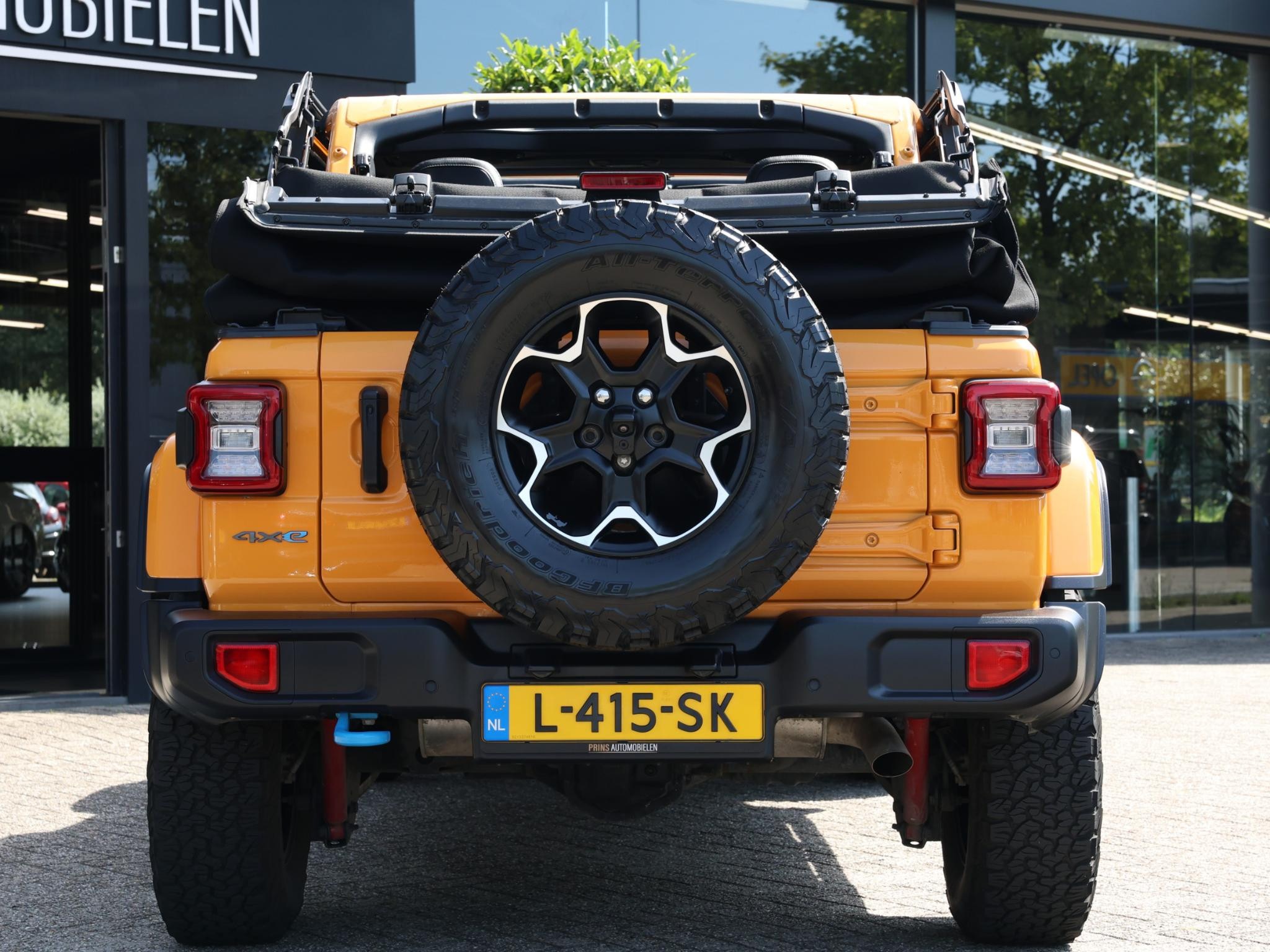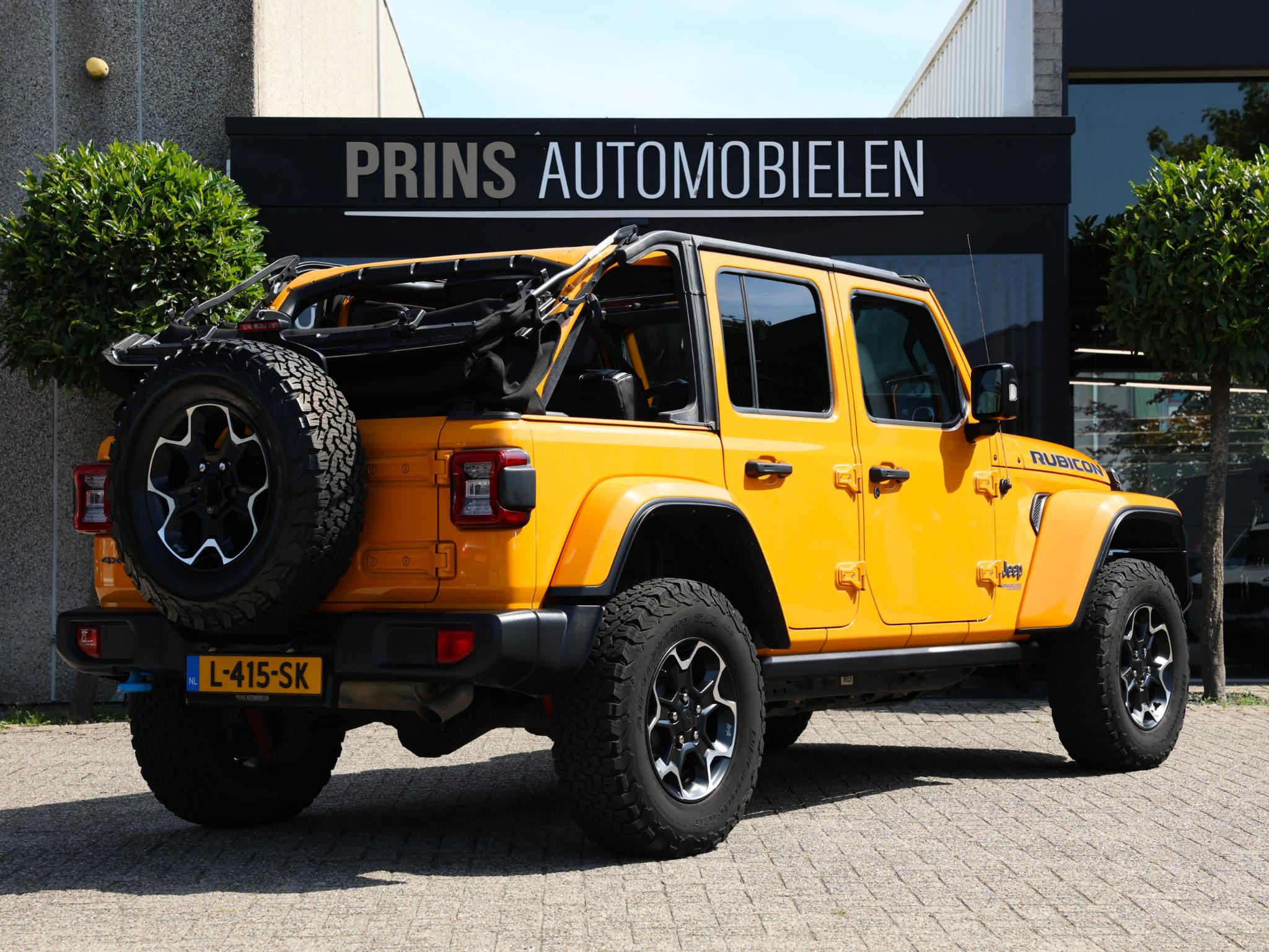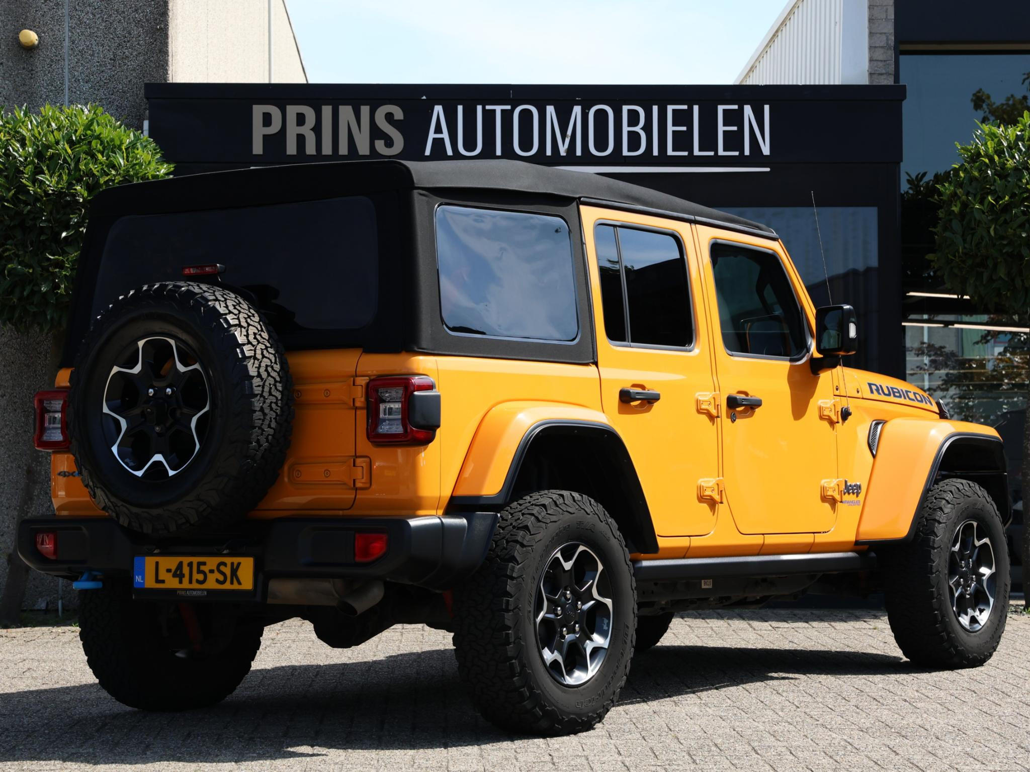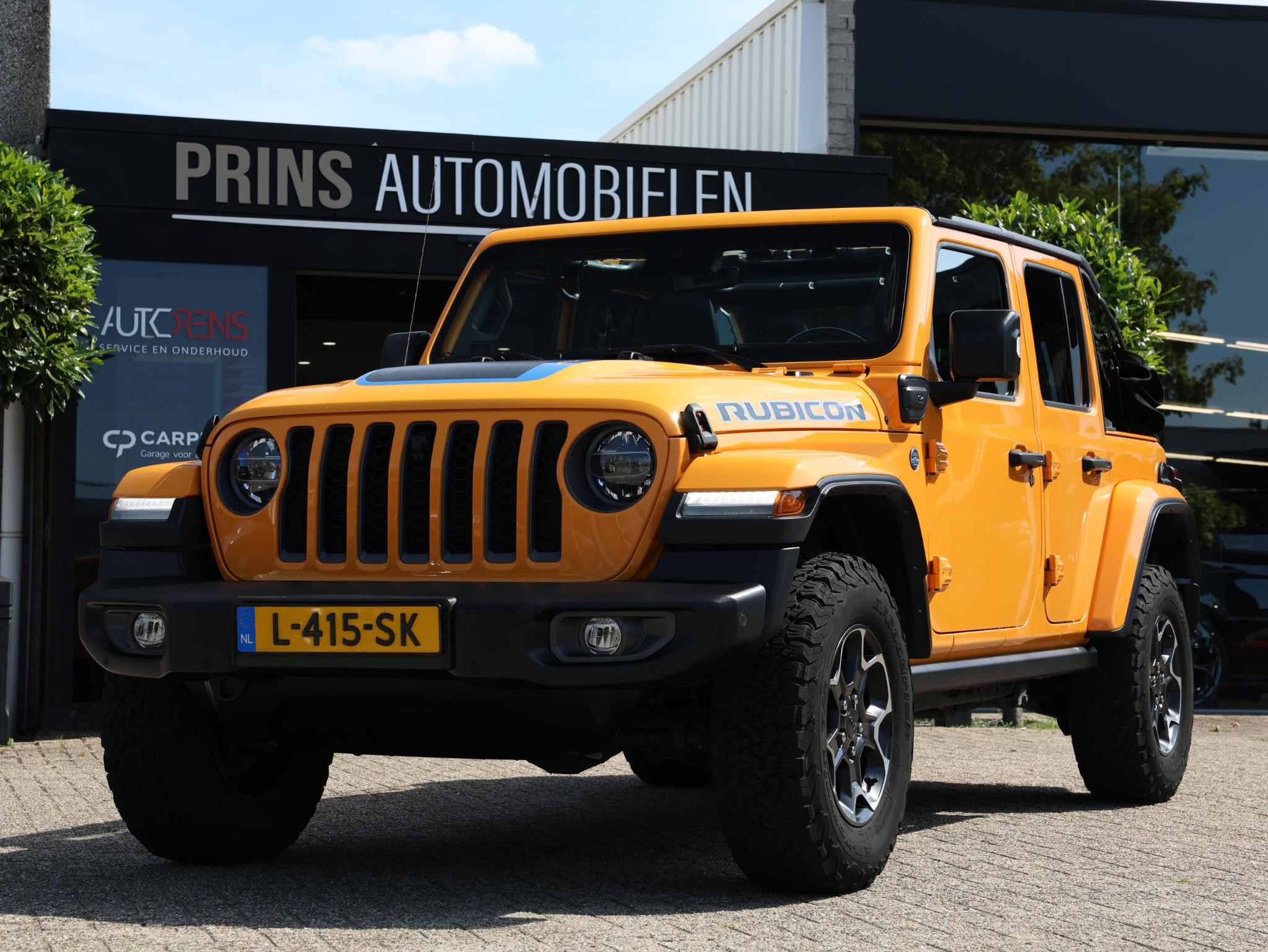 Nacho! Dat is de kleurbenaming van de lak welke deze ruige JEEP Wrangler Rubicon 4XE draagt en daarmee valt hij nog meer op!
