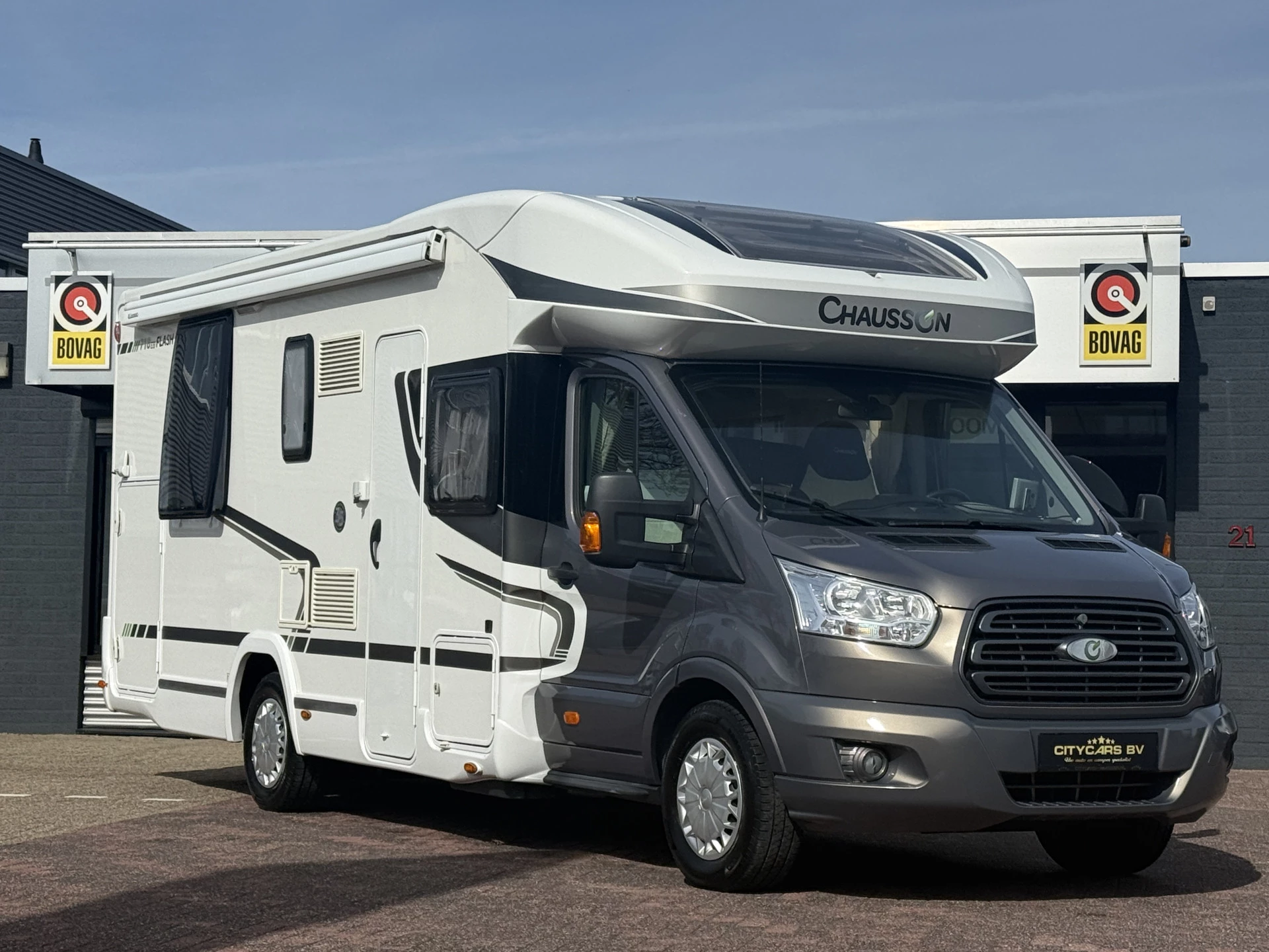 Chausson Flash 718 EB queensbed+hefbed fietsenrek zonnepaneel elktr schotel tv hordeur remis plisse
