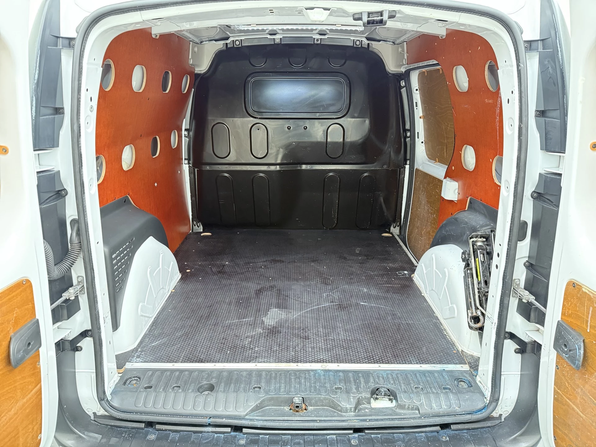 De laadruimte is netjes betimmerd met een bedrijfswagen inrichting en voorzien van een professionele betonplex vloer.