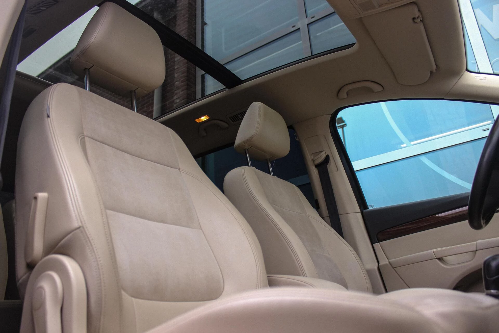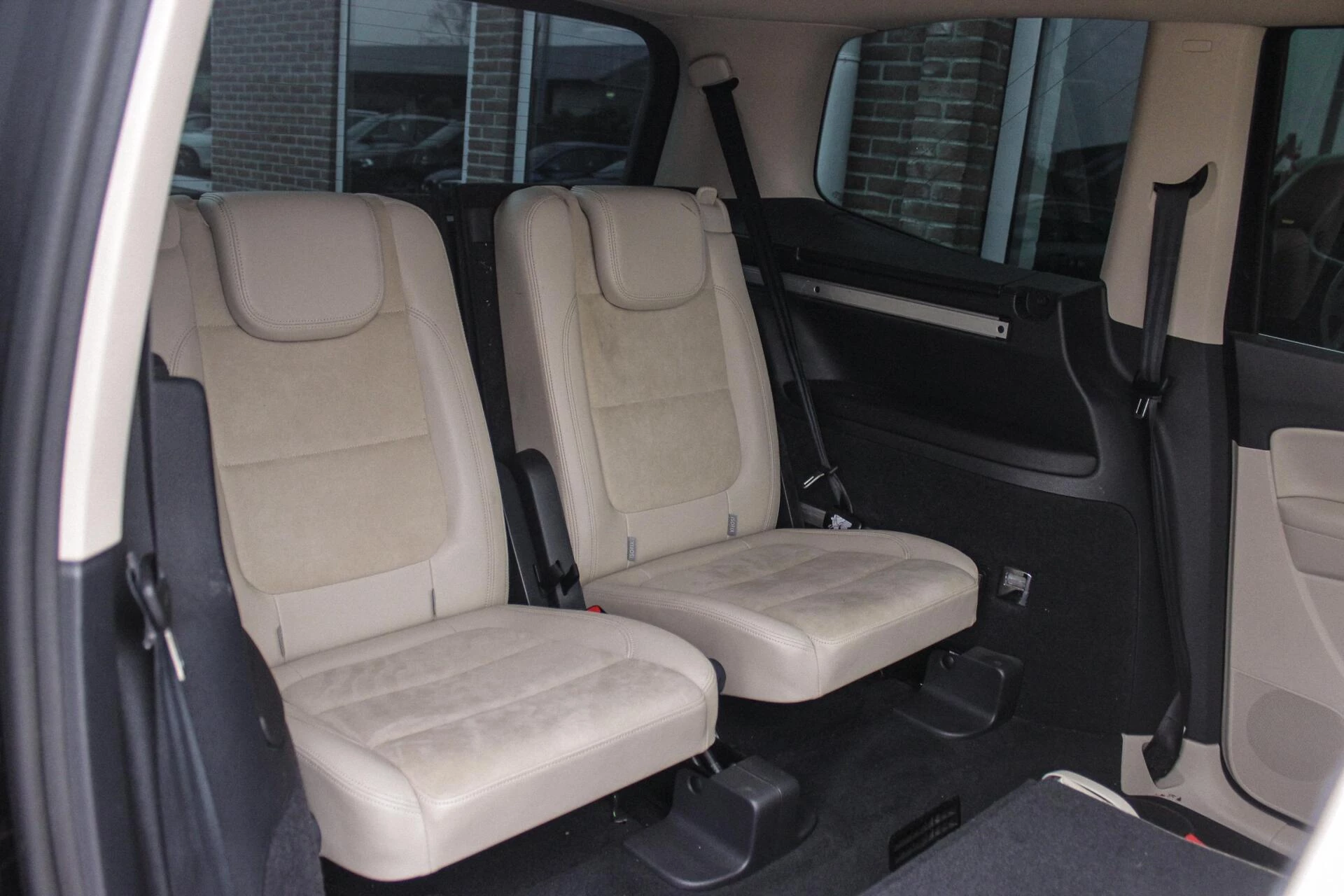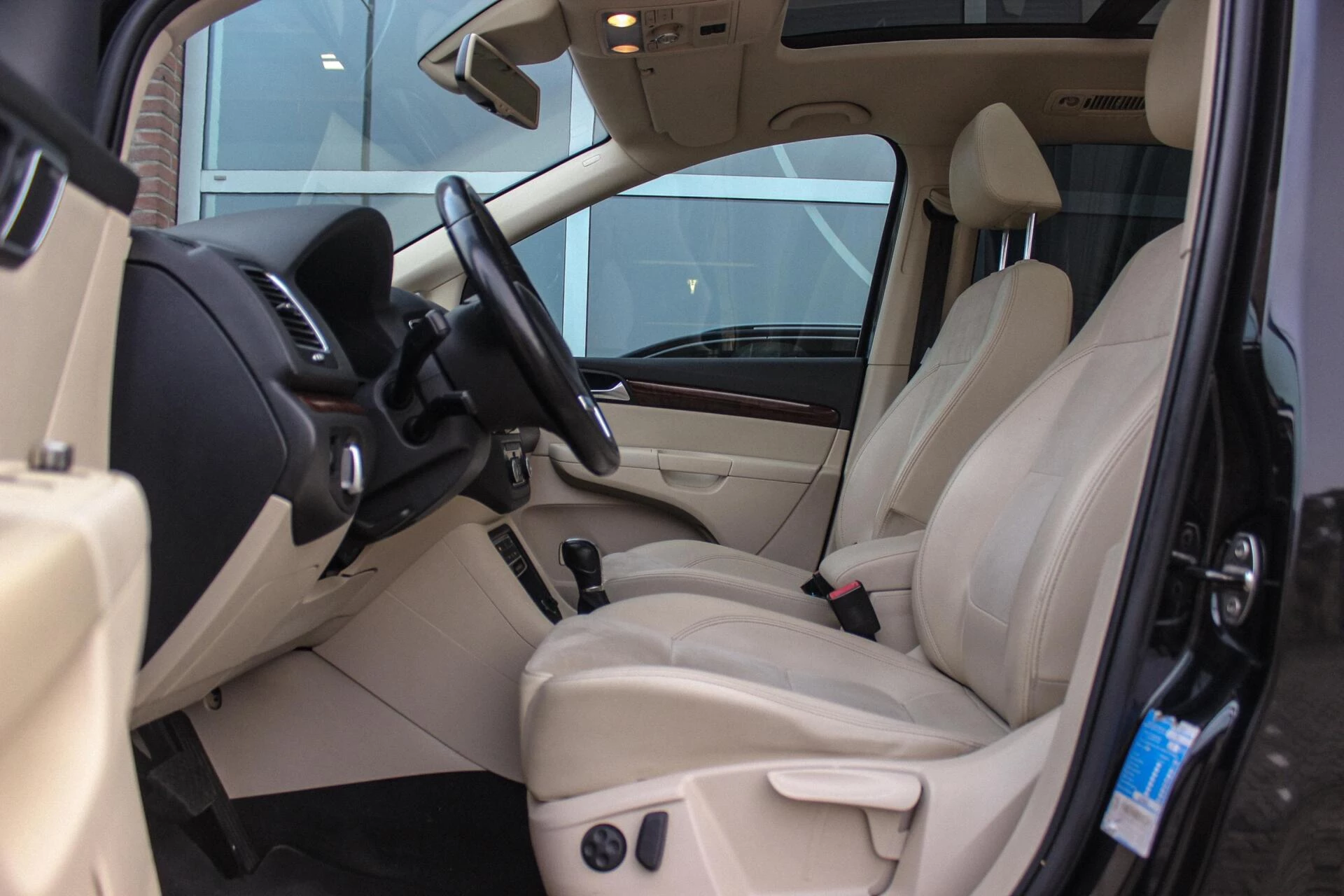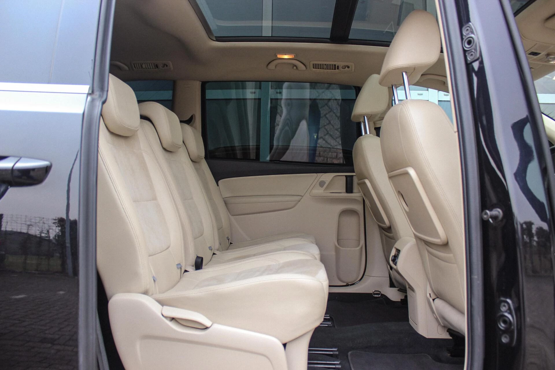 Van binnen een beige half alcantara/lederen interieur onderbroken met een houten dashboard en een panoramisch schuif/kantel dakraam. Achterin een 3e zitrij (7persoons) + ISO-fix aansluitingen.