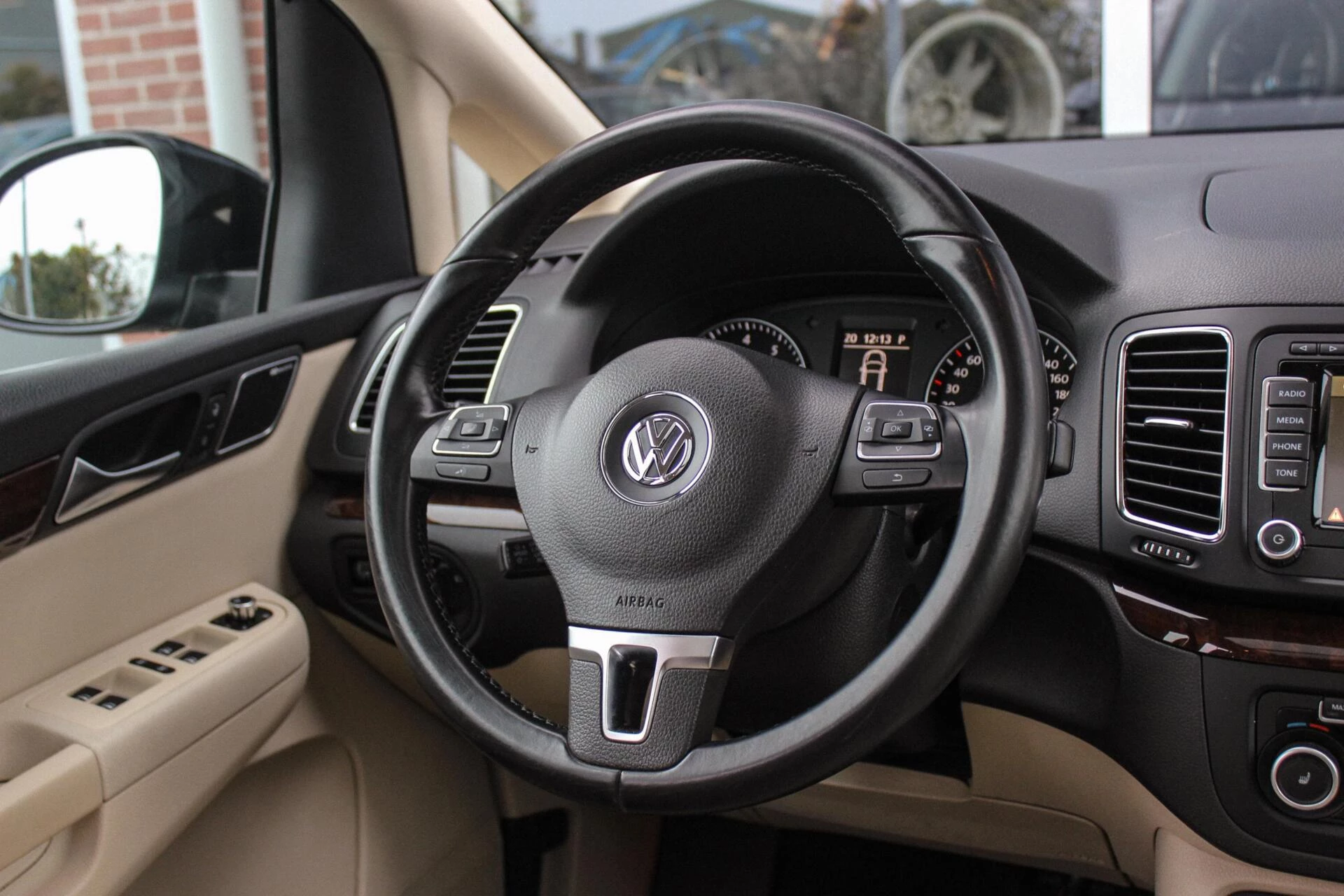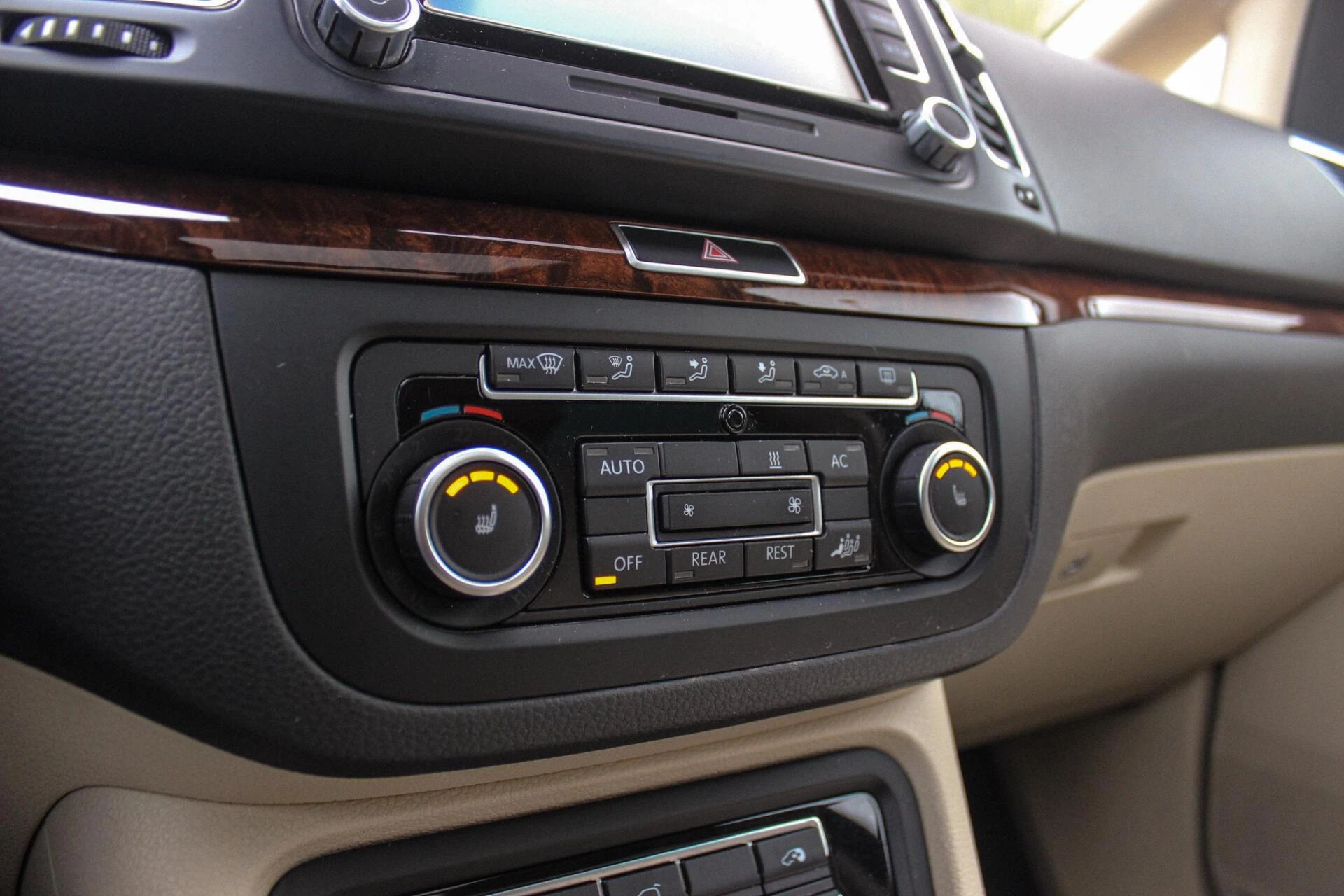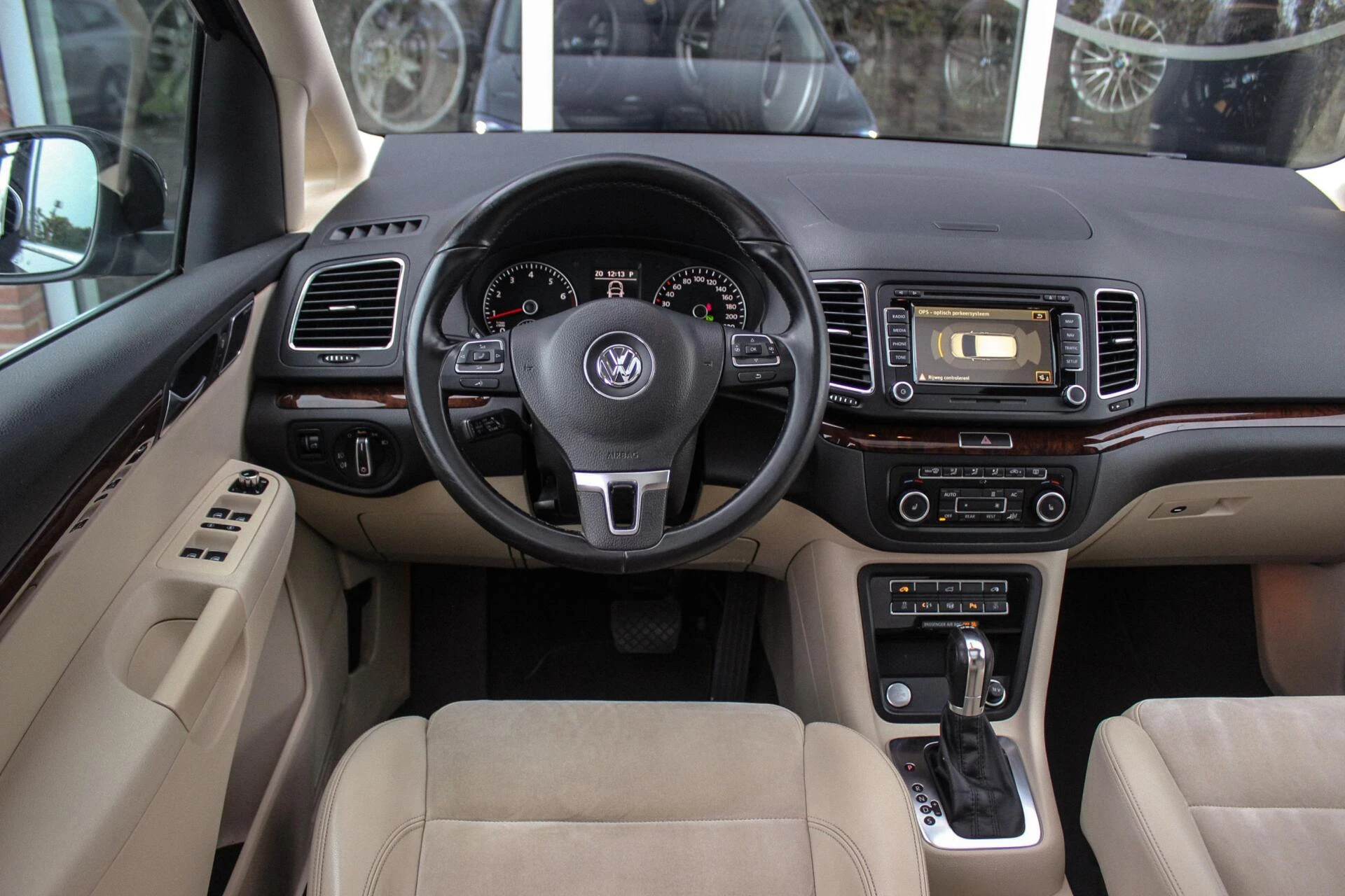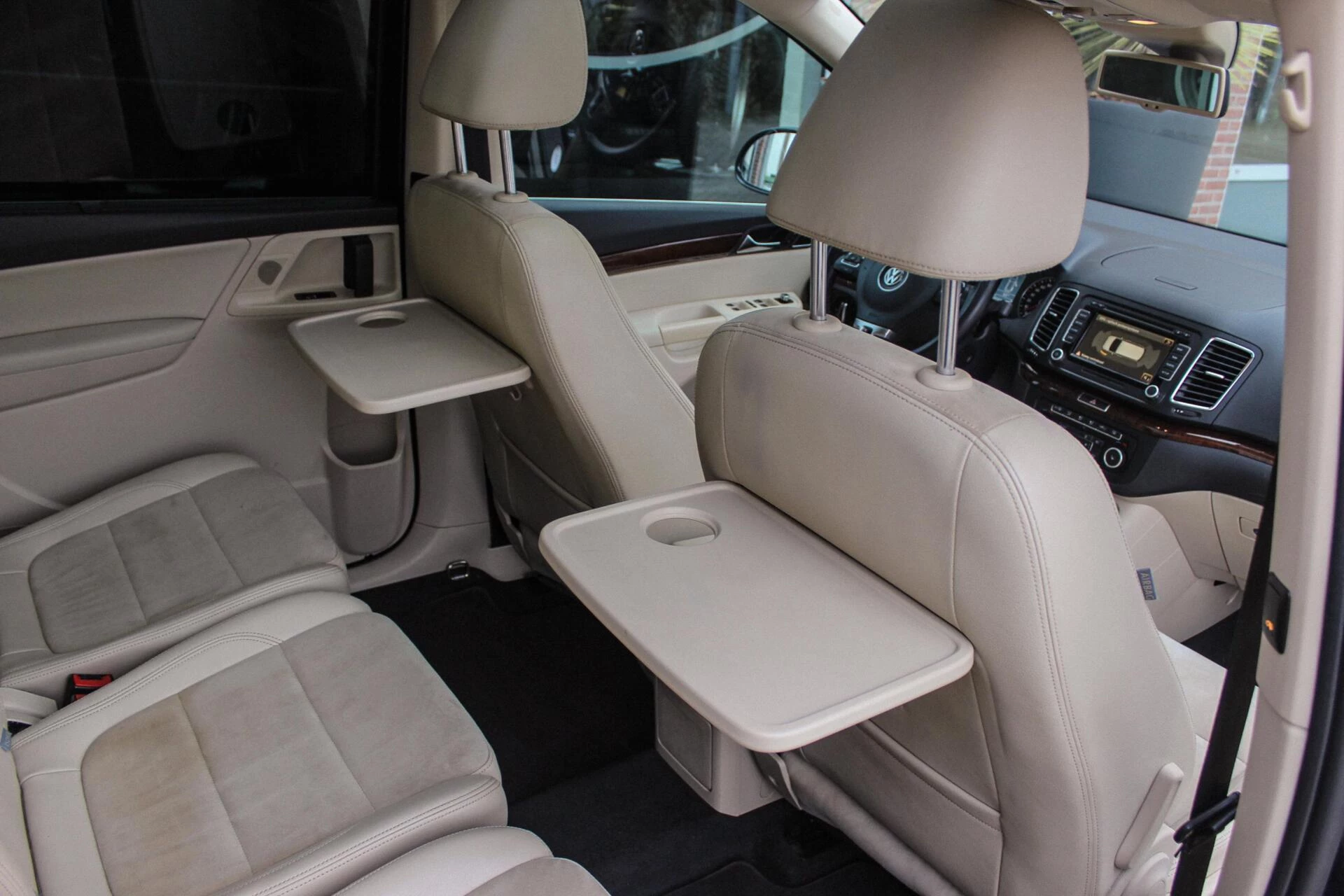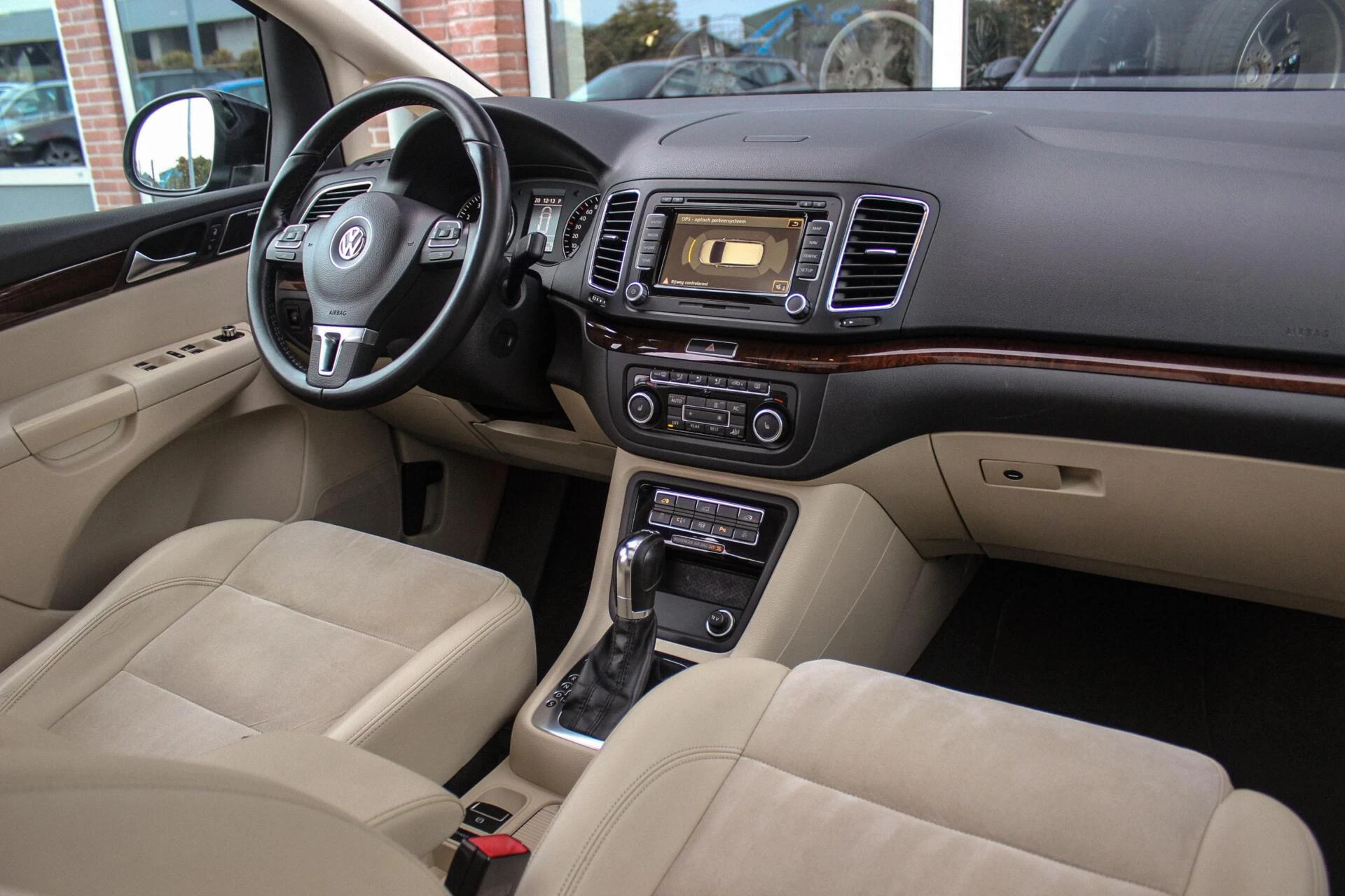 Van binnen een beige half alcantara/lederen interieur onderbroken met een houten dashboard en een panoramisch schuif/kantel dakraam. Achterin een 3e zitrij (7persoons) + ISO-fix aansluitingen.