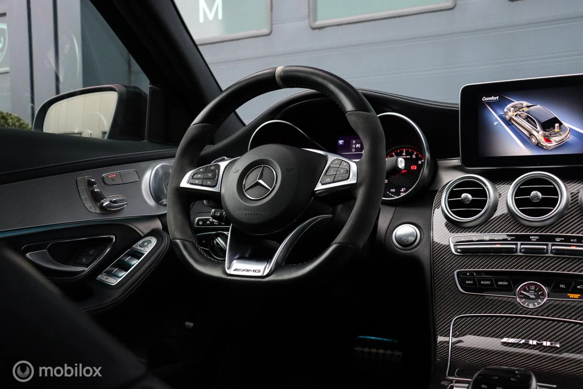 Deze Mercedes-AMG C63s beschikt over alle denkbare opties zoals onder andere: Audio-navigatiesysteem: COMAND Online, Metallic-lak, Adaptieve cruisecontrol, Rijassistent-pakket Plus, Elektrisch verstelbare voorstoelen met memory, Verwarmbare voorstoelen, AMG Driver's Package, Opbergruimte-pakket, Panoramisch zonnedak, Head-up-display, Automatische airconditioning, Intelligent Light systeem LED, Surround-systeem Burmester, Nappa lederen bekleding, Ambienteverlichting, Keyless, Keramisch remsysteem, Carbon interieur, Parkeer-pakket, Spiegelpakket, Night-pakket (AMG), Sport-uitlaatsysteem (AMG-performance).