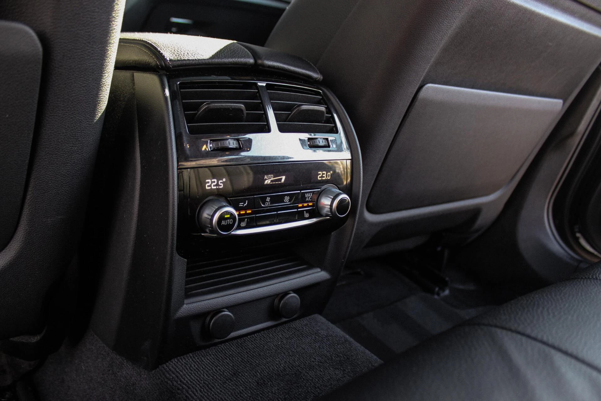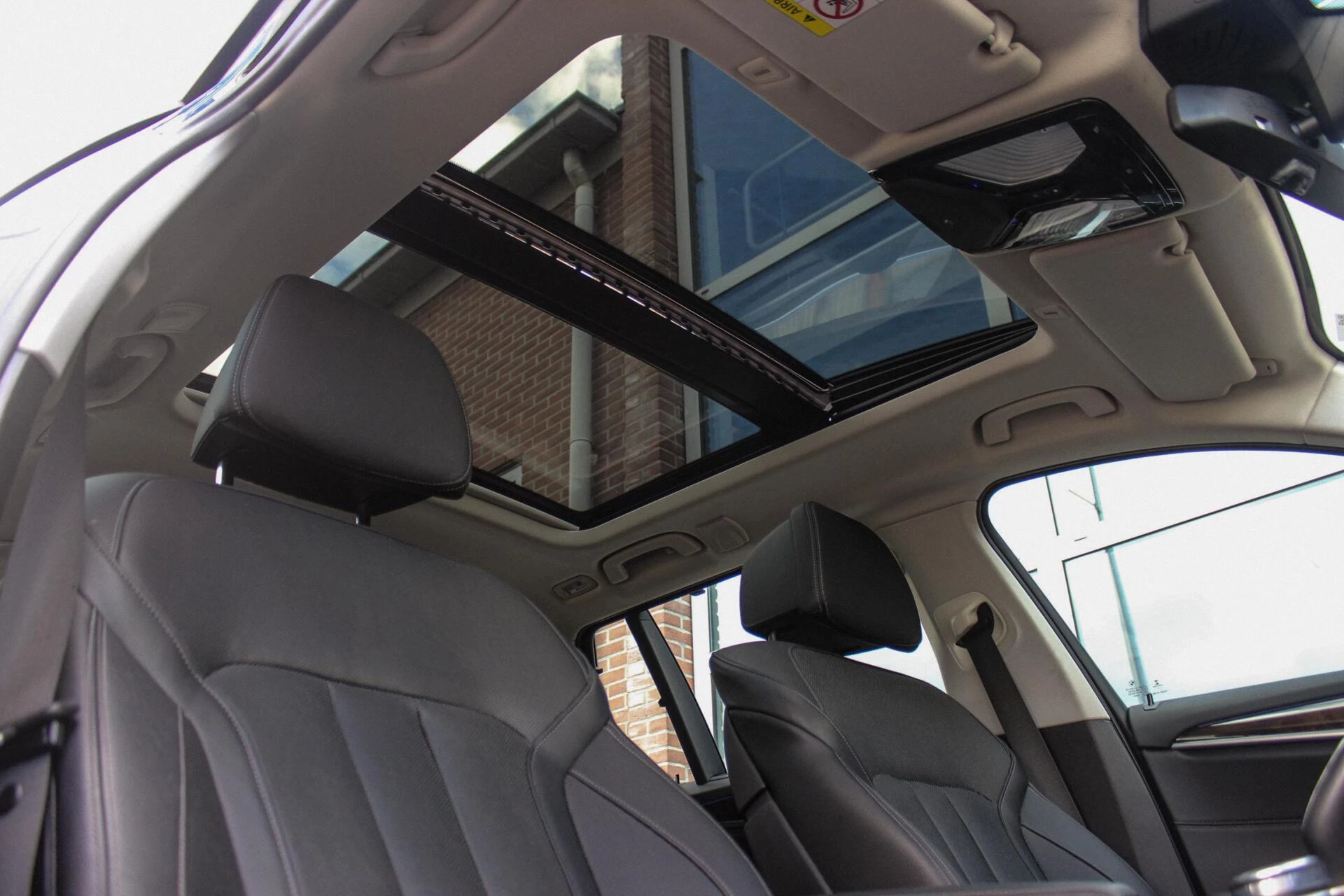 Van binnen een zwart lederen interieur onderbroken door een Fine-wood dashboard inleg met sfeerverlichting + een panoramisch schuif/kantel dak. Achterin een deelbare achterbank met verwarming & climate-control.