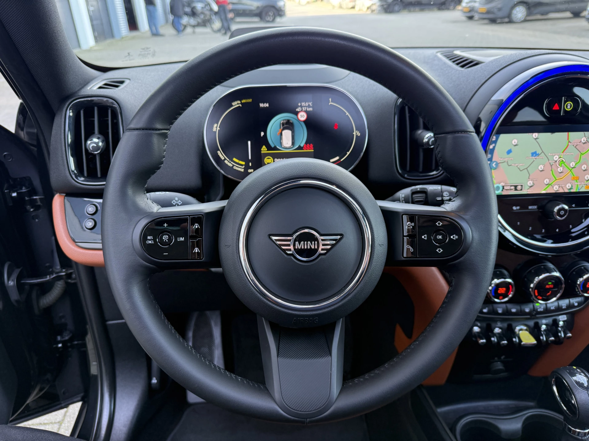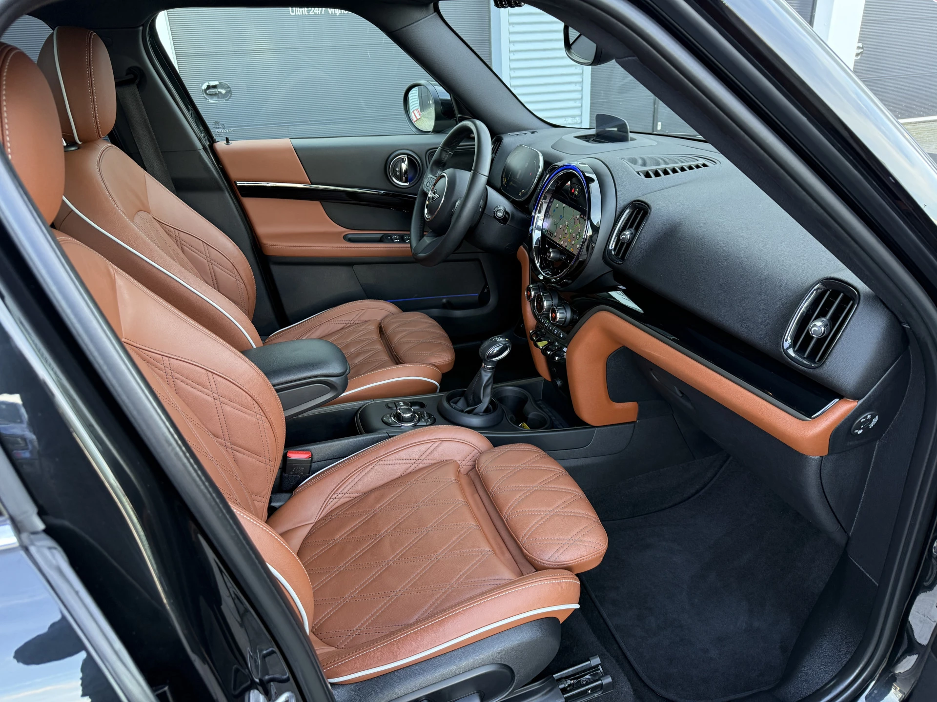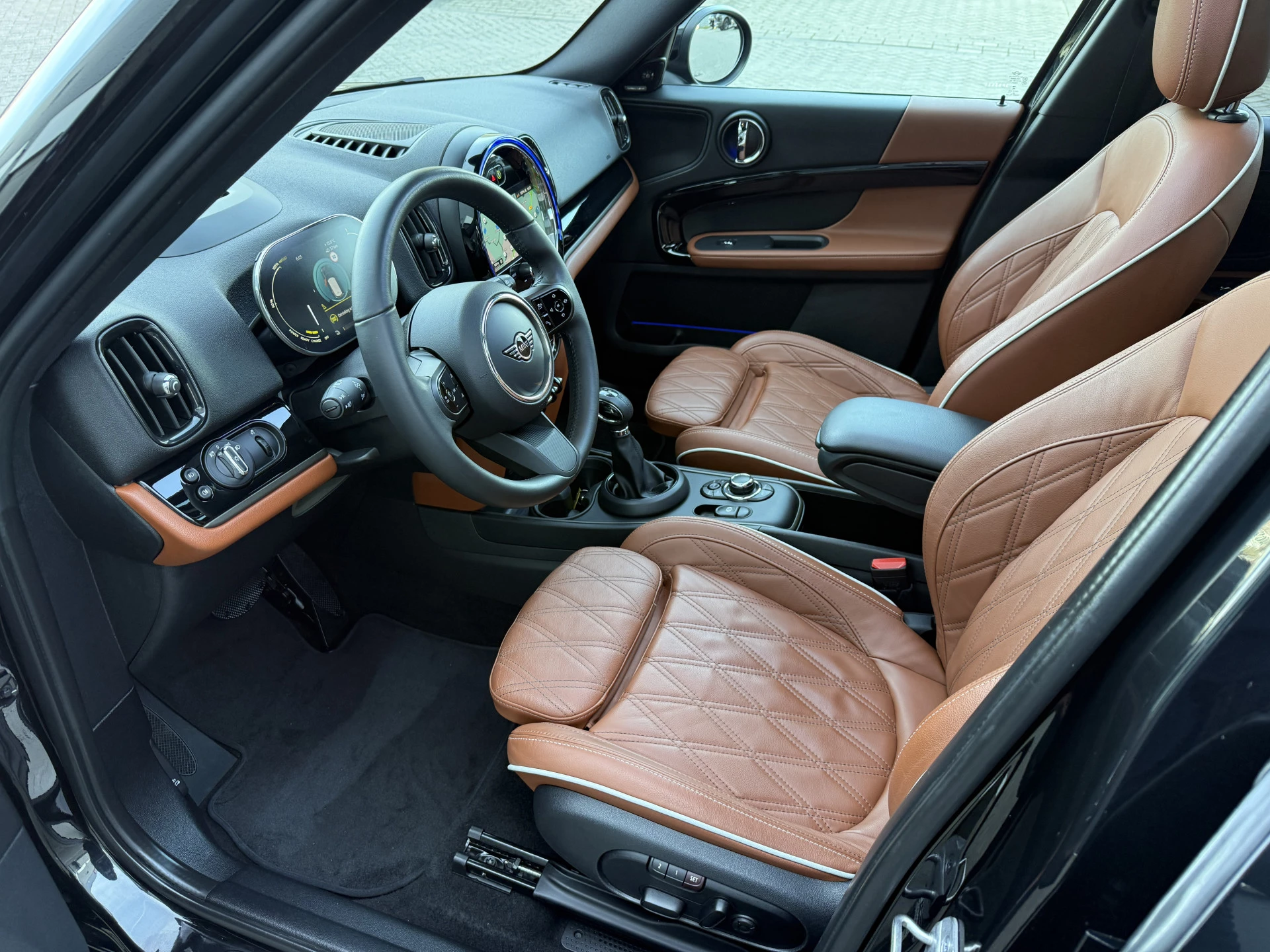 Schitterende Mini Countryman 2.0 Cooper SE ALL4 Plug in Hybrid in Midnight Black metallic met hoogglans zwarte licht metalen velgen en Black Optic pakket. Deze Mini is bijzonder compleet uitgerust met onder andere de volgende opties: Panorama dak, elektrische bedienbare voorstoelen met memory, Chester Malt lederen bekleding, Harman Kardon Audio, LED interieur sfeer verlichtingspakket, Apple Carplay, achteruitrijcamera, navigatie, virtuele cockpit, Head Up display, adaptieve cruise control, keyless entry, parkeersensoren voor + achter met parkeer assistent, etc..