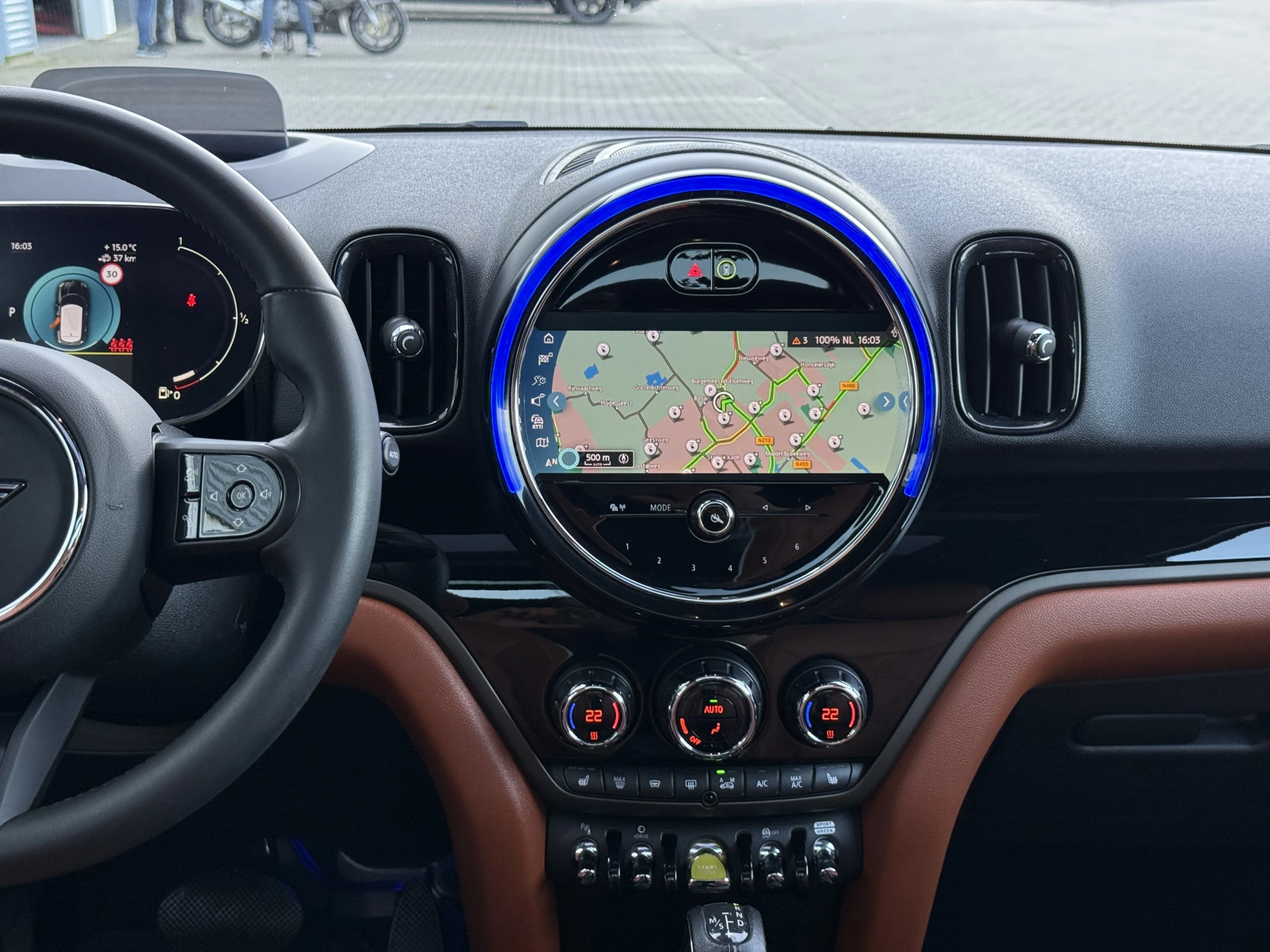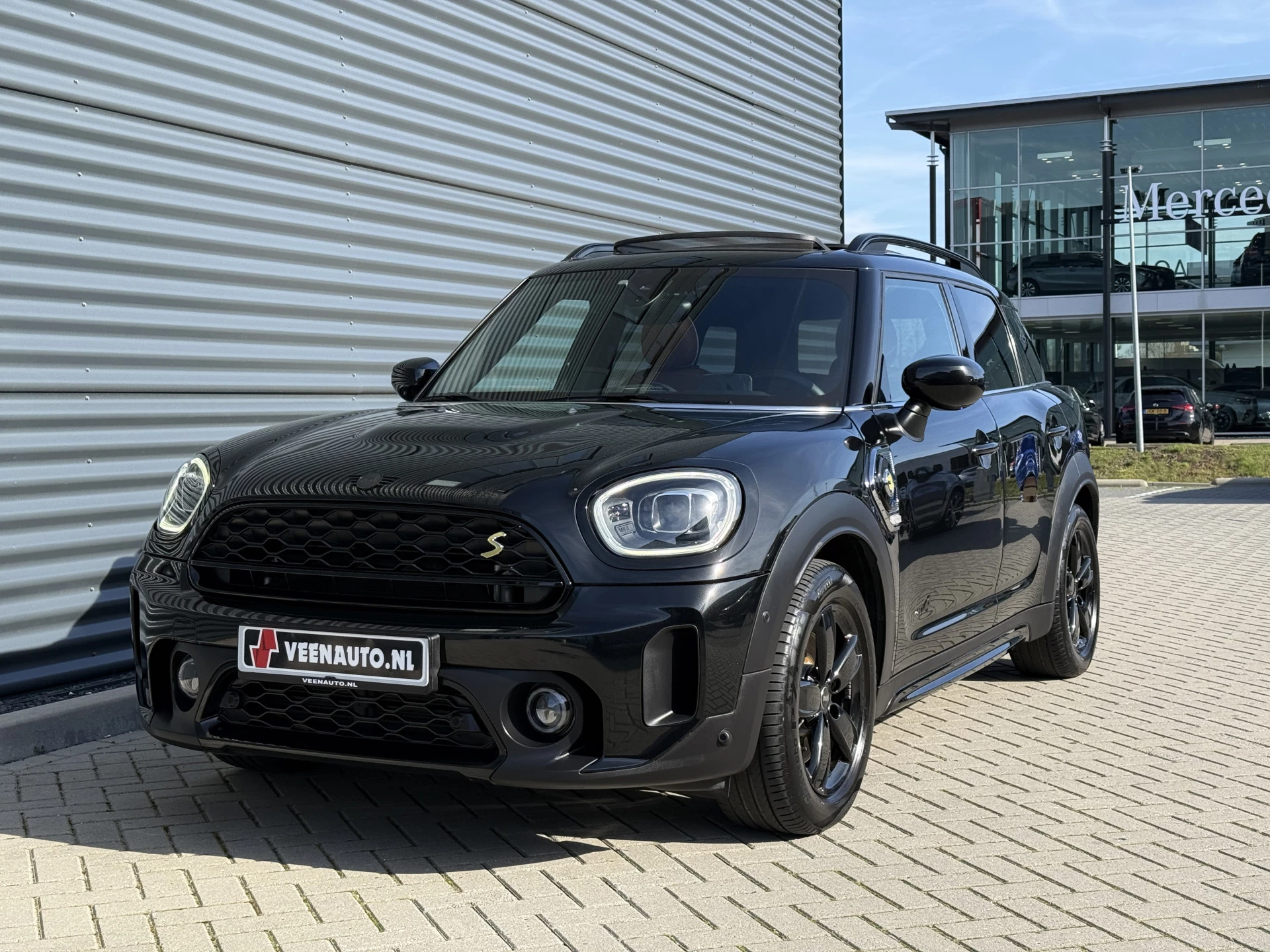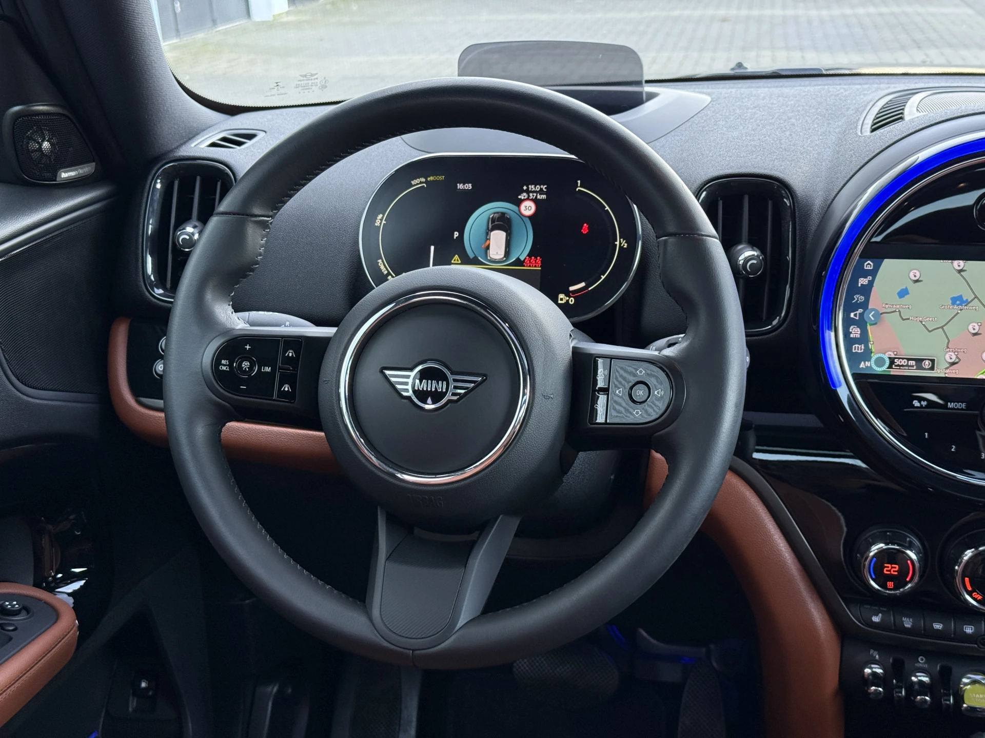 Schitterende Mini Countryman 2.0 Cooper SE ALL4 Plug in Hybrid in Midnight Black metallic met hoogglans zwarte licht metalen velgen en Black Optic pakket. Deze Mini is bijzonder compleet uitgerust met onder andere de volgende opties: Panorama dak, elektrische bedienbare voorstoelen met memory, Chester Malt lederen bekleding, Harman Kardon Audio, LED interieur sfeer verlichtingspakket, Apple Carplay, achteruitrijcamera, navigatie, virtuele cockpit, Head Up display, adaptieve cruise control, keyless entry, parkeersensoren voor + achter met parkeer assistent, etc..