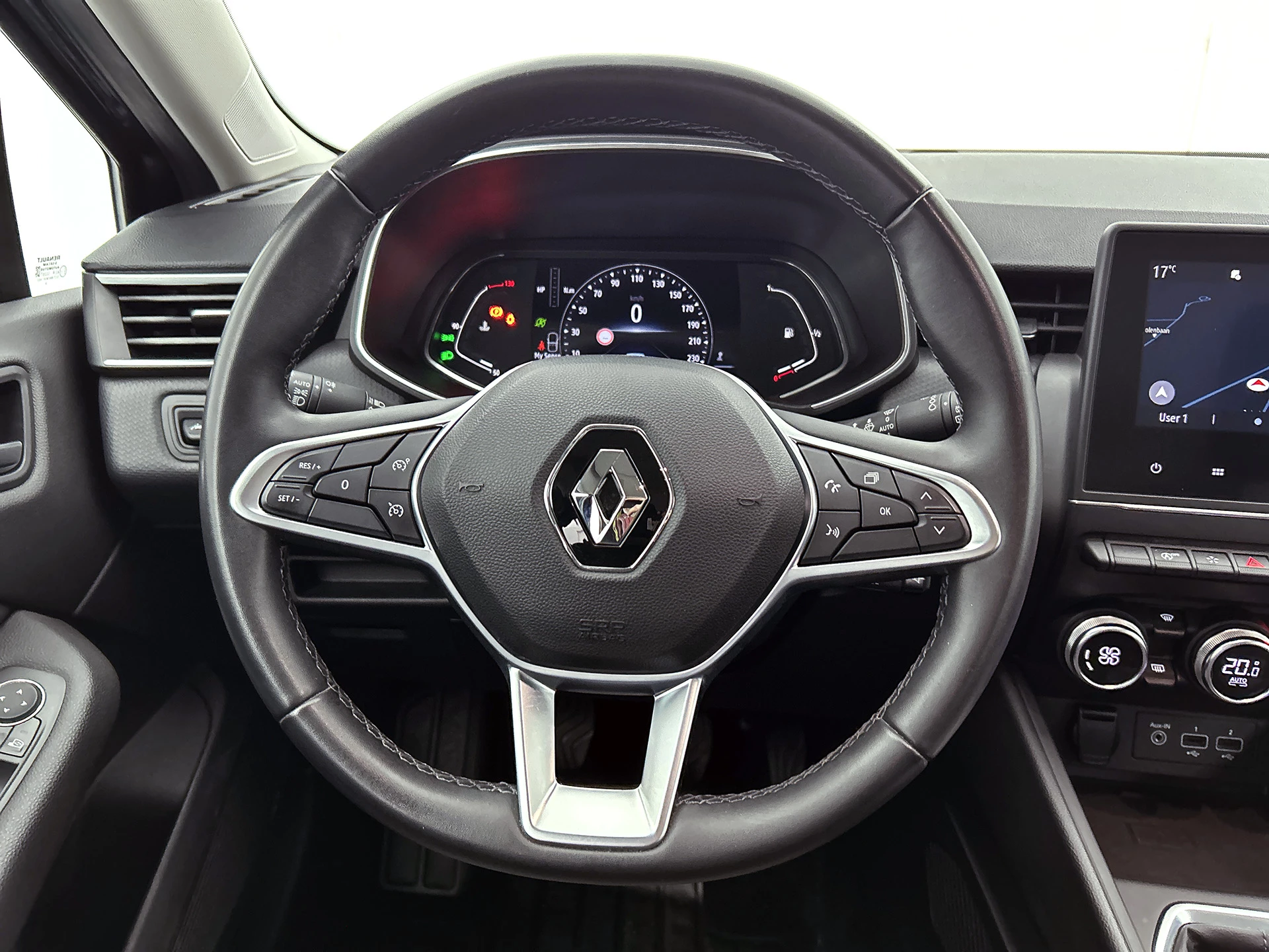 U kunt tijdens de rit uw ogen steeds op de weg houden, want het audio-installatiesysteem (met dab!) en het full map navigatiesysteem kunt u bedienen vanaf het stuur. Tot de standaard uitrusting van deze auto hoort ook automatische airconditioning. Parkeersensoren zijn een handig hulpmiddel om parkeerschades te voorkomen. Het hoort bij een intelligente auto als deze dat hij zelf in staat is om zijn omgeving in de gaten te houden. Dat doet deze Renault met een automatisch inschakelbare verlichting en een regensensor. De cruise control betekent gemak, comfort en zuinig rijden. Natuurlijk behoren keyless entry, lederen stuur, isofix-aansluiting, usb-aansluiting, centrale deurvergrendeling met afstandsbediening en boordcomputer ook tot de uitrusting van deze complete auto.