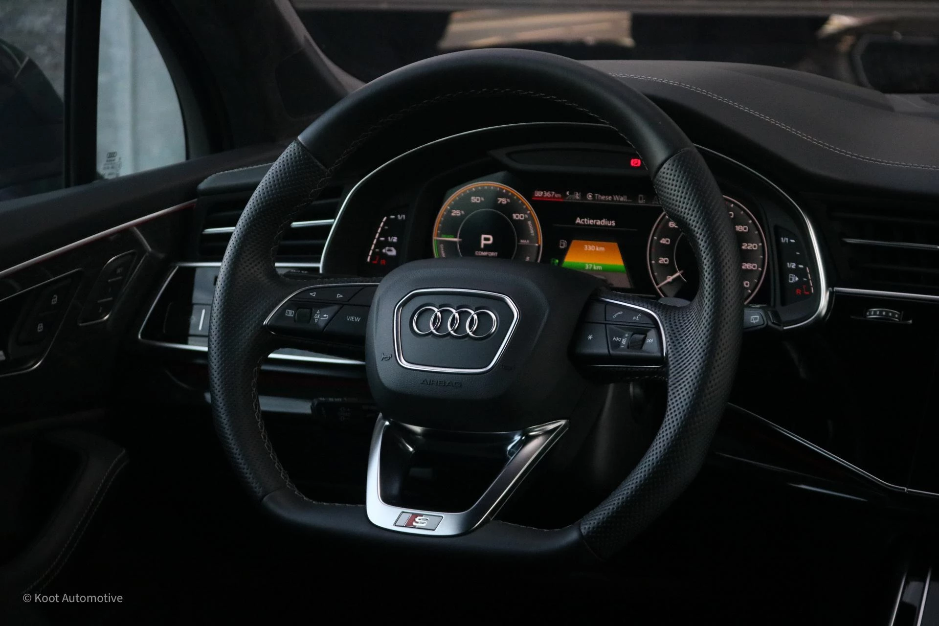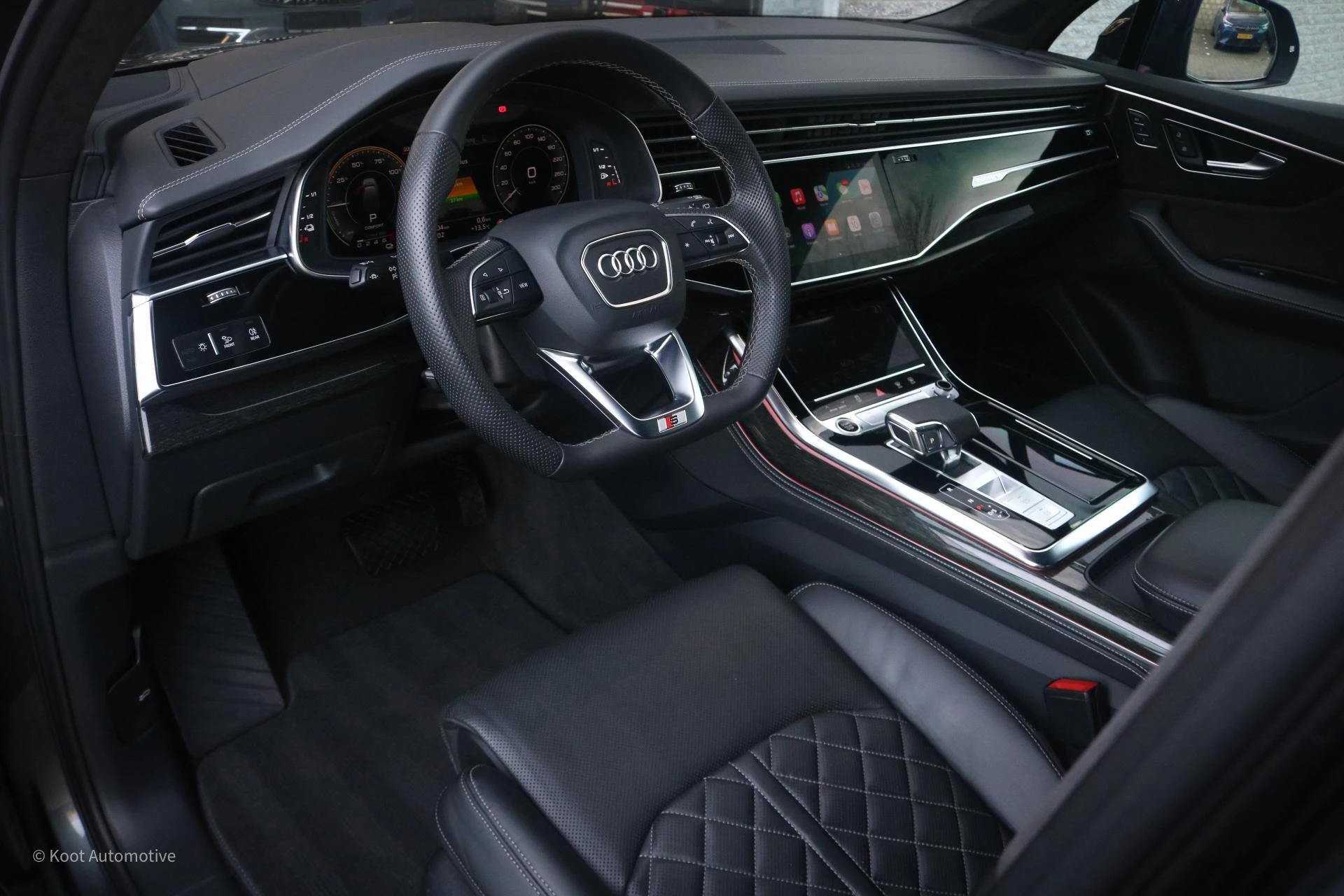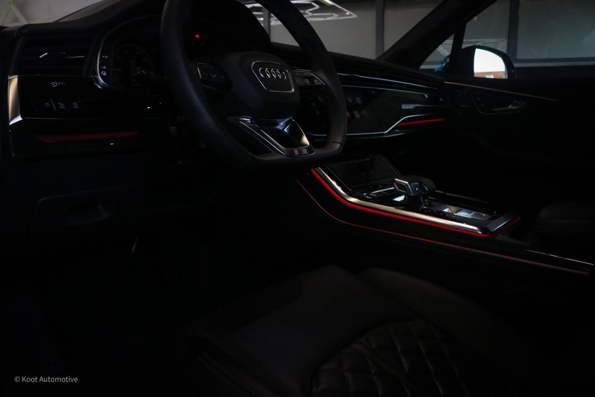 Het interieur is hoogwaardig afgewerkt met Valcona lederen S line sportstoelen met diamantstiksel, zwarte Alcantara hemelbekleding en subtiele aluminium accenten. De voorstoelen zijn uitgerust met stoelventilatie, stoelverwarming, massagefunctie en instelbare lendensteunen. Ook is de Q7 voorzien van verwarmde achterstoelen en een afgevlakt S line sportstuur. De combinatie van materialen en afwerking zorgt voor een rustige, luxe ambiance die past bij dit segment.