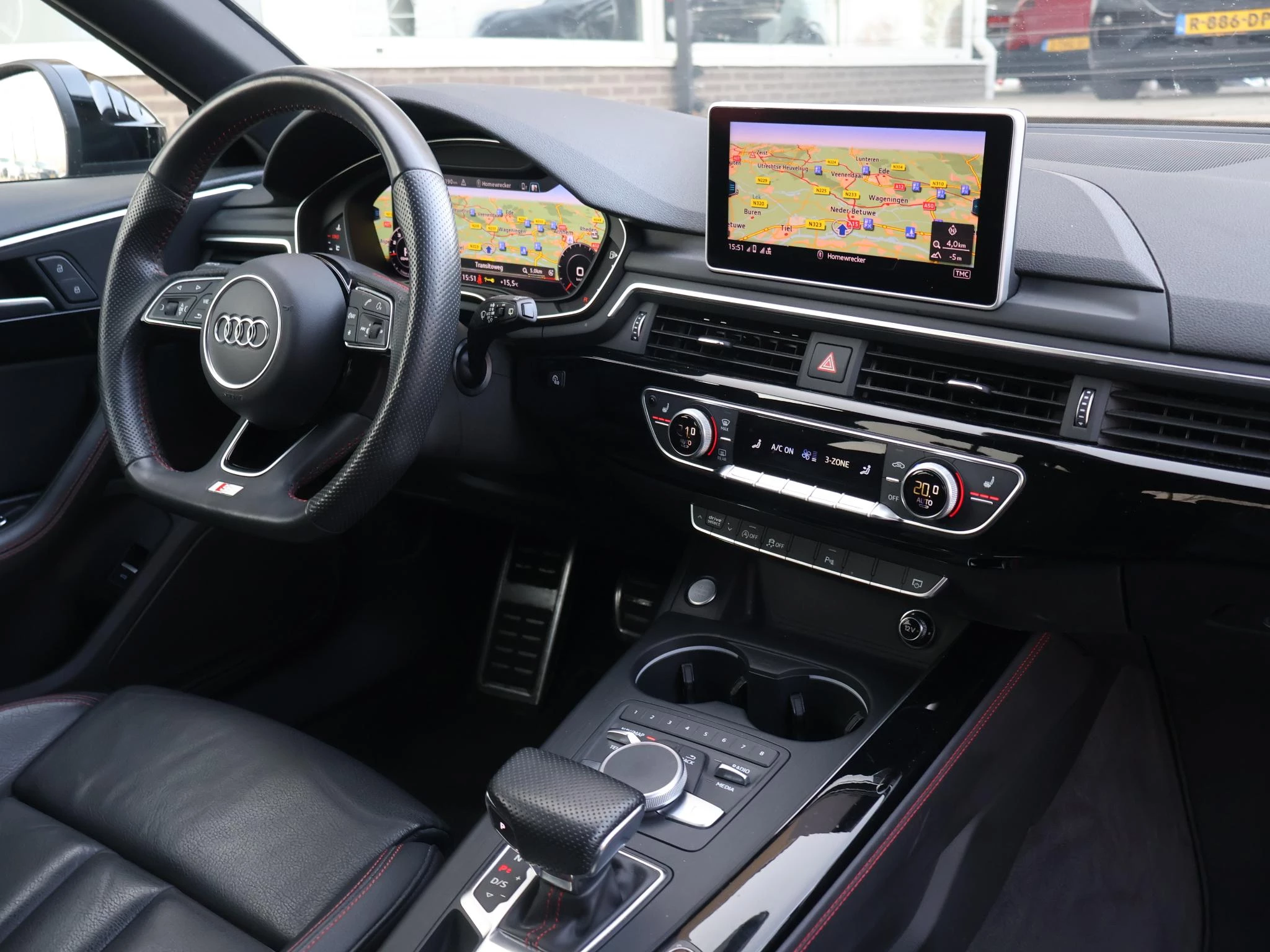 Origineel Nederlanse auto, A4 35 TFSI 1.5 150 PK Automaat, Sport S Line Black Edition uitvoering in de topkleur Quantumgrijs met 20 inch lichtmetalen velgen, Zwart volledig leder sportinterieur met rood stiksel en verlengbaar zitvlak, Leder sportstuurwiel, Stoelverwarming, Zwarte hemelbekleding, Afneembare trekhaak, Privacy glass, Zwarte exterieurstyling, Virtual cockpit digitale cockpit met verschillende thema's en navigatie kaartweergave, 3-Zone Climate control met bediening achterin, Cruise control, Parkeersensoren voor en achter.