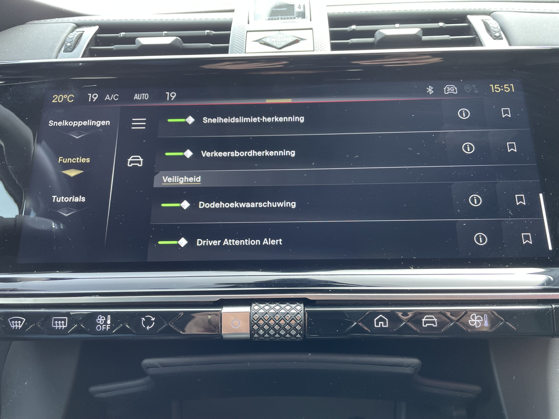 Aan boord van deze DS houden verschillende geavanceerde systemen voor u de weg in de gaten. Ze waarschuwen u voor noodsituaties en kunnen in een aantal gevallen ook zelf ingrijpen. Dat de auto steeds meer taken van de bestuurder overneemt, merkt u bijvoorbeeld aan het systeem voor verkeersbord-detectie in deze auto. Mooi binnen de lijnen van de rijstrook blijven? Het Lane-keeping systeem helpt altijd een handje. Forward collision warning waarschuwt bij een dreigende aanrijding en vermindert de gevolgen van een ongeval. Ook helpen het dodehoekdetectie, hill hold functie, vermoeidheidsherkenning, autonoom remsysteem en bandenspanningcontrolesysteem, uw rit tot een veilige rit te maken.