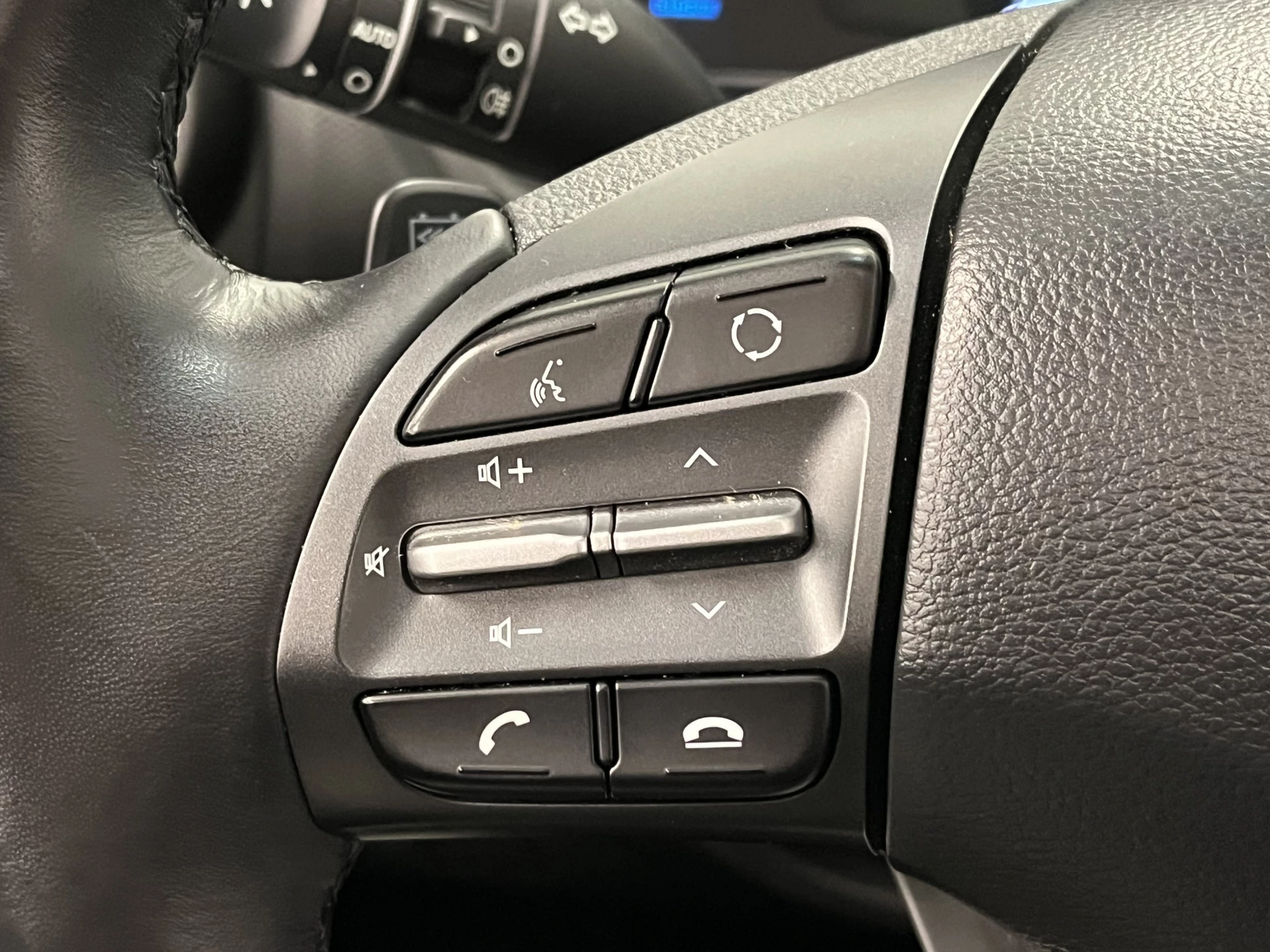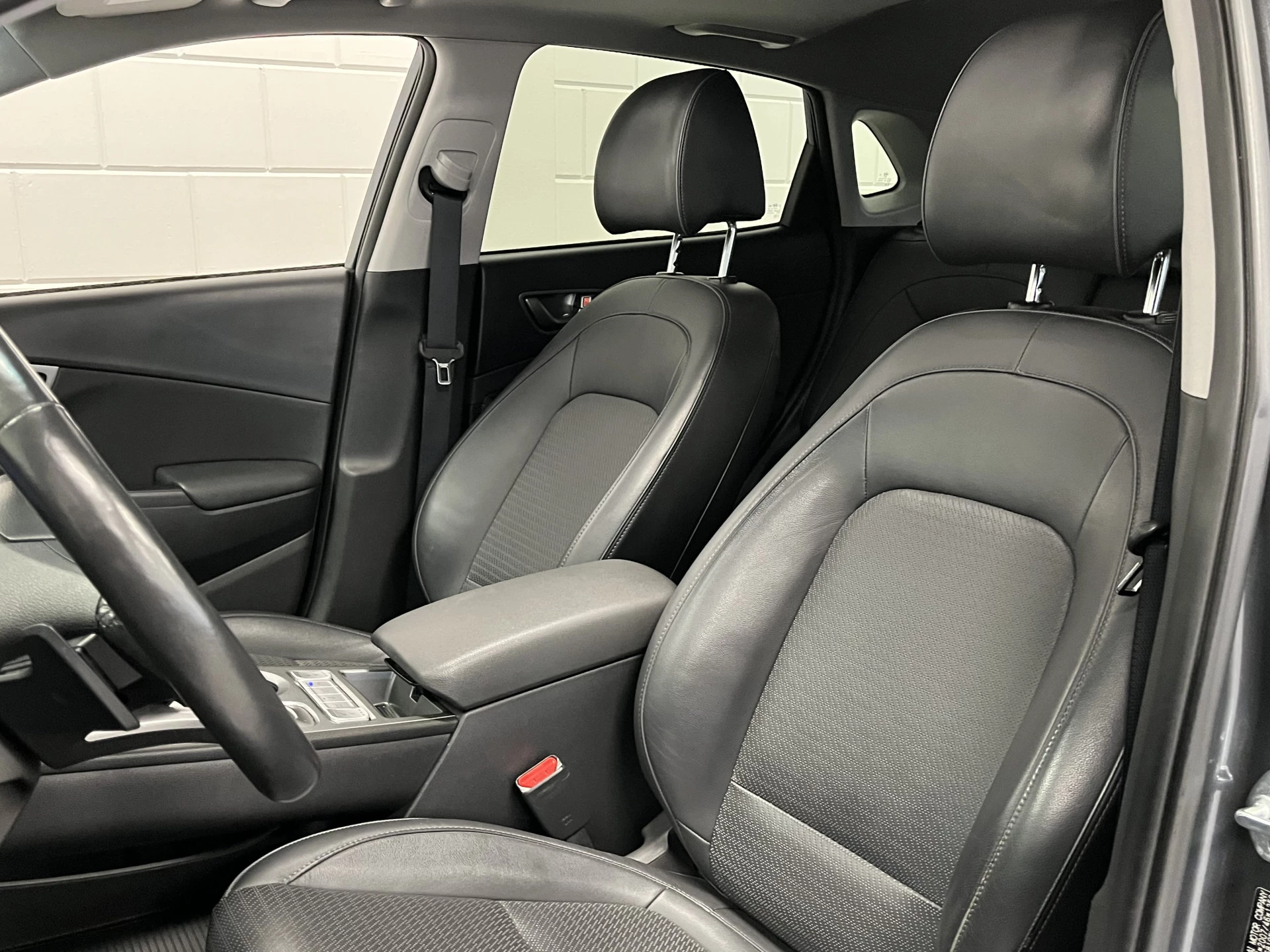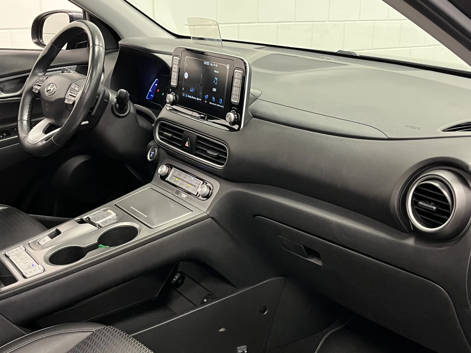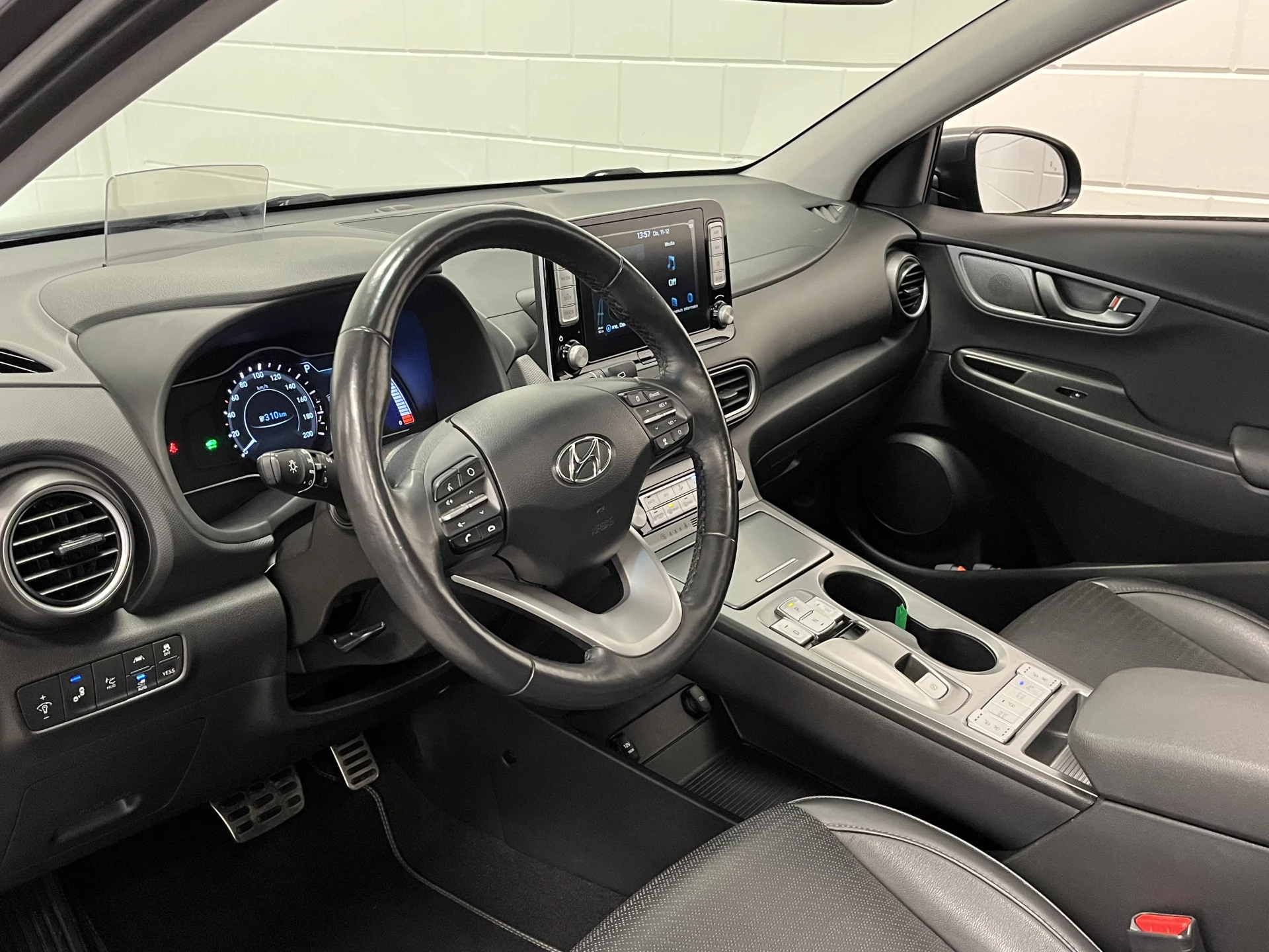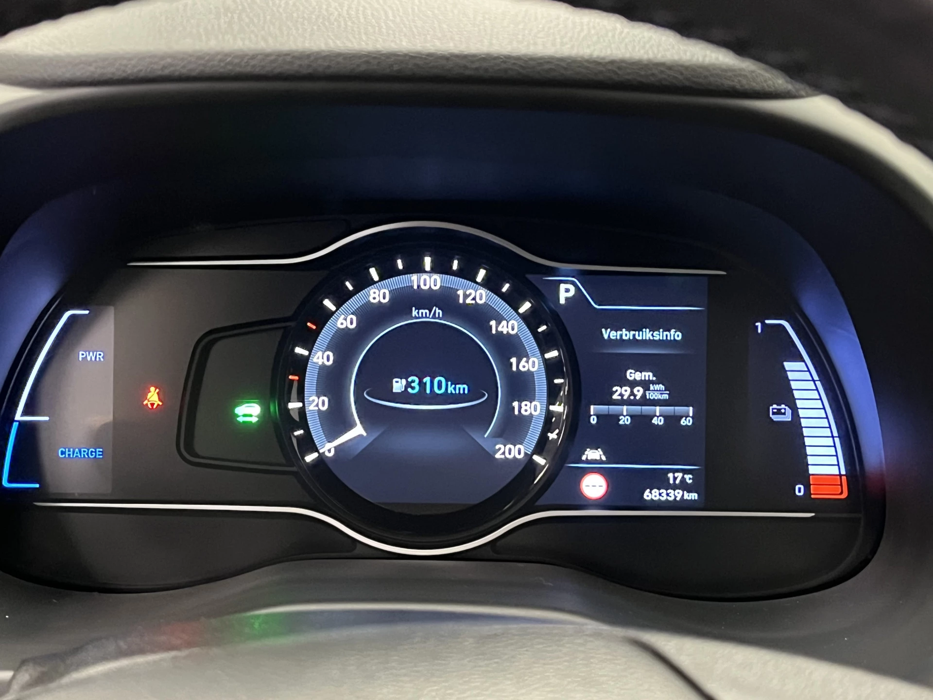Zoals je mag verwachten van deze Hyundai Kona is hij uitgerust met een reeks aan actieve veiligheidssystemen. In het instrumentarium laat de verkeersborddetectie de actuele verkeersborden zien. Het Lane-keeping systeem zorgt voor een automatisch constante positie binnen de rijstrook. Afdwalen is uitgesloten. Forward collision warning waarschuwt voor een kop-staart botsing. In deze Hyundai vinden we verder een head-up display, dodehoekdetectie, hill hold functie, vermoeidheidsherkenning, autonoom remsysteem en bandenspanningcontrolesysteem.