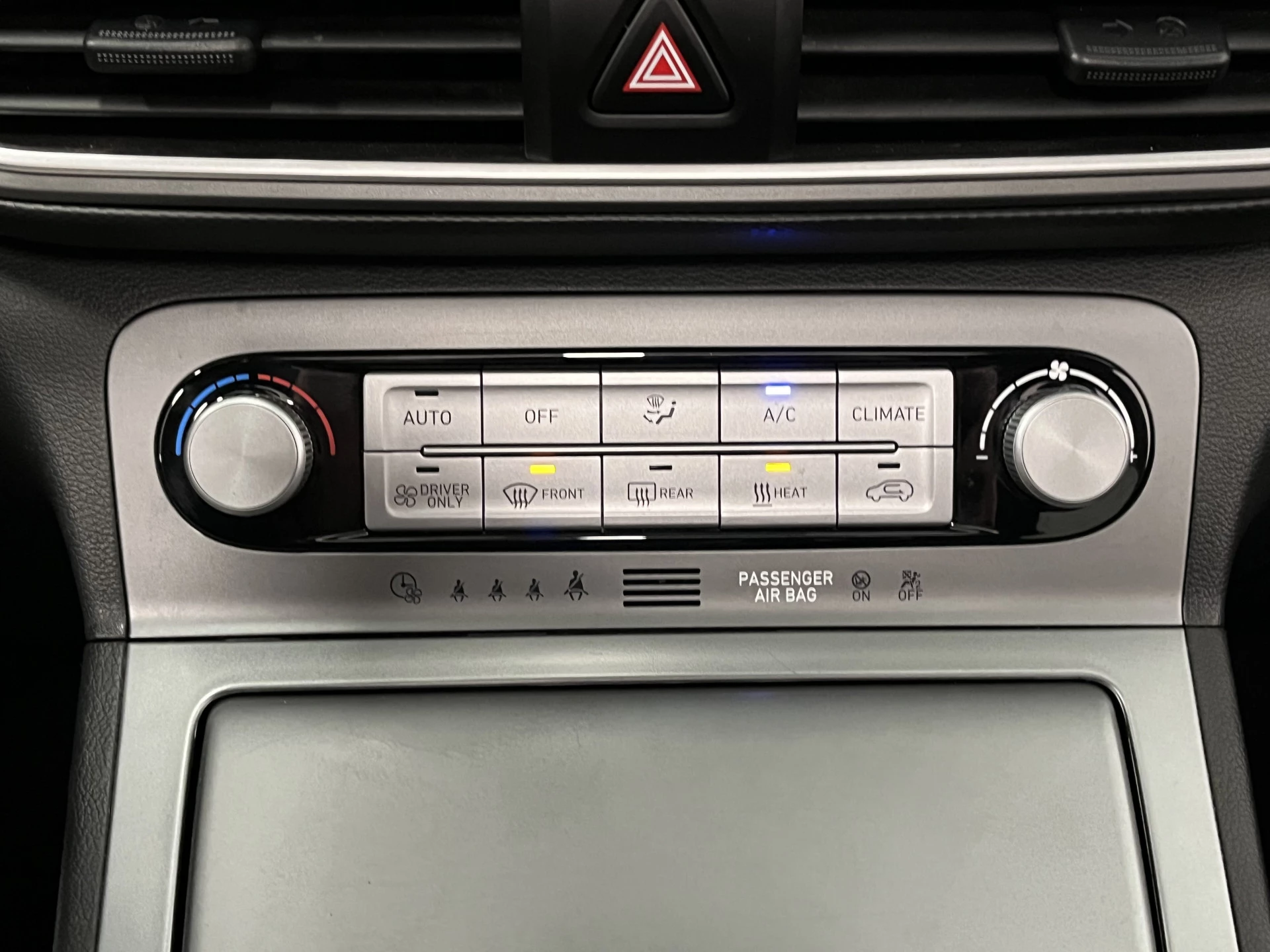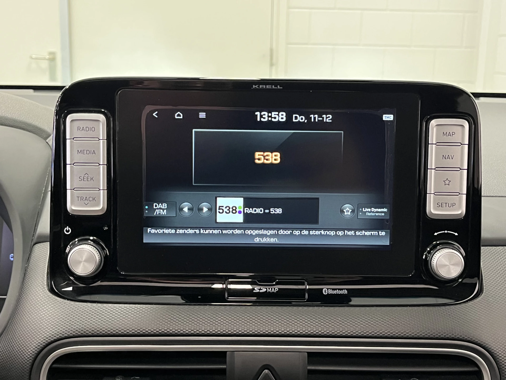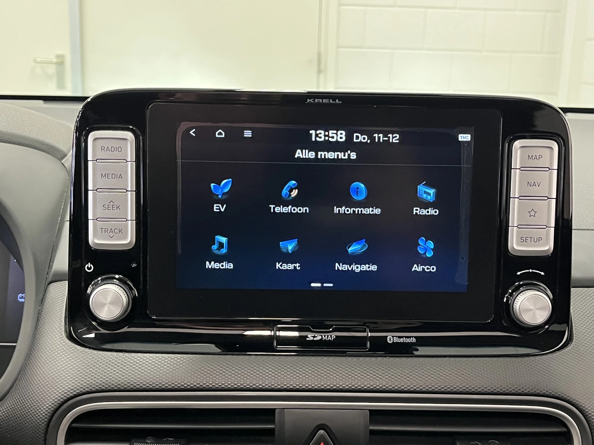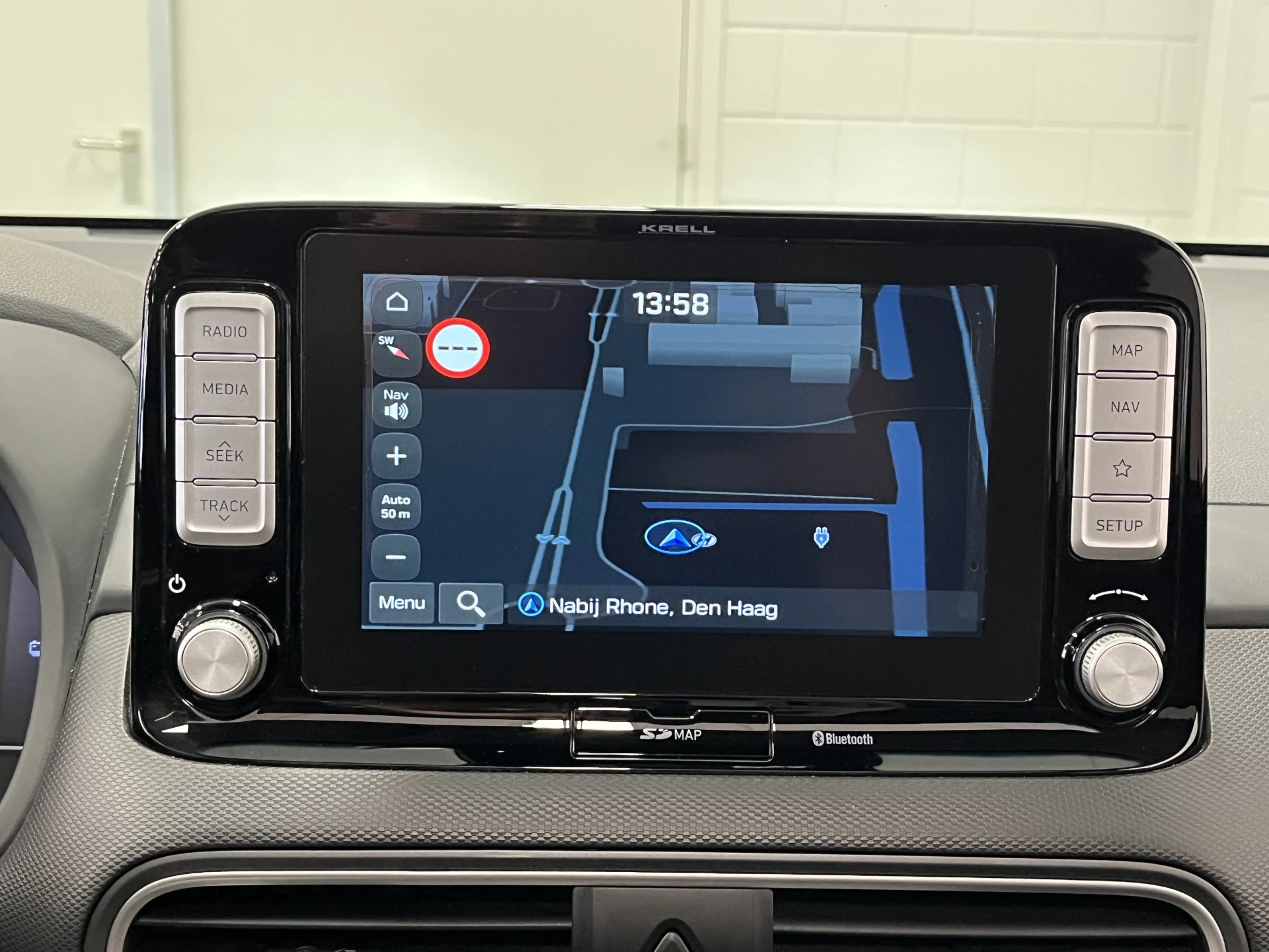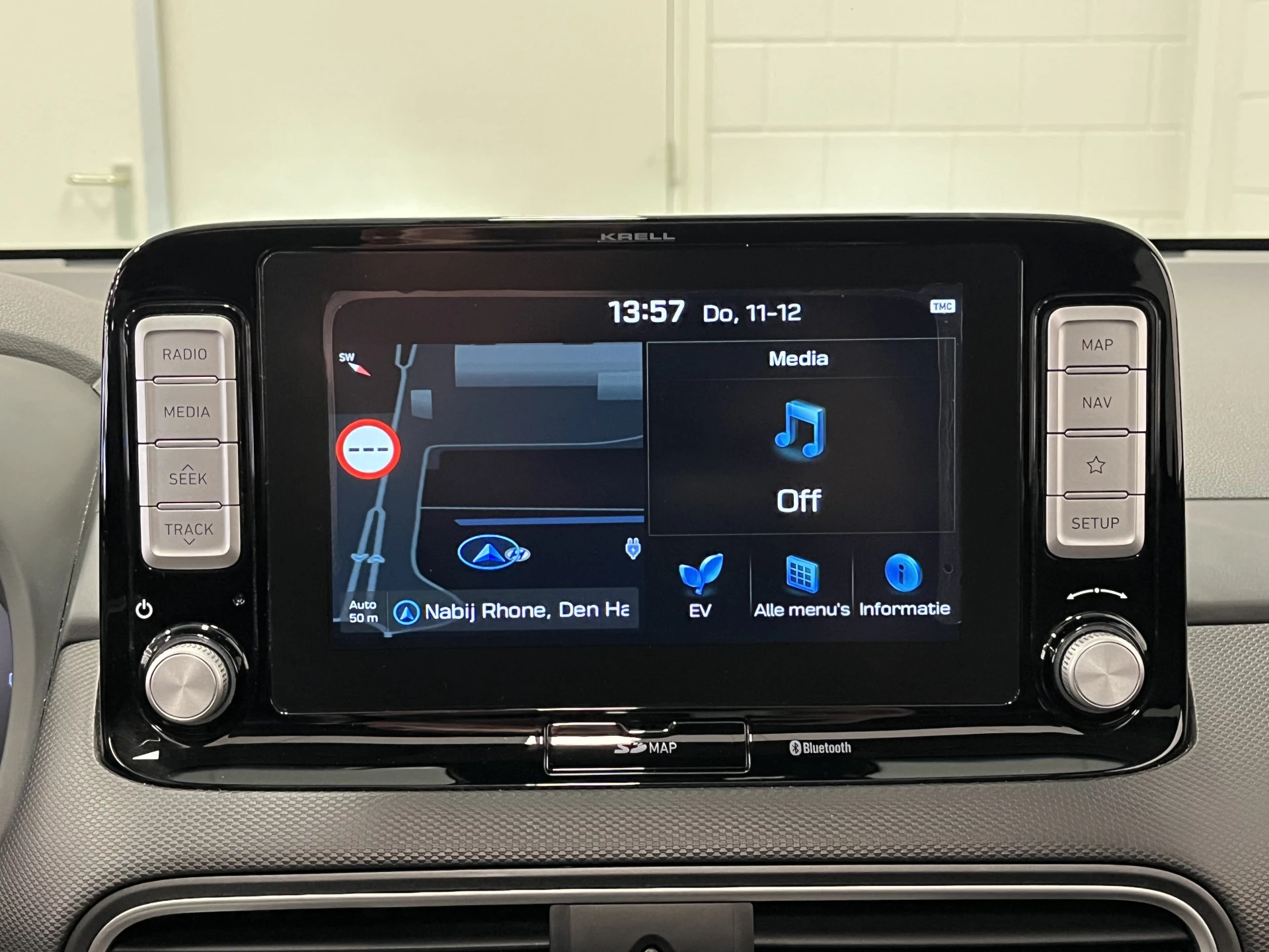 Zoals je mag verwachten van deze Hyundai Kona is hij uitgerust met een reeks aan actieve veiligheidssystemen. In het instrumentarium laat de verkeersborddetectie de actuele verkeersborden zien. Het Lane-keeping systeem zorgt voor een automatisch constante positie binnen de rijstrook. Afdwalen is uitgesloten. Forward collision warning waarschuwt voor een kop-staart botsing. In deze Hyundai vinden we verder een head-up display, dodehoekdetectie, hill hold functie, vermoeidheidsherkenning, autonoom remsysteem en bandenspanningcontrolesysteem.