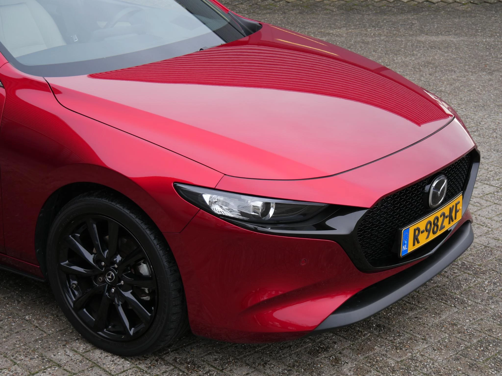 Dit exemplaar is gespoten in de echte Mazda kleur. Deze Premium kleur 'Soul Red Crystal Metallic' is de perfect match voor de Mazda 3. De 18inch grote zwarte velgen maken het plaatje helemaal af.