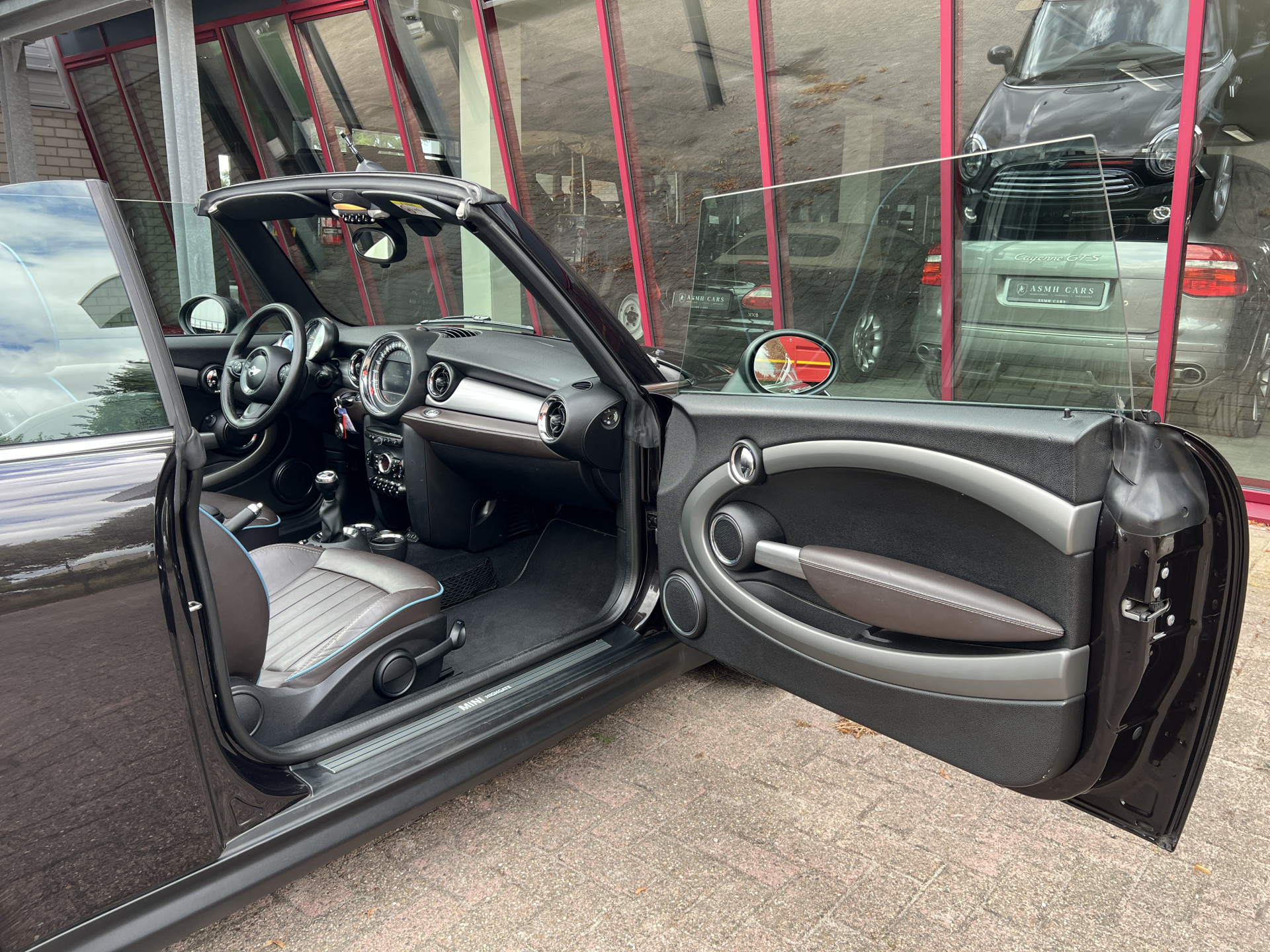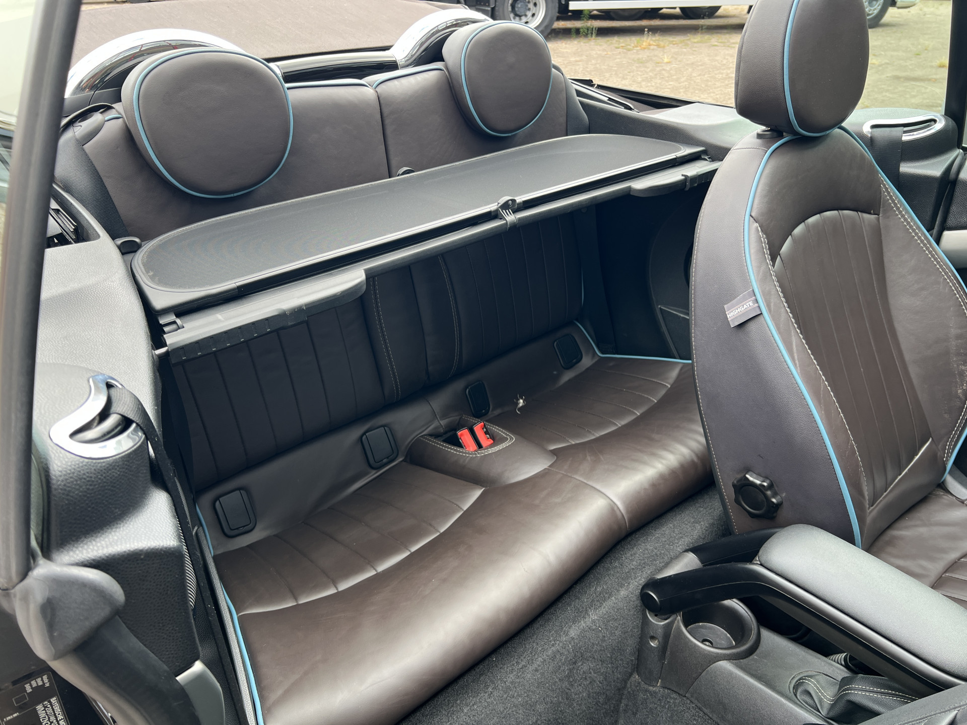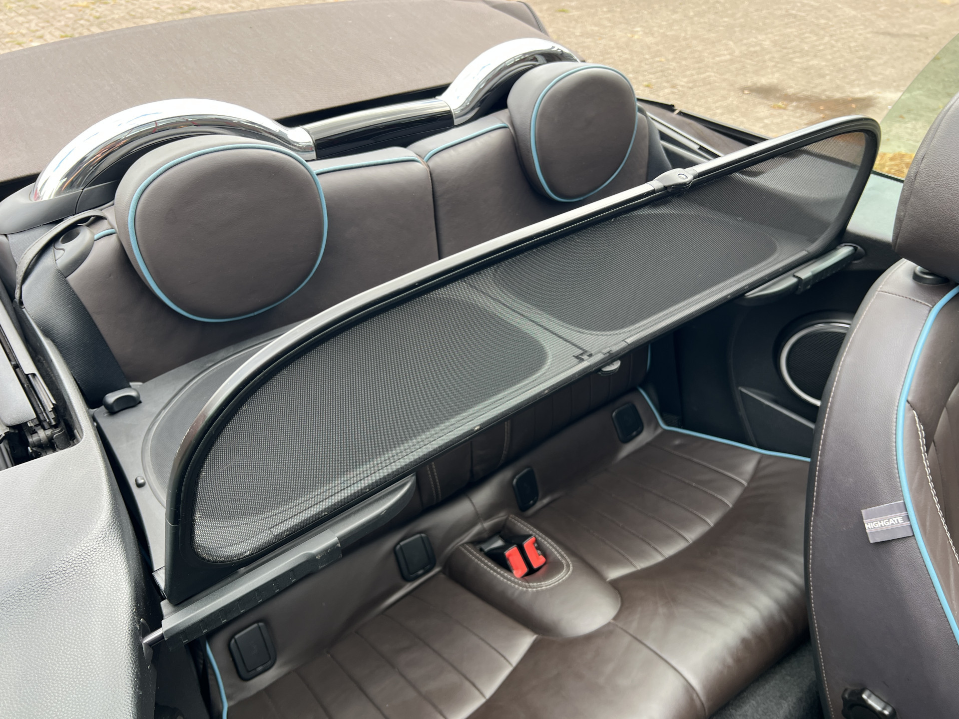 Super leuke Mini Cooper Cabrio in de exclusieve Highgate uitvoering met een mooie kleurstelling van Iced Chocolate metallic lak met een Dark Truffle lederen interieur.
