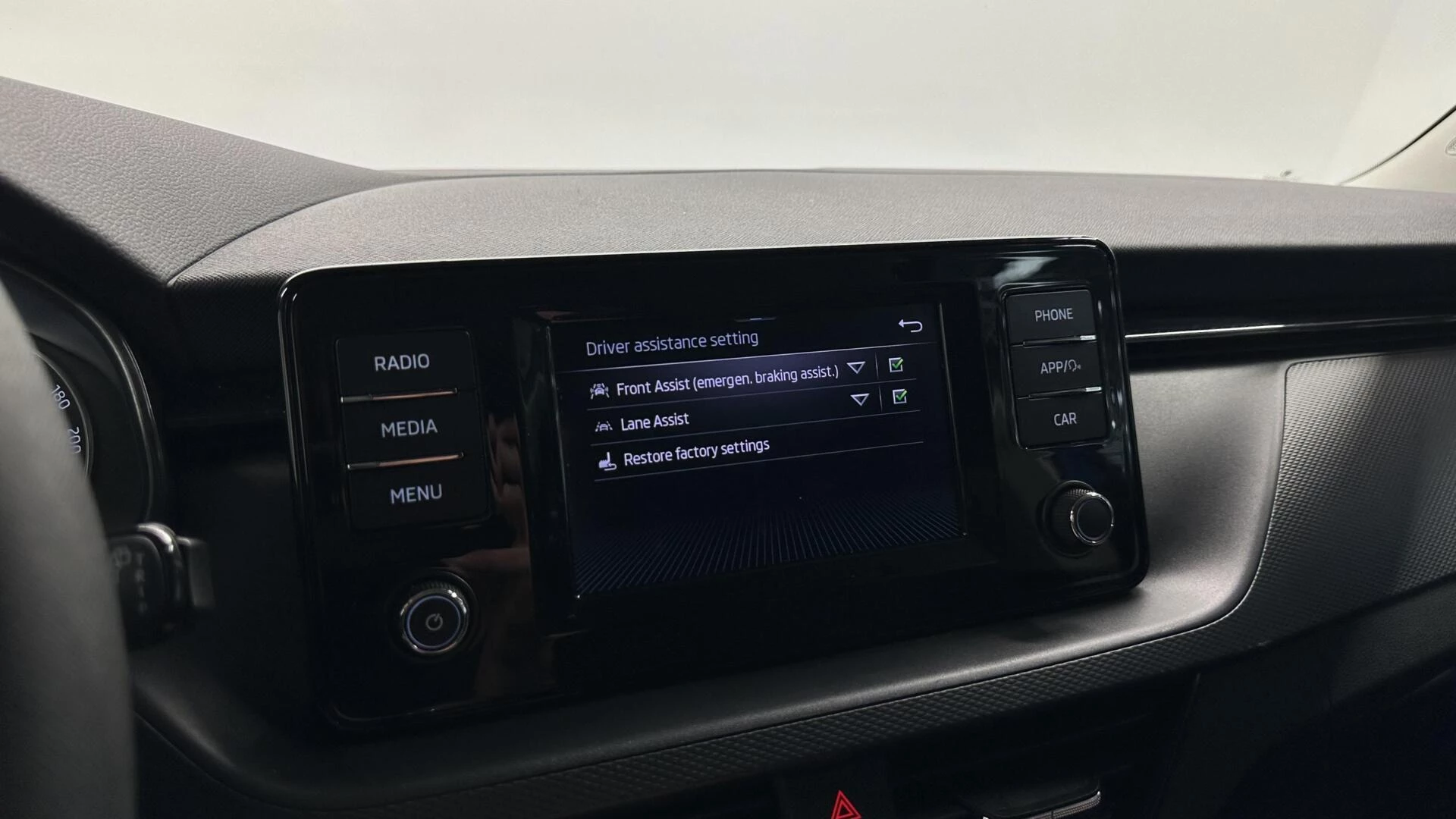 Pragmatisch en veilig als deze auto is, beschikt hij over diverse veiligheidssystemen. Het Lane-keeping systeem registreert permanent of u binnen de lijnen van de rijstrook blijft; dwaalt u onbedoeld af, dan waarschuwt het systeem en corrigeert de koers. In een noodsituatie waarschuwt forward collision warning bij een dreigende aanrijding met een voorligger. In deze Skoda vinden we verder een autonoom remsysteem en bandenspanningcontrolesysteem.