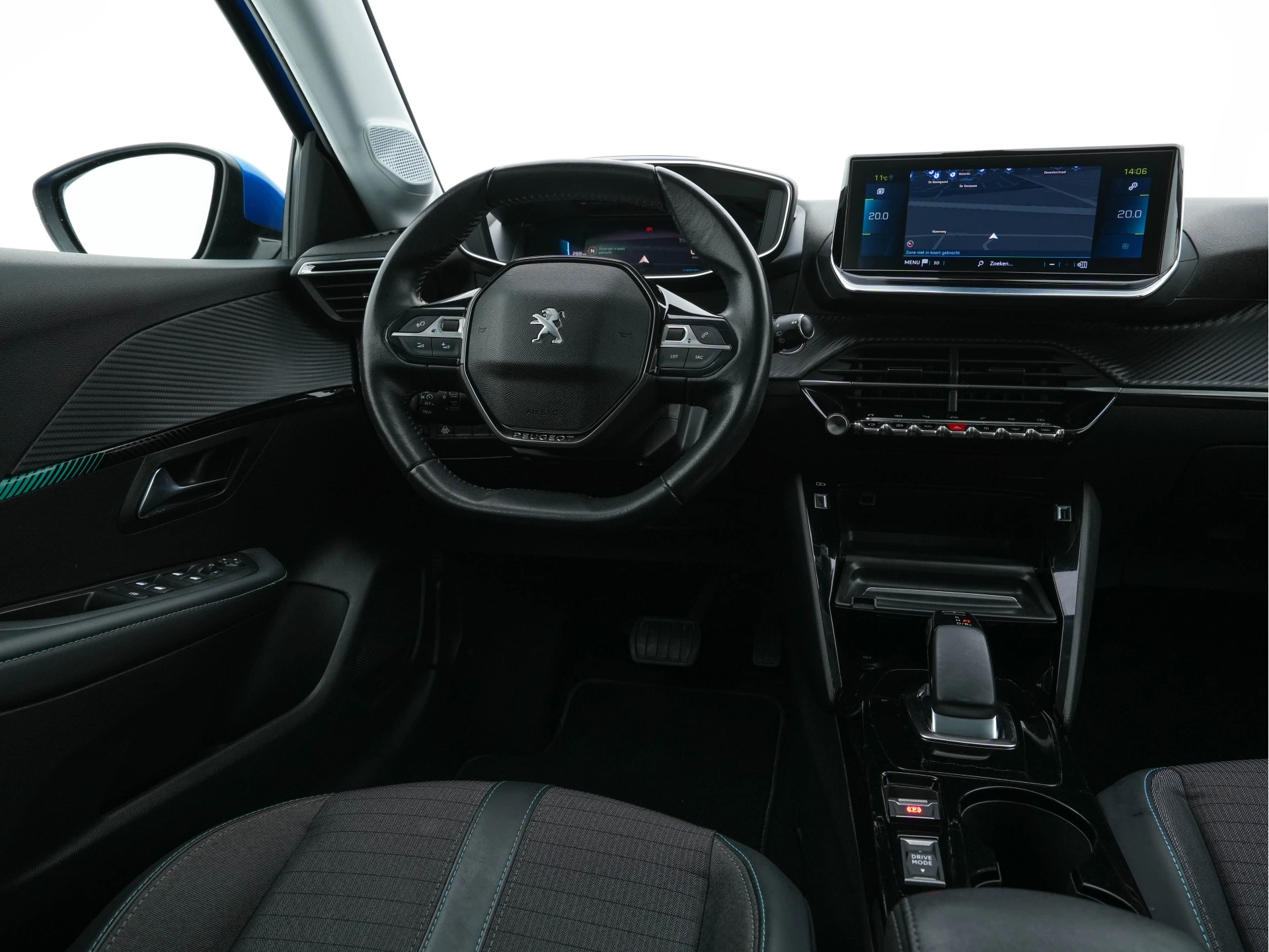 ⭐ Peugeot e-208 Allure 50 kWh Automaat – in Blue Vertigo met Stof/Leder “Cozy” zwart Interieur met mintkleurige stiksels | 100% Elektrisch | Modern, Luxe & Efficiënt