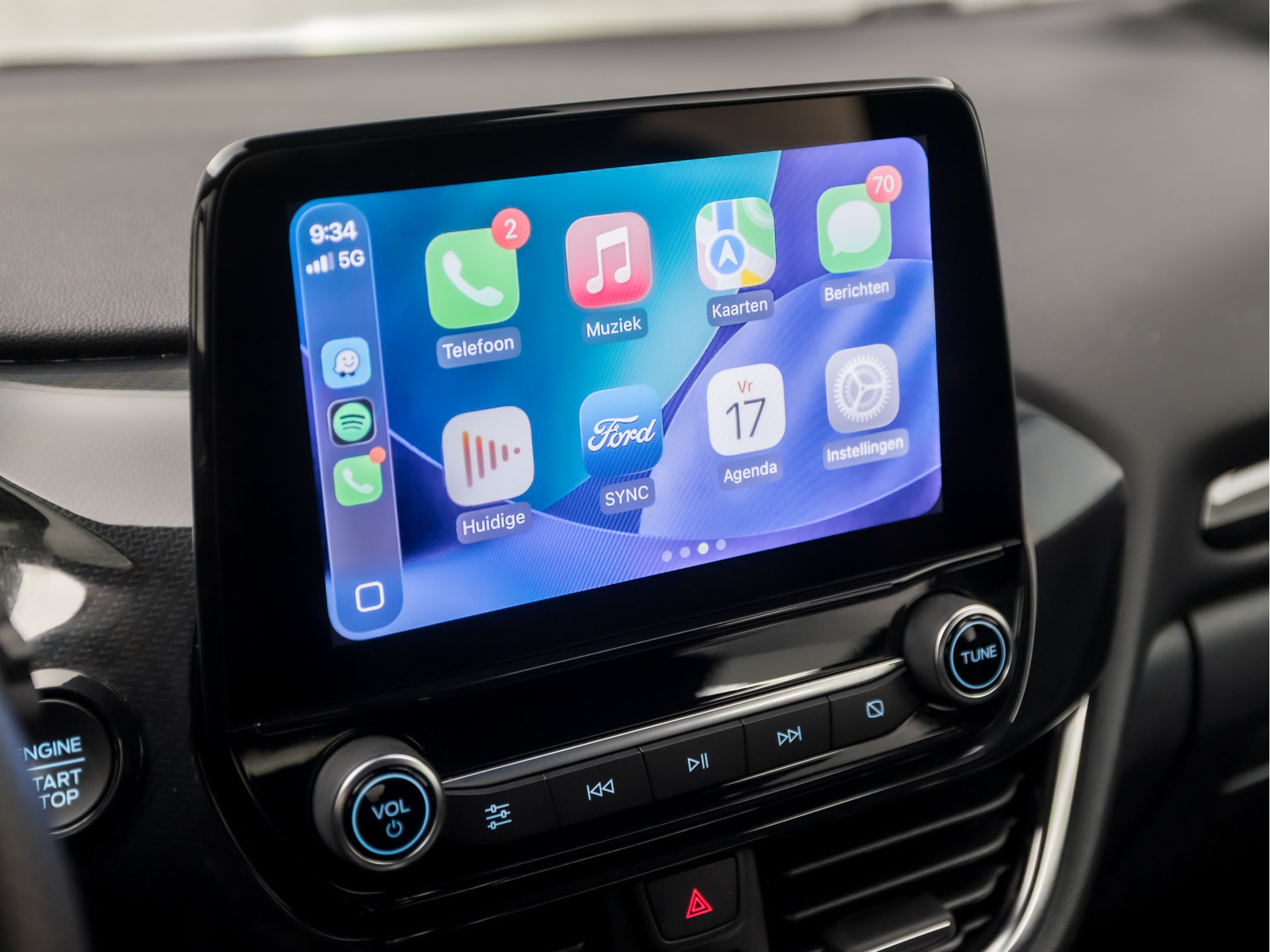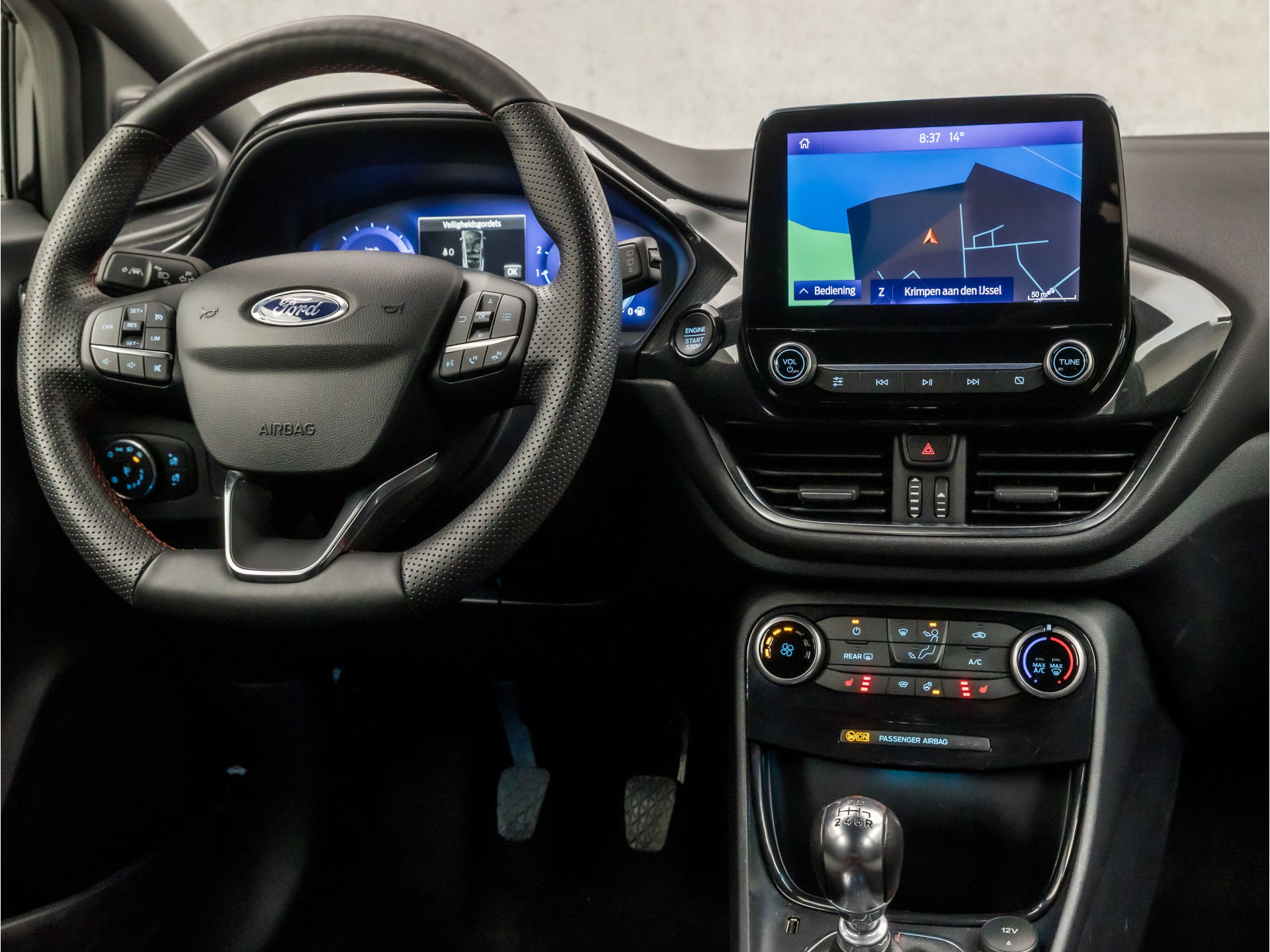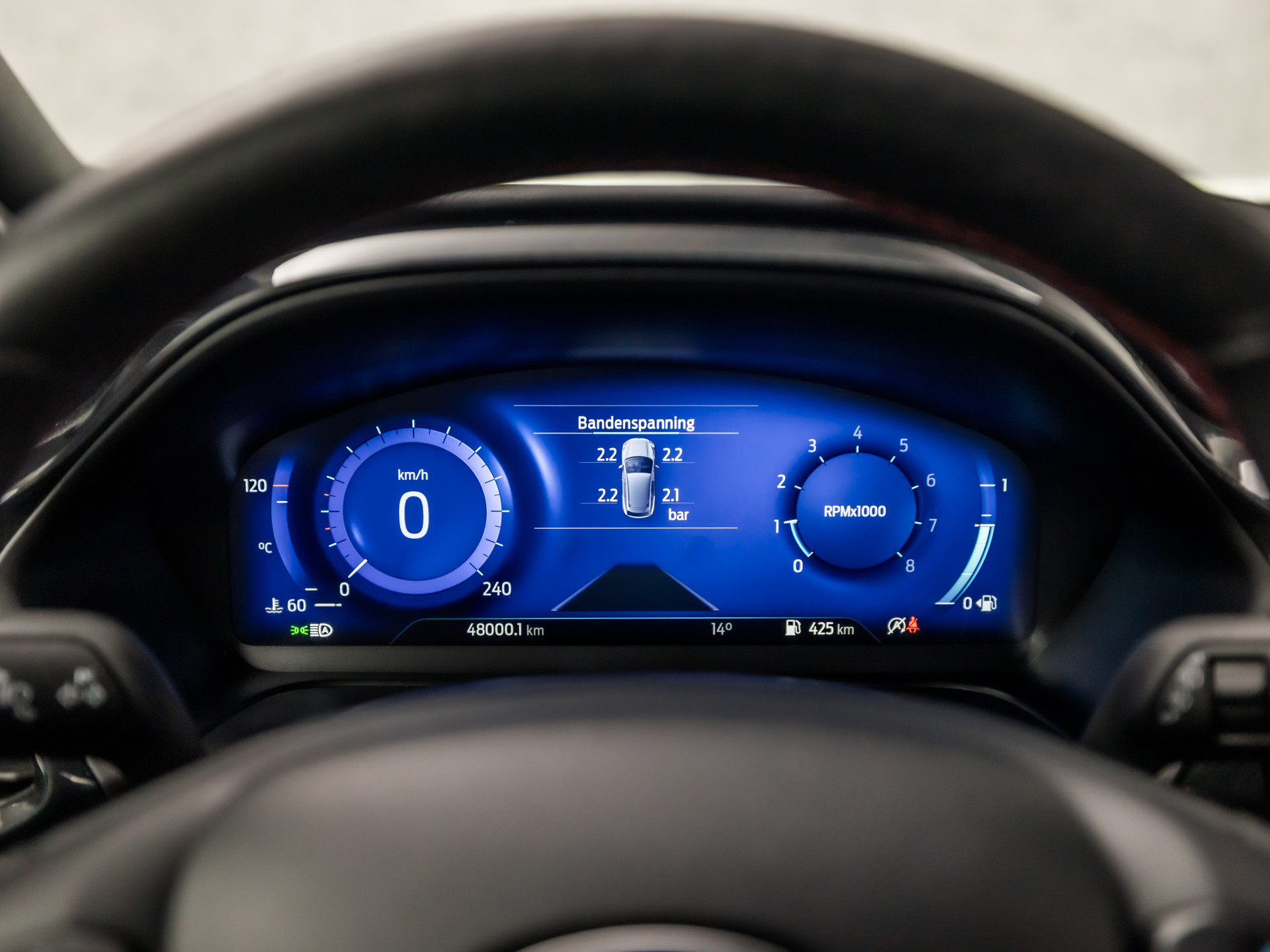 Het digitale dashboard ondersteunt u voortdurend met actuele, bruikbare informatie. In het zeldzame geval van een storing weet u nog eerder dan de monteur wat er mankeert. Uw smartphone met remote services geeft direct inzicht. U kunt tijdens de rit uw ogen steeds op de weg houden, want het audio-installatiesysteem (met DAB!) en het navigatiesysteem kunt u bedienen vanaf het stuur of met spraak. Gedoe met kabels en stekkers in de sigarettenaansteker is voorbij. De aanwezige draadloze oplaadmogelijkheid voor telefoons zorgt voor wireless recharging van uw smartphone. Op een drukke weg heeft u soms ogen in uw achterhoofd nodig. De sensoren aan de achterzijde nemen die functie over en geven een achteropkomend verkeer waarschuwing als een achterligger te dicht op u zit. De uitrusting van deze Ford is met dual zone automatische airconditioning, parkeersensoren voor en achter, regensensor, cruise control met snelheidsbegrenzer, keyless entry en automatisch dimmende binnenspiegel behoorlijk compleet.