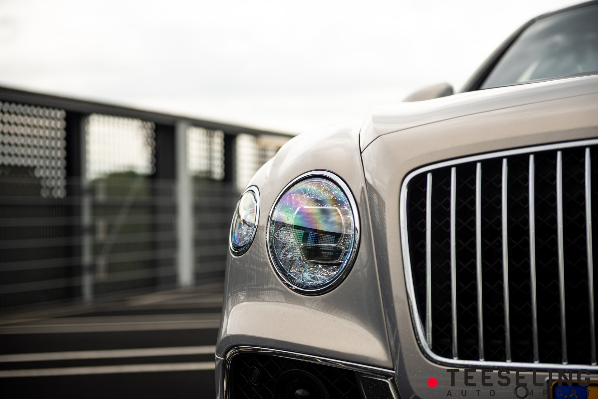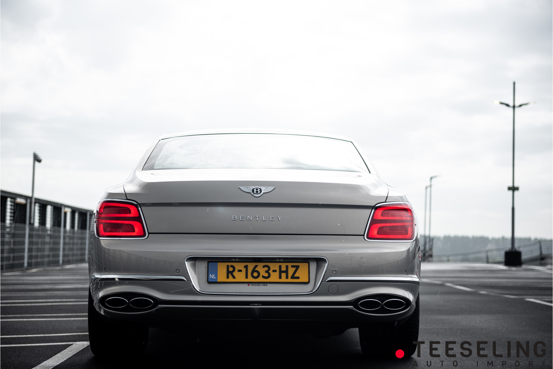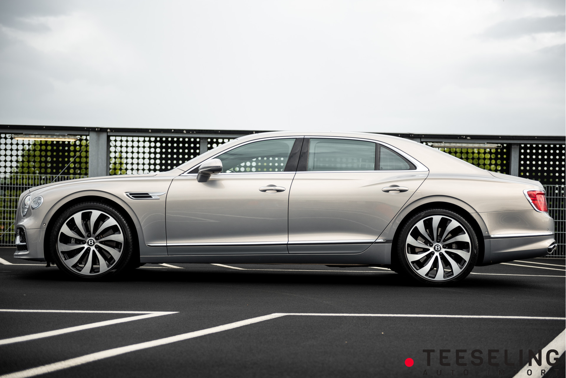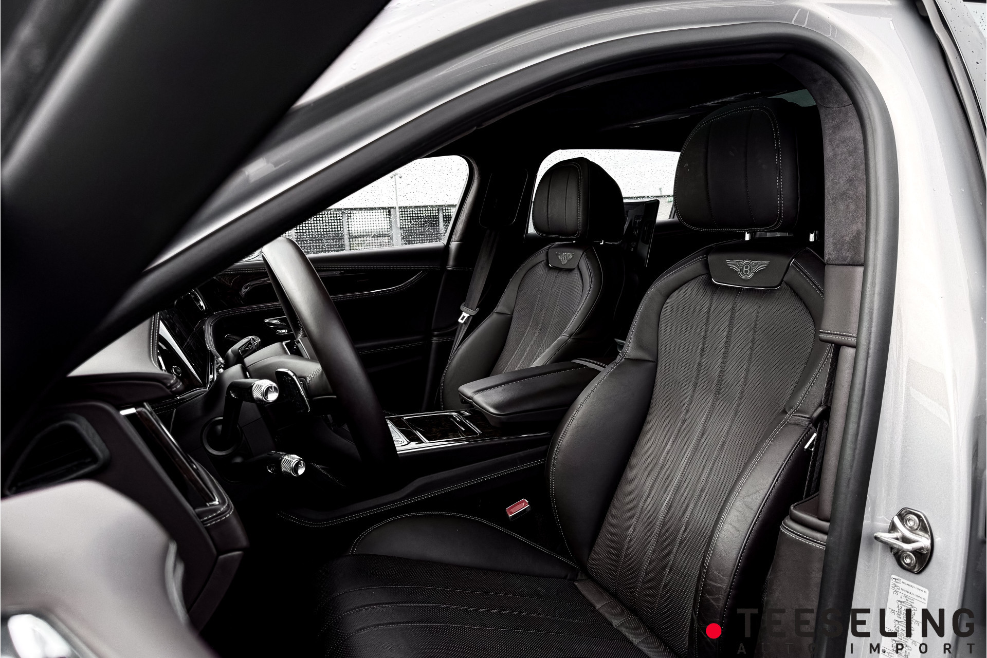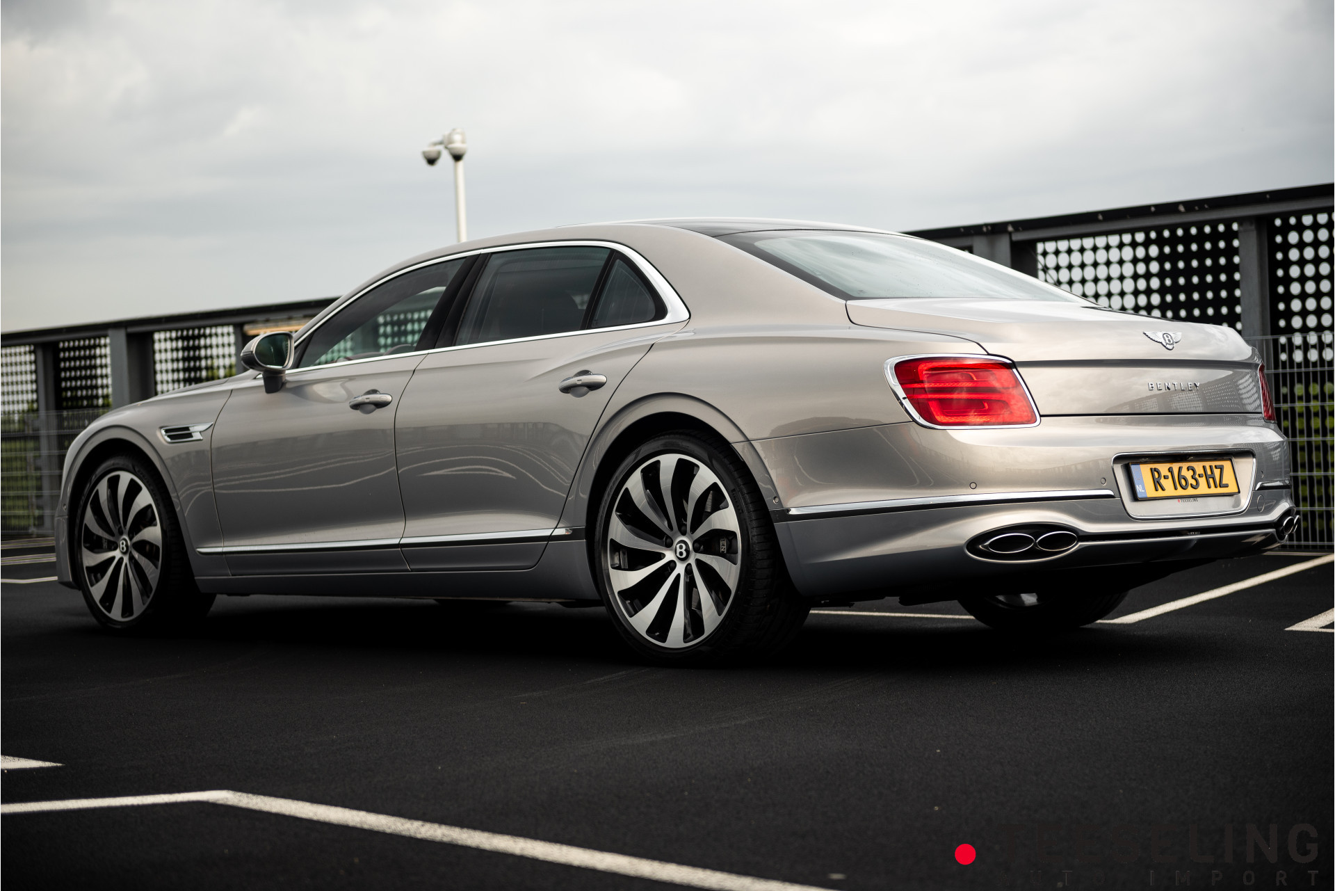 De carrosserie is uitgevoerd in de exclusieve kleur Extreme Silver — een zijdezachte, licht metallic zilvergrijze tint die onder elk lichtspel verandert van karakter. Subtiel en ingetogen, maar met een verfijnde glans die de gespierde lijnen van de Flying Spur prachtig accentueert. Een kleur die klasse uitstraalt zonder te schreeuwen — geheel in lijn met het Bentley-DNA.