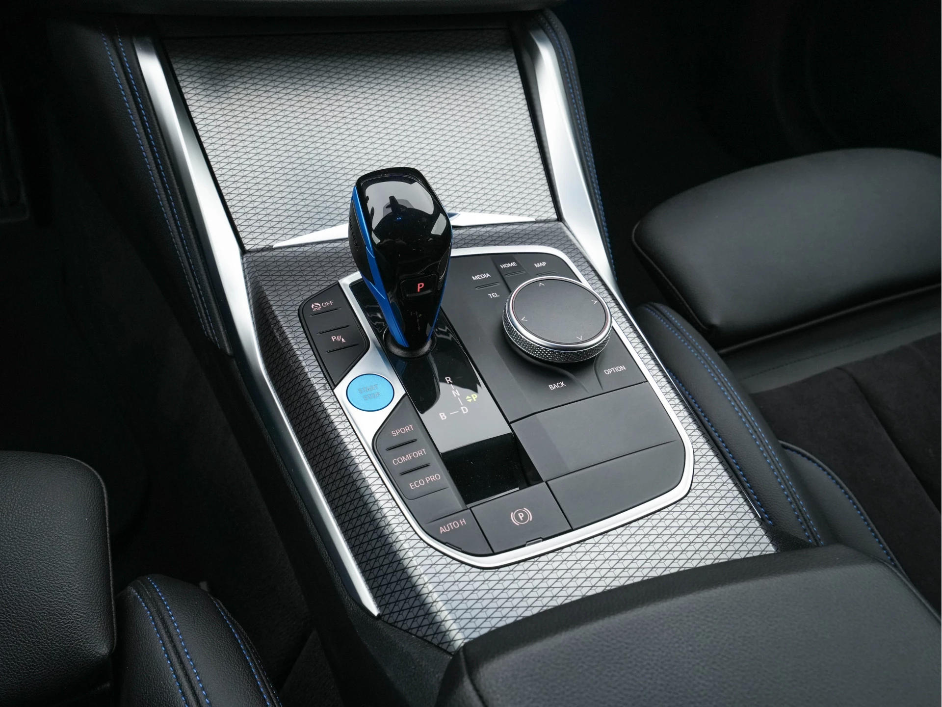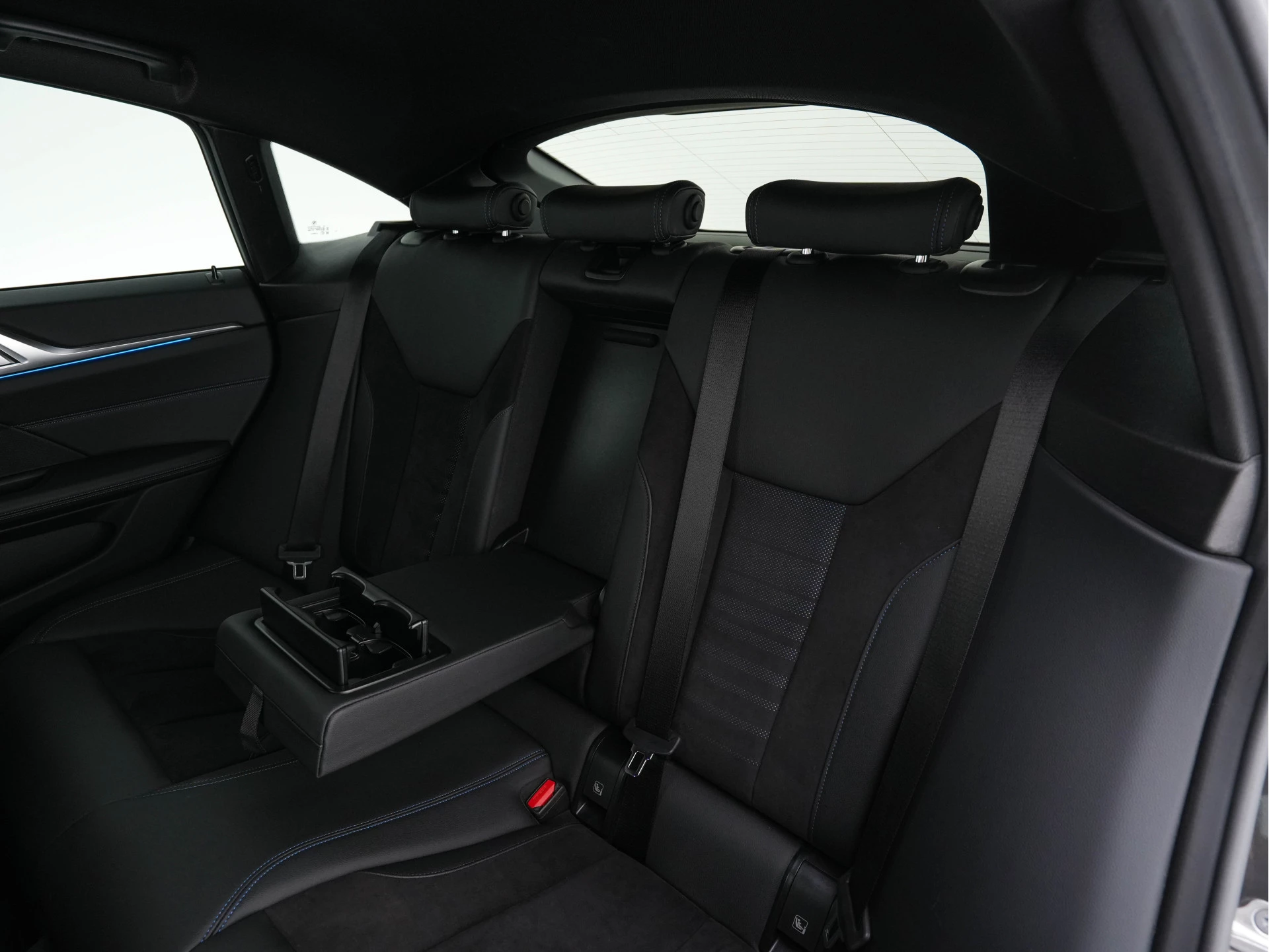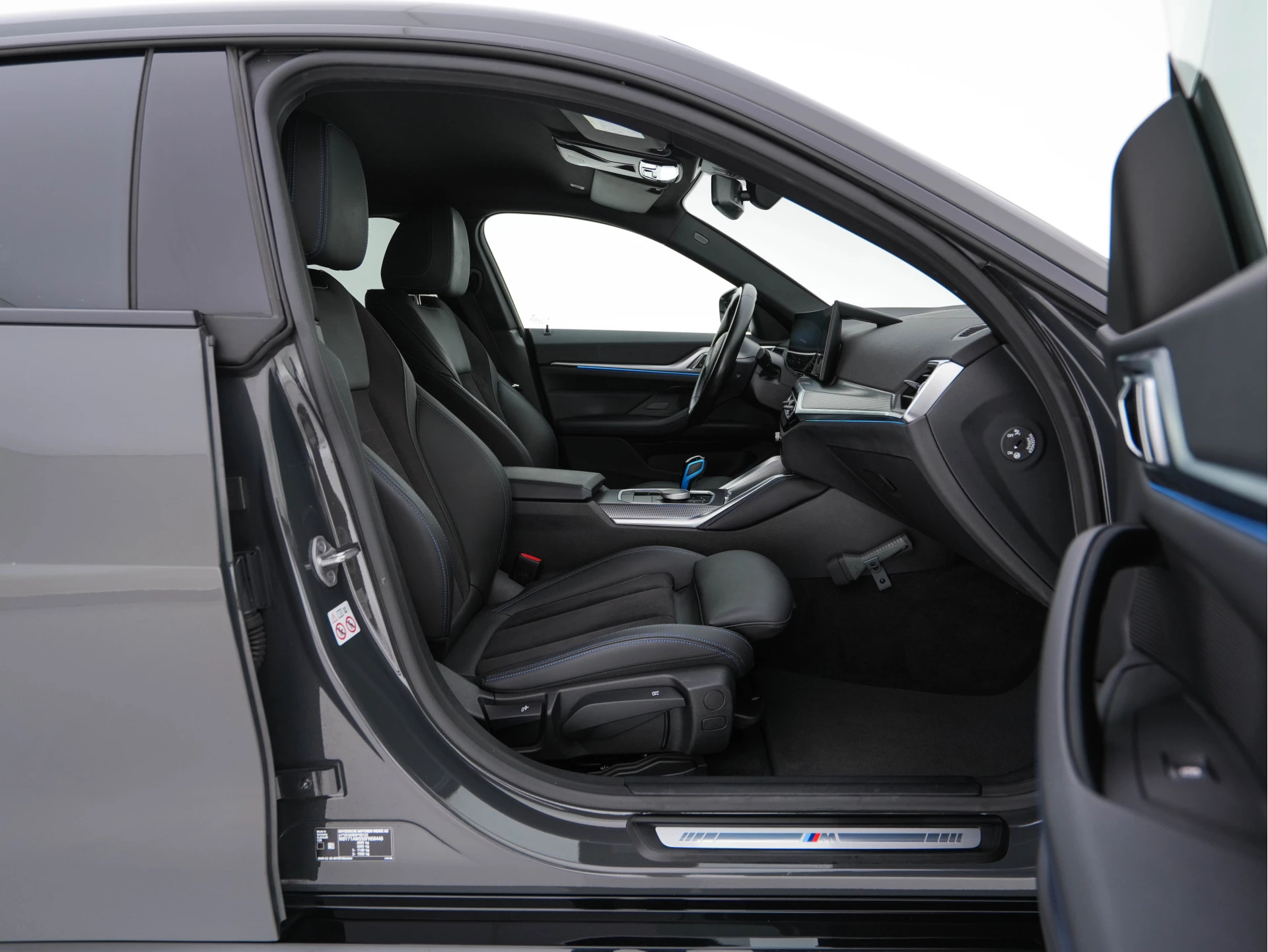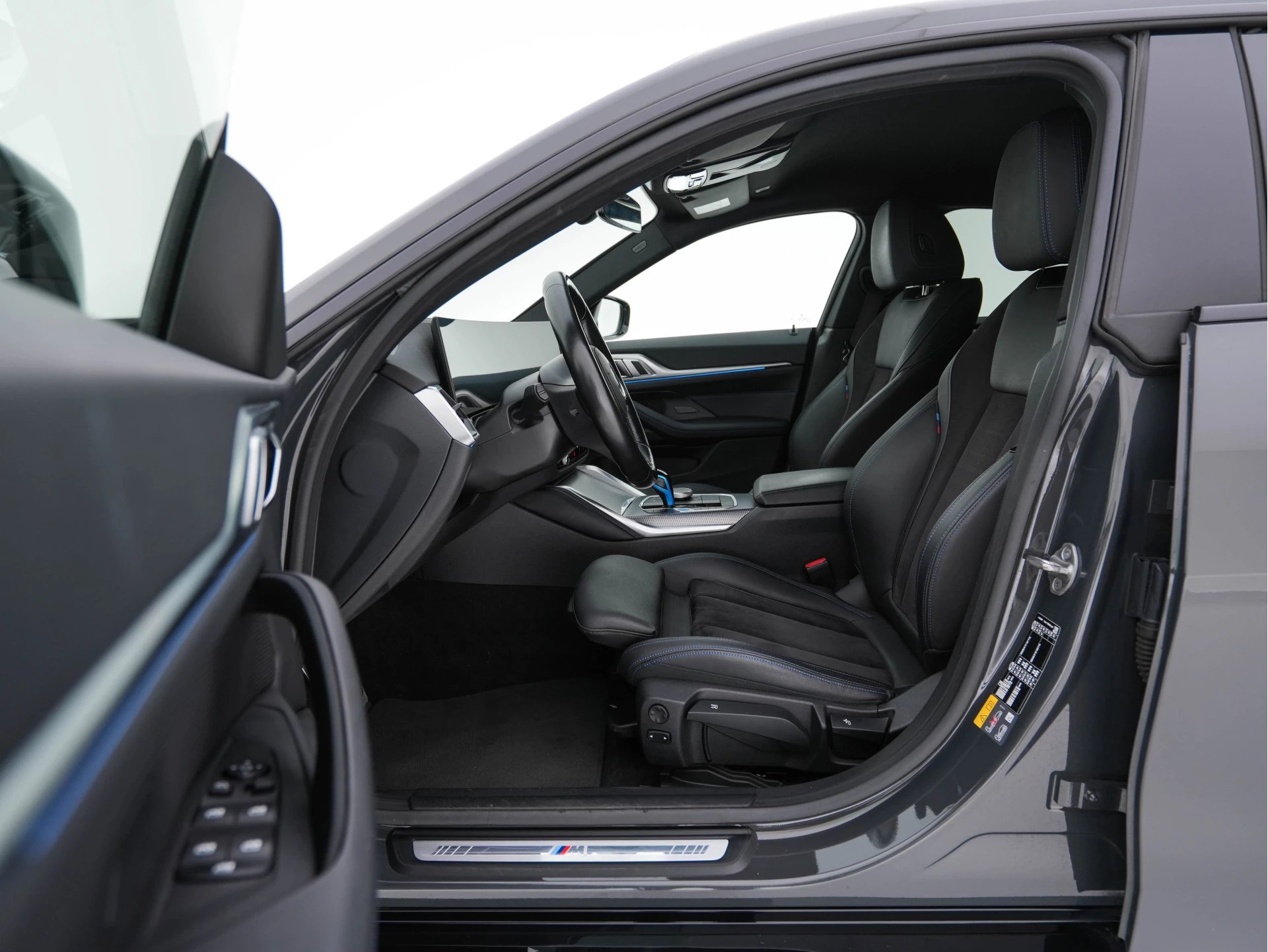 BMW i4 eDrive40 84 kWh M Sport – in Individual Dravit Grey met Alcantara-/Leder combinatie zwart met blauwe stiksel | Luxe, Sportief & Elektrisch