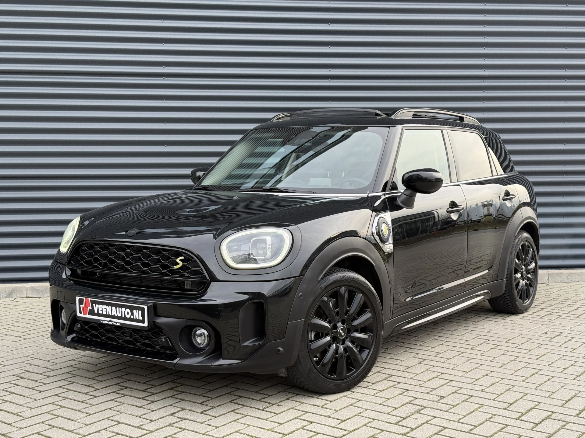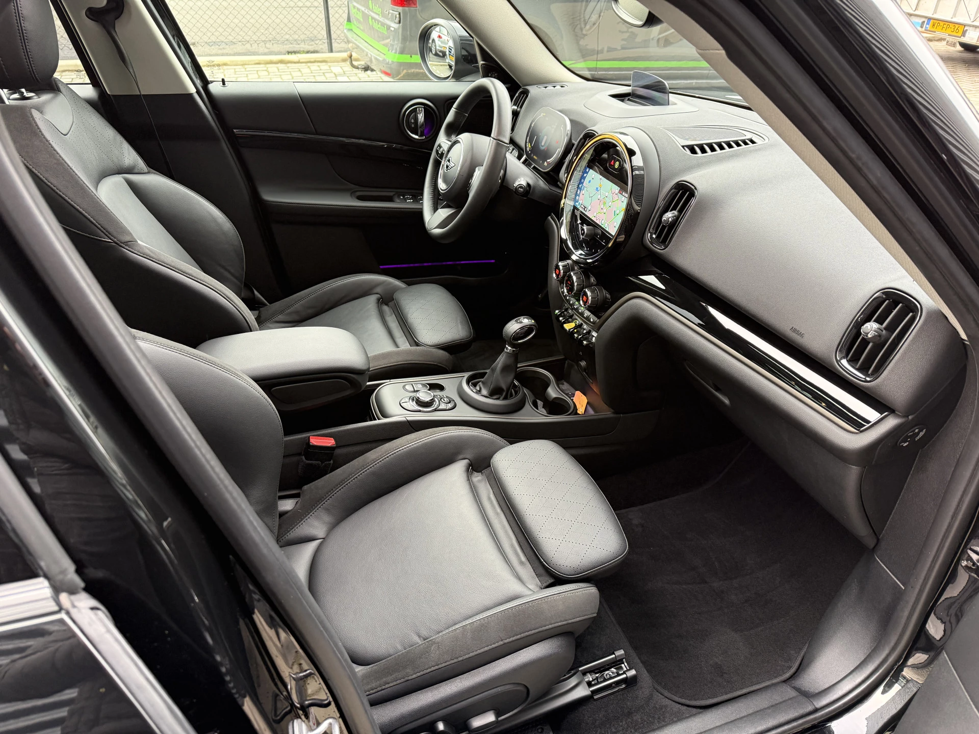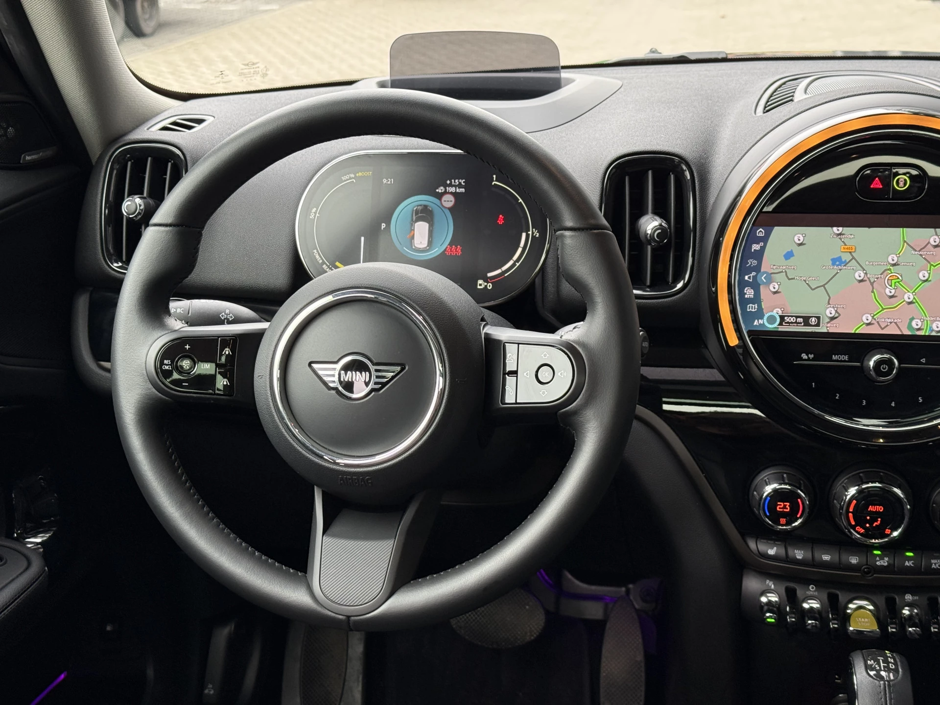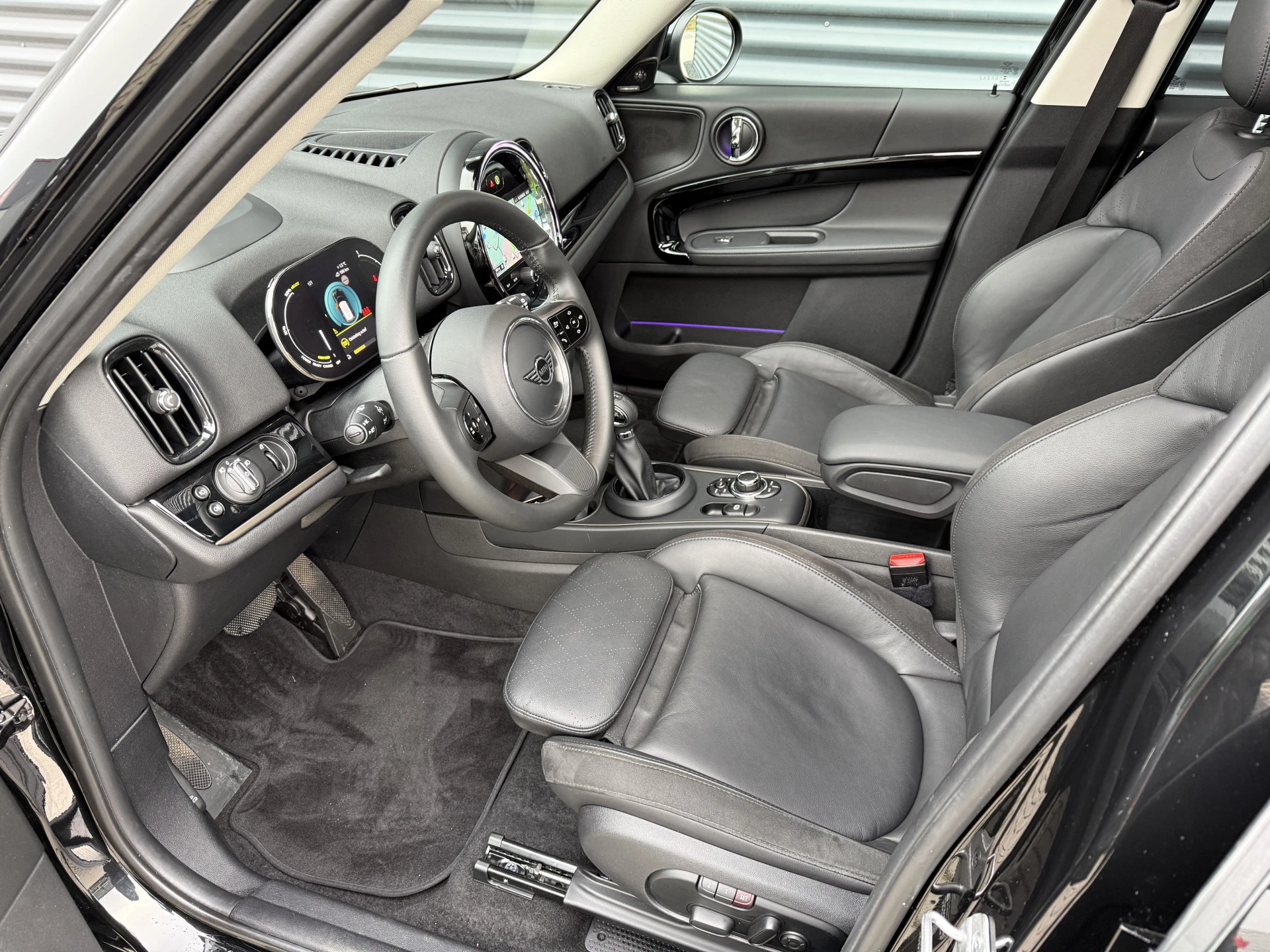 Schitterende Mini Countryman 2.0 Cooper SE ALL4 Plug in Hybrid in Midnight Black metallic met 18 inch hoogglans zwarte licht metalen velgen. Deze Mini is bijzonder compleet uitgerust met onder andere de volgende opties: Panorama dak, elektrische bedienbare voorstoelen met memory, lederen bekleding, Harman Kardon Audio, LED interieur sfeer verlichtingspakket, Apple Carplay, achteruitrijcamera, navigatie, virtuele cockpit, Head Up display, adaptieve cruise control, keyless entry, parkeersensoren voor + achter met parkeer assistent, etc..