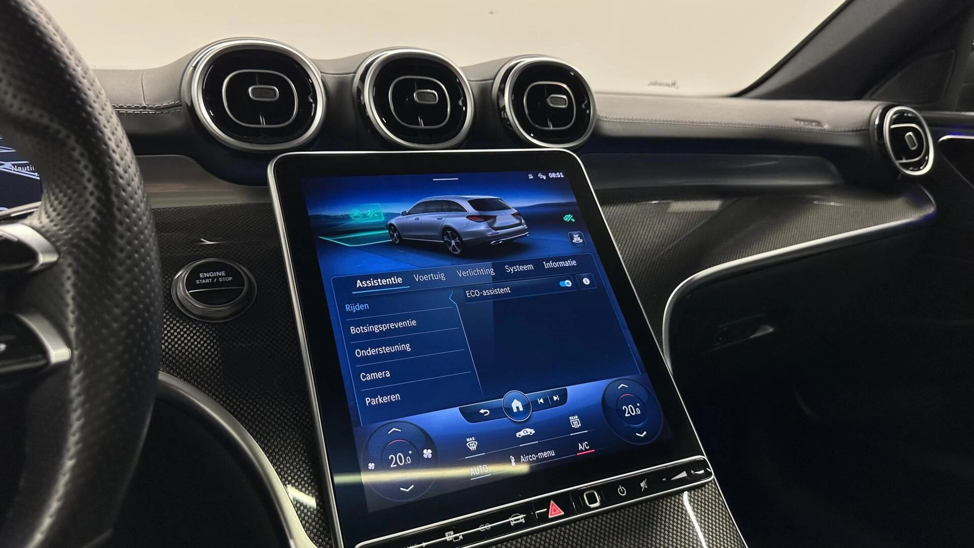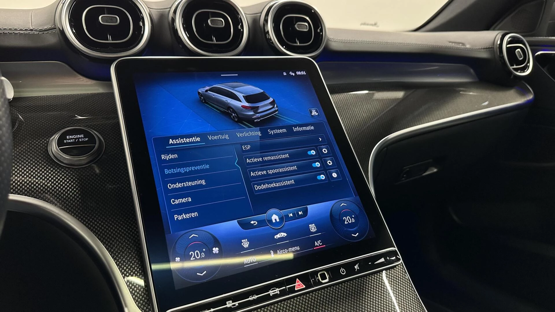 Zoals u mag verwachten van deze Mercedes C-klasse Estate is hij uitgerust met een reeks aan actieve veiligheidssystemen. Verkeersbord-detectie herkent verkeersborden en toont deze op het instrumentarium van de auto. Indien u onbedoeld de rijstrook lijkt te verlaten, reageert het Lane-keeping systeem meteen en corrigeert. De actieve dodehoekdetectie voorkomt dat u een voertuig over het hoofd ziet en waarschuwt tijdig. De auto is ook uitgerust met forward collision warning system, brake assist en bandenspanningcontrolesysteem.