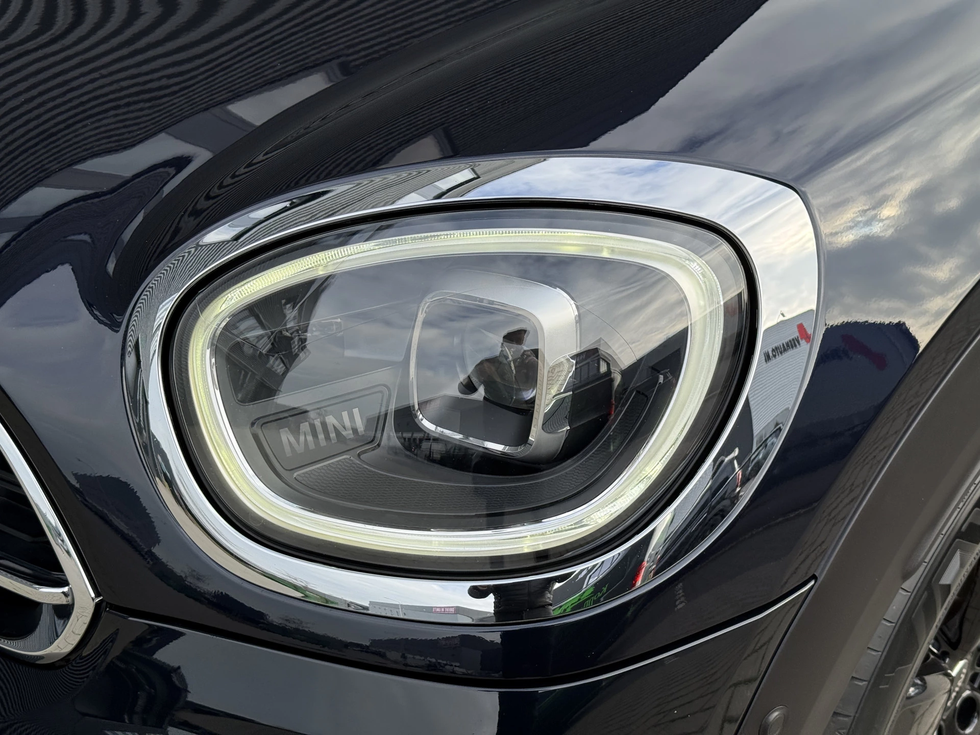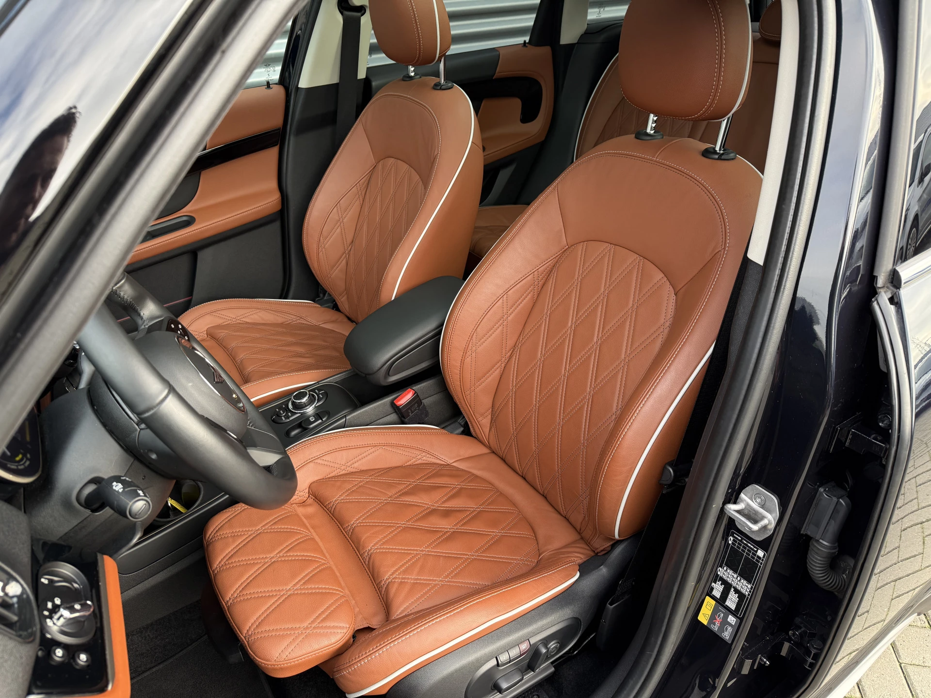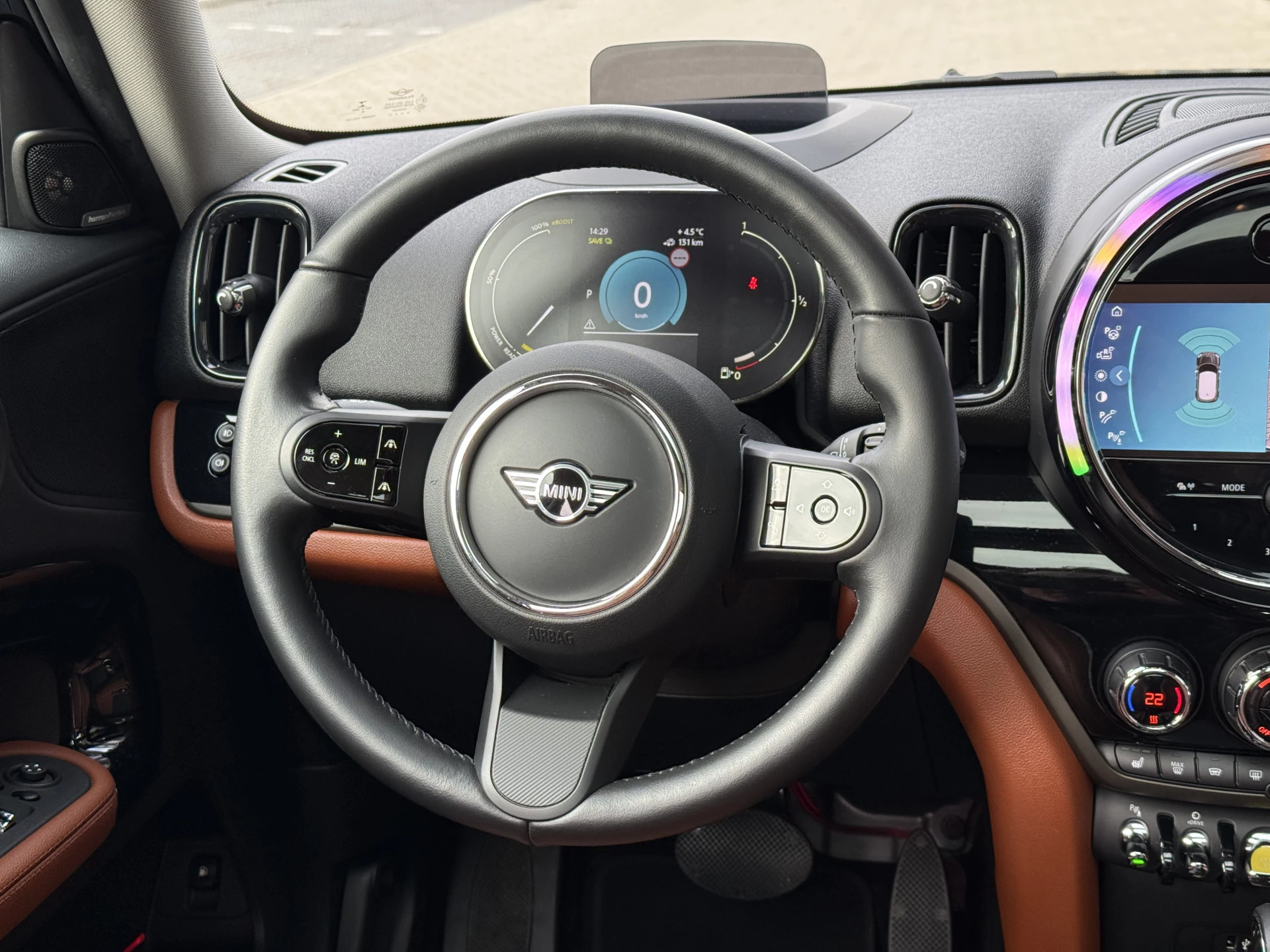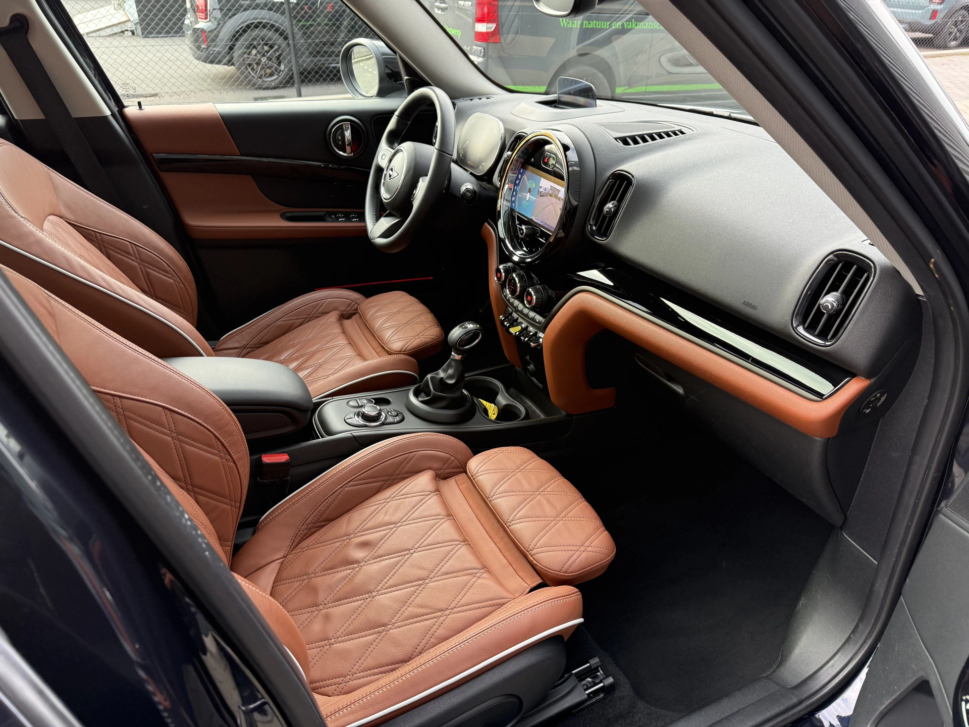 Schitterende Mini Countryman 2.0 Cooper SE ALL4 Plug in Hybrid in Enigmatic Black metallic (heel diep donkerblauw) met hoogglans zwarte licht metalen velgen. Deze Mini is bijzonder compleet uitgerust met onder andere de volgende opties: Panorama dak, elektrische bedienbare voorstoelen met memory, Chester Malt lederen bekleding, Harman Kardon Audio, LED interieur sfeer verlichtingspakket, Apple Carplay, achteruitrijcamera, navigatie, virtuele cockpit, Head Up display, adaptieve cruise control, keyless entry, parkeersensoren voor + achter met parkeer assistent, etc..