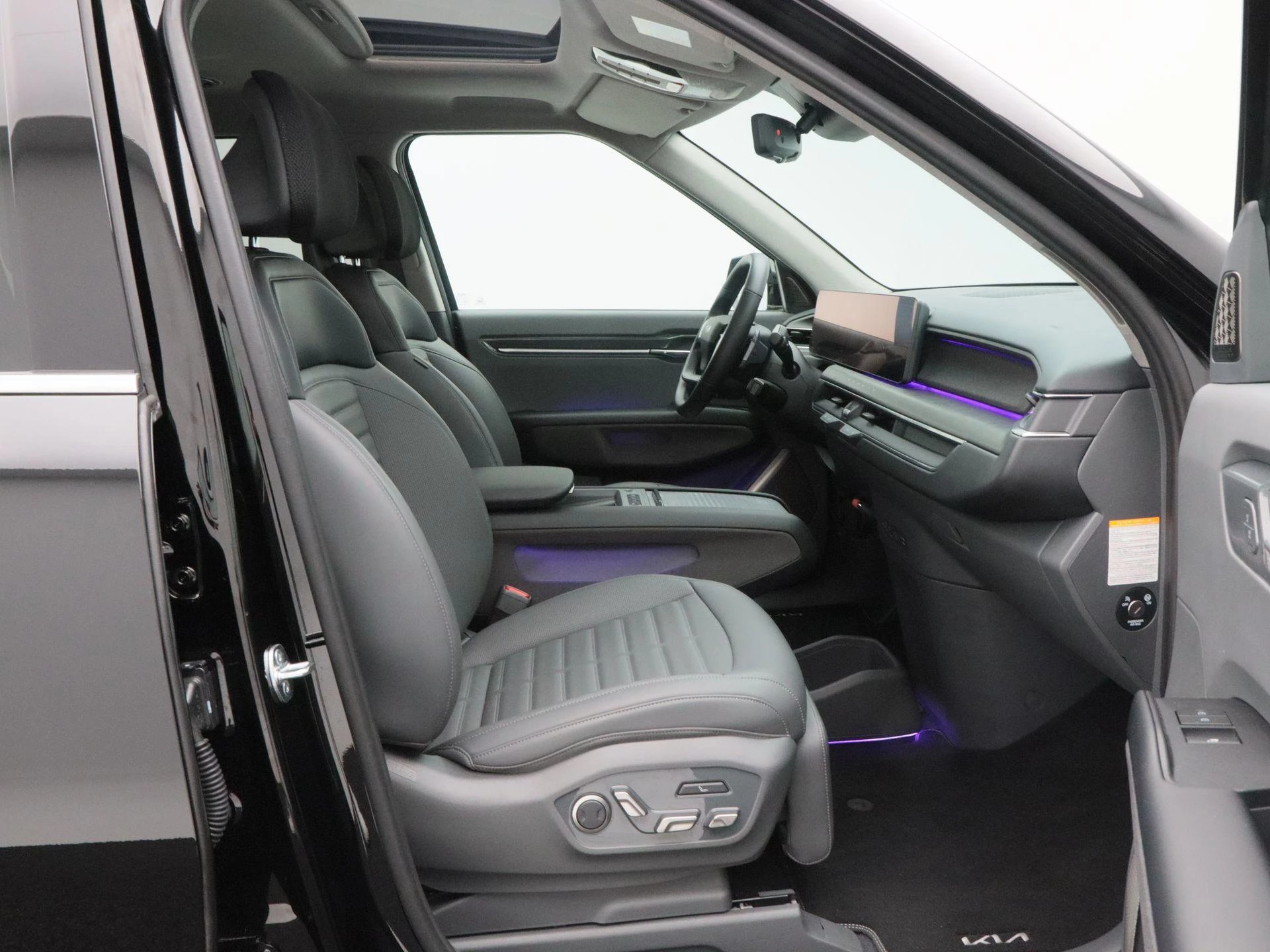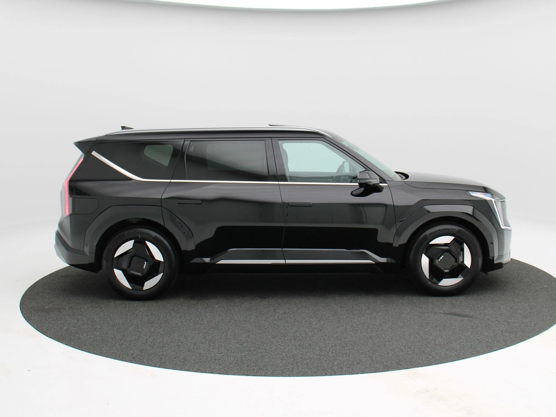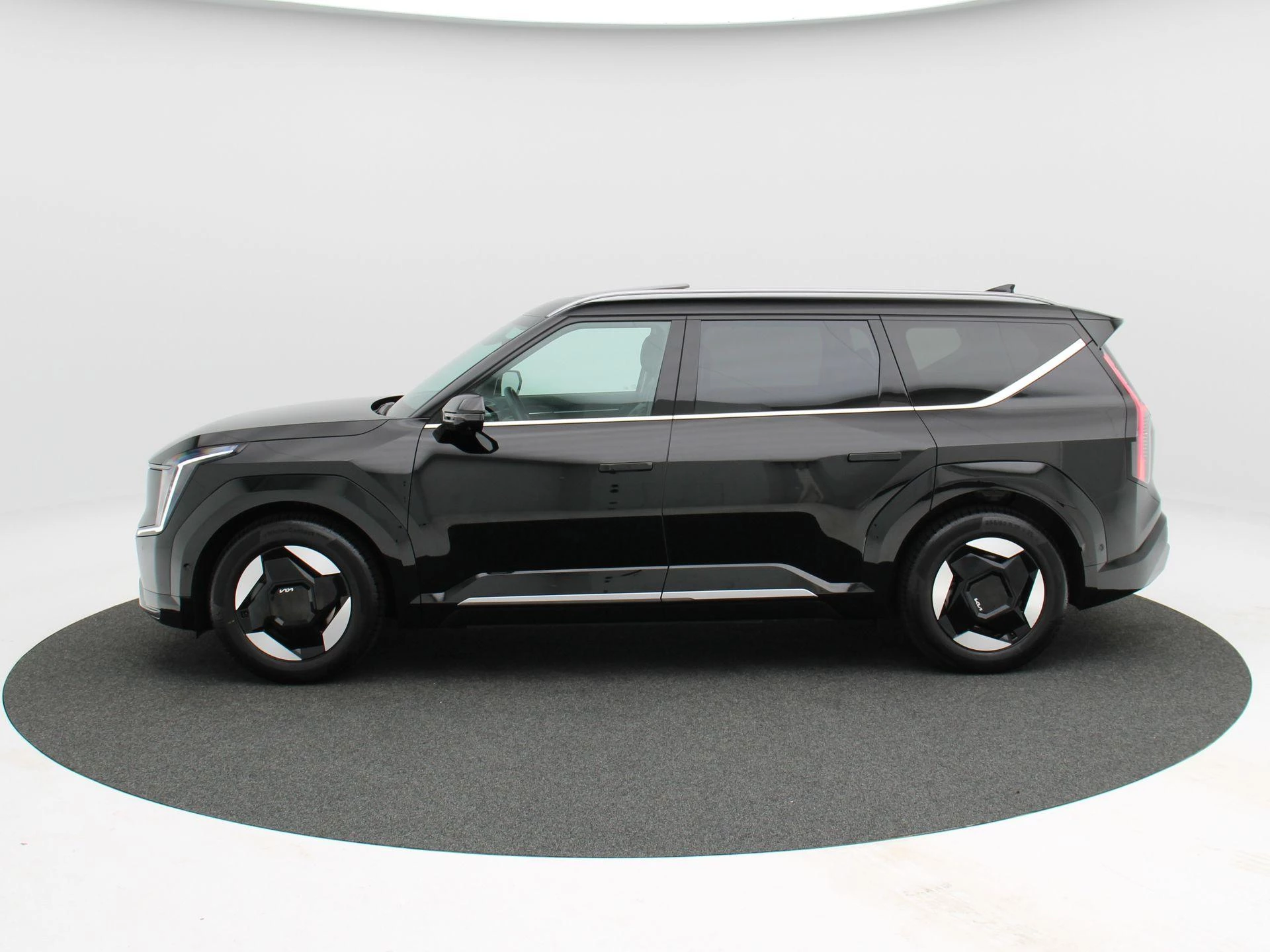 De Kia EV9 valt direct op door zijn robuuste design en royale afmetingen. Het grote panoramadak zorgt voor een licht en ruimtelijk interieur, terwijl de 19 inch lichtmetalen velgen bijdragen aan een moderne en krachtige uitstraling.