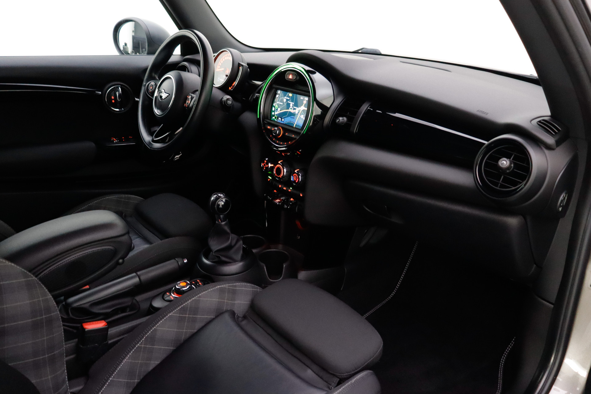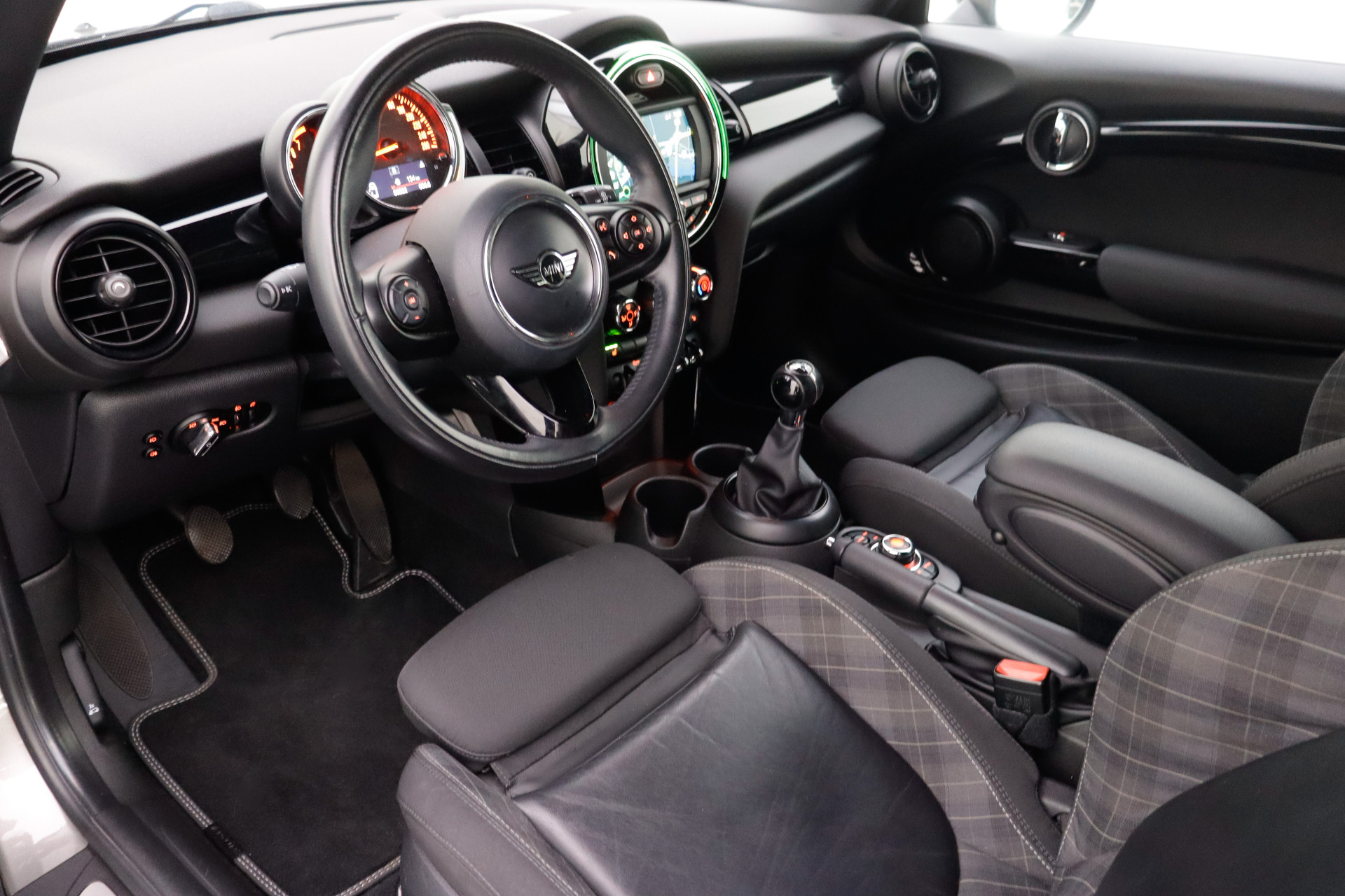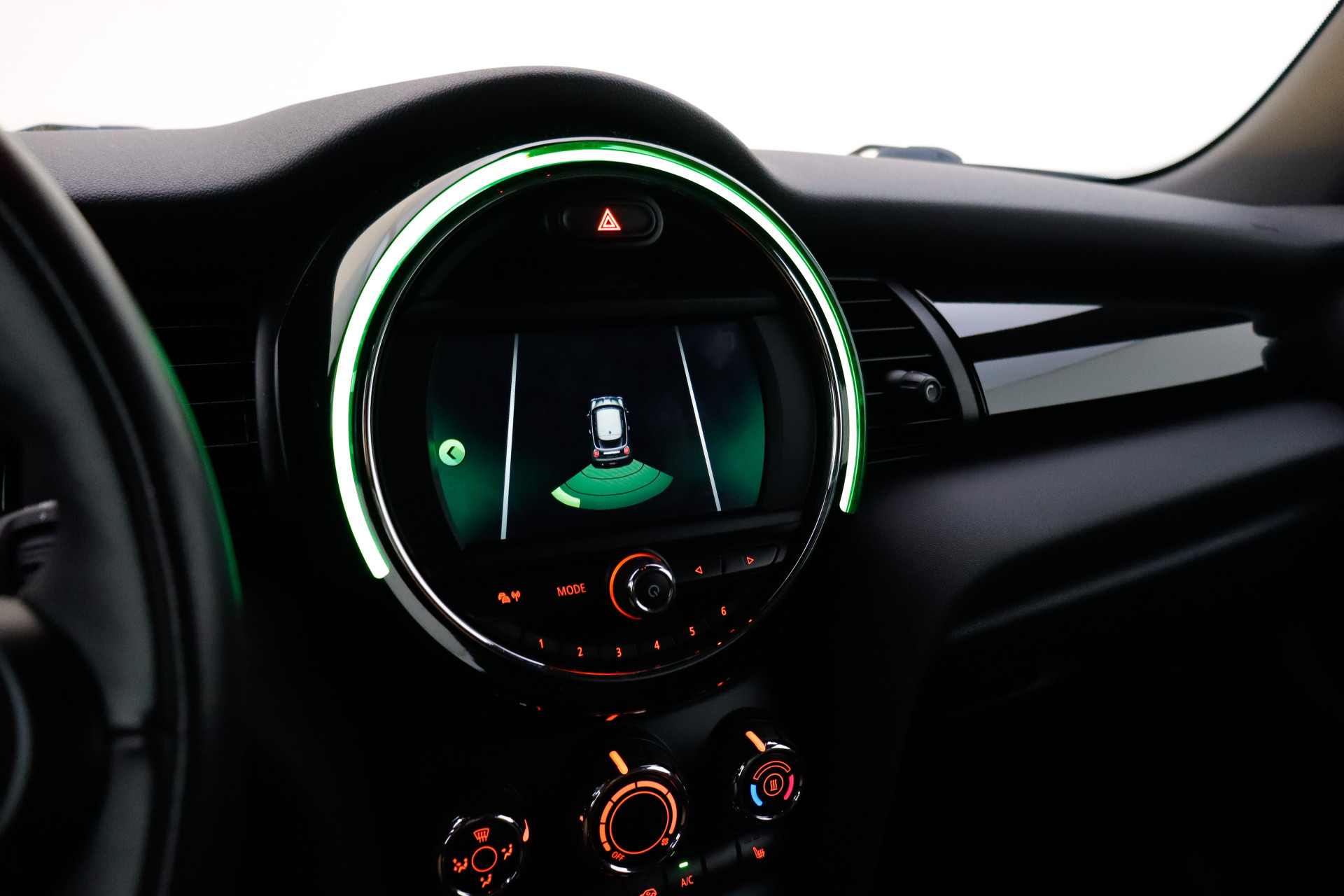 U bedient het full map navigatiesysteem en het audio-installatiesysteem via knoppen op het stuur. Zo kunt u steeds uw aandacht gericht houden op de weg. De achteropkomend verkeer waarschuwing bewaakt de afstand tot achterliggers en geeft een signaal als er te weinig ruimte is. Met de automatische airconditioning selecteert u de gewenste temperatuur. Het systeem doet de rest. Parkeersensoren zijn een waardevolle toevoeging aan deze auto. De sensoren waarschuwen tijdens het parkeren en voorkomen schade aan de auto. Het hoort bij een intelligente auto als deze dat hij zelf in staat is om zijn omgeving in de gaten te houden. Dat doet deze MINI met een automatisch inschakelbare verlichting en een regensensor. De uitrusting van deze auto is met sportstuurwiel, centrale deurvergrendeling met afstandsbediening en boordcomputer behoorlijk compleet.