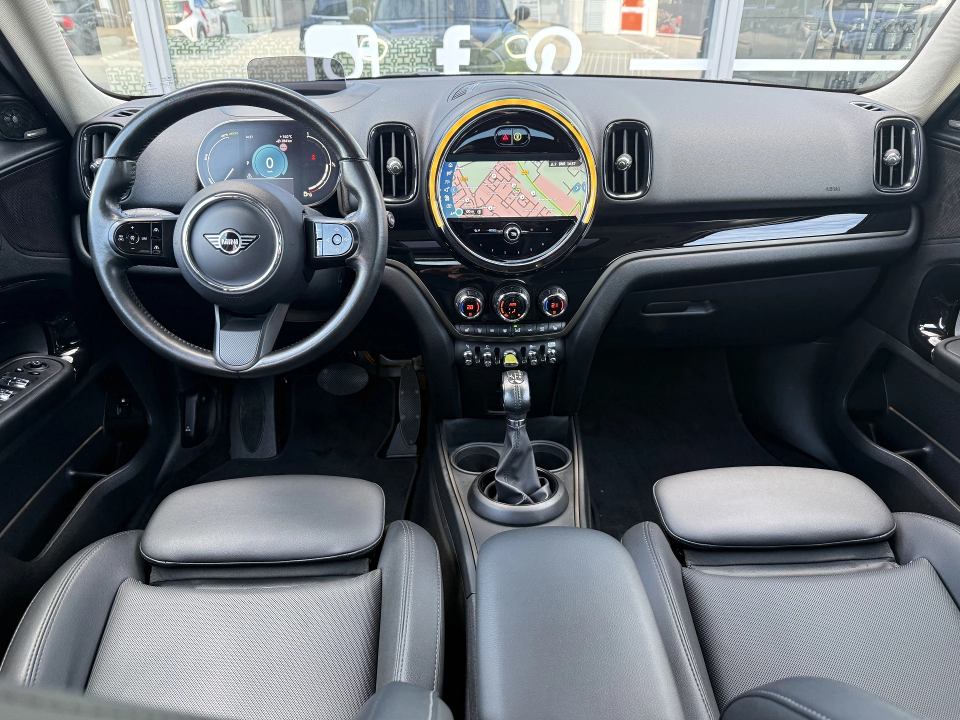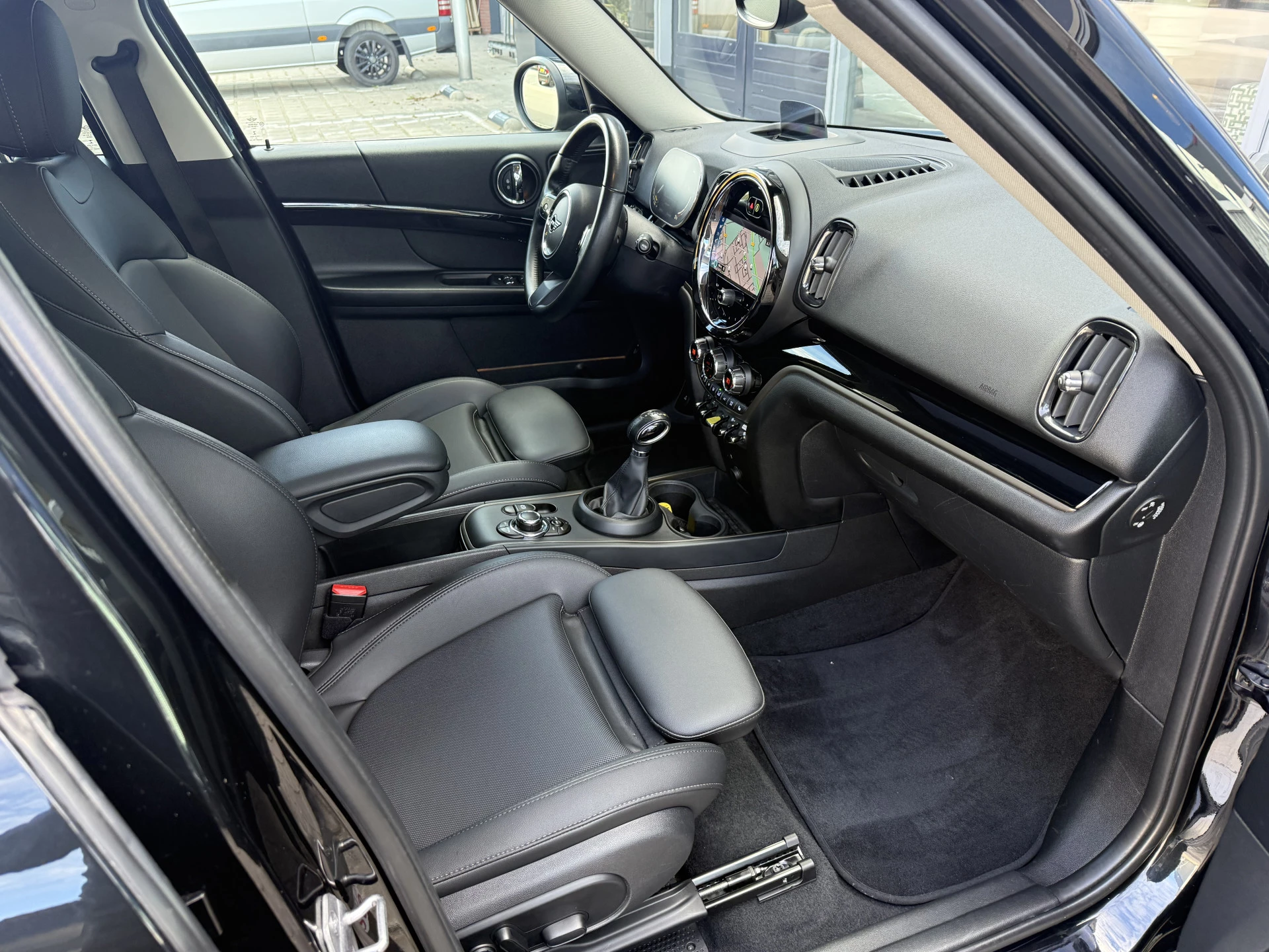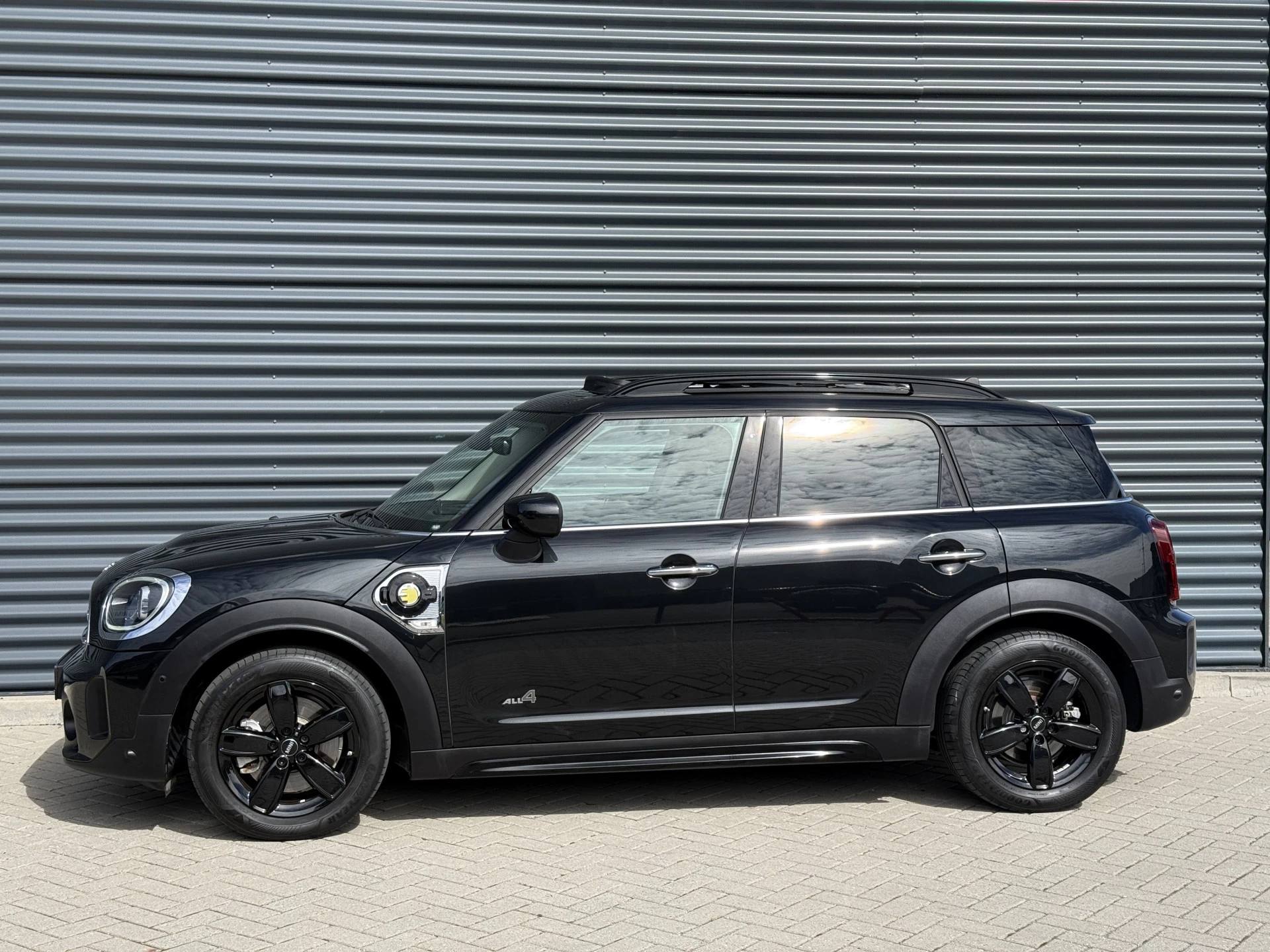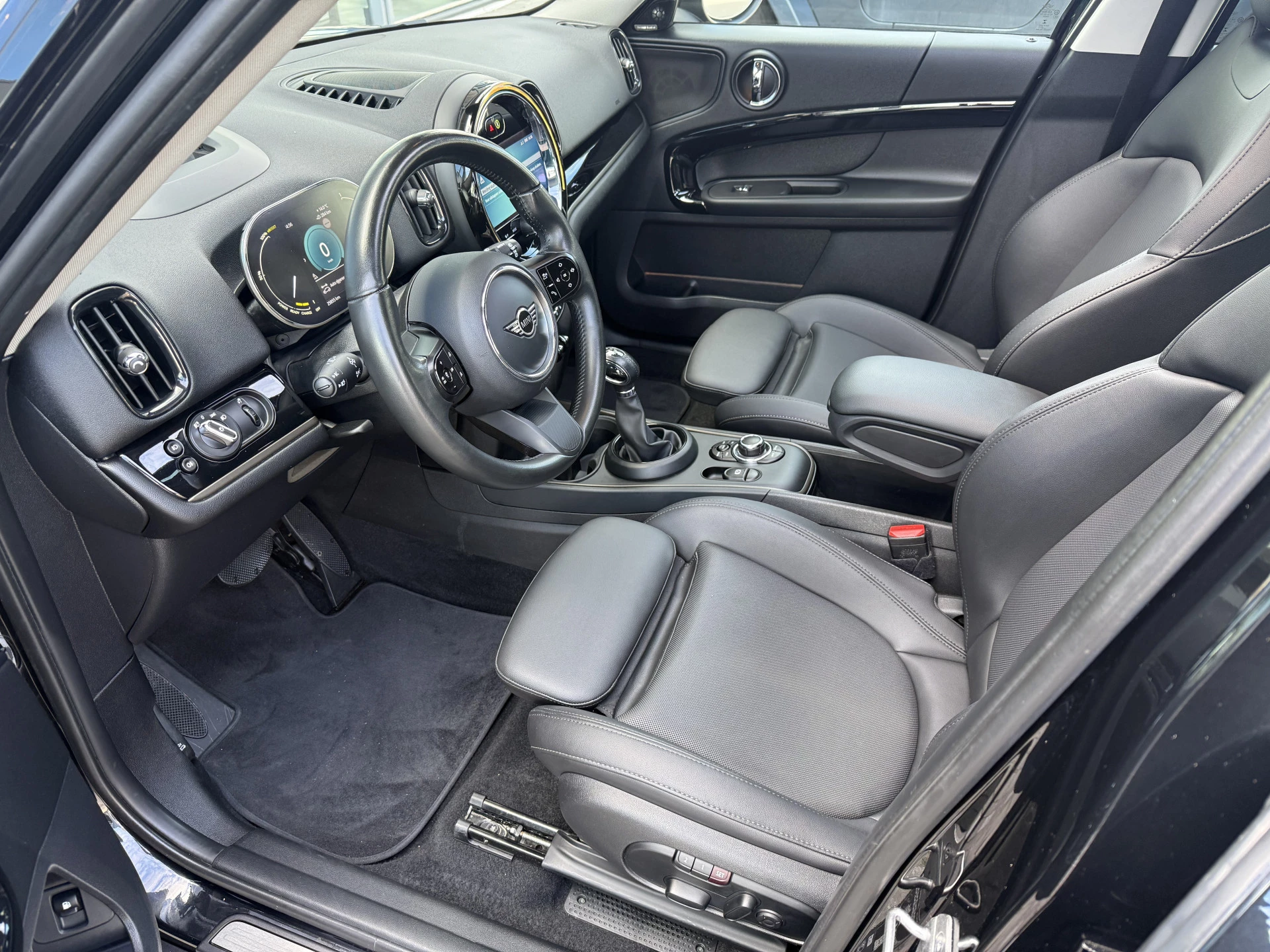 Schitterende Mini Countryman 2.0 Cooper SE ALL4 Plug in Hybrid in Midnight Black metallic met hoogglans zwarte licht metalen velgen. Deze Mini is bijzonder compleet uitgerust met onder andere de volgende opties: Panorama dak, elektrische bedienbare voorstoelen met memory, lederen bekleding, Harman Kardon Audio, LED interieur sfeer verlichtingspakket, Apple Carplay, achteruitrijcamera, navigatie, virtuele cockpit, Head Up display, adaptieve cruise control, keyless entry, parkeersensoren voor + achter met parkeer assistent, etc..