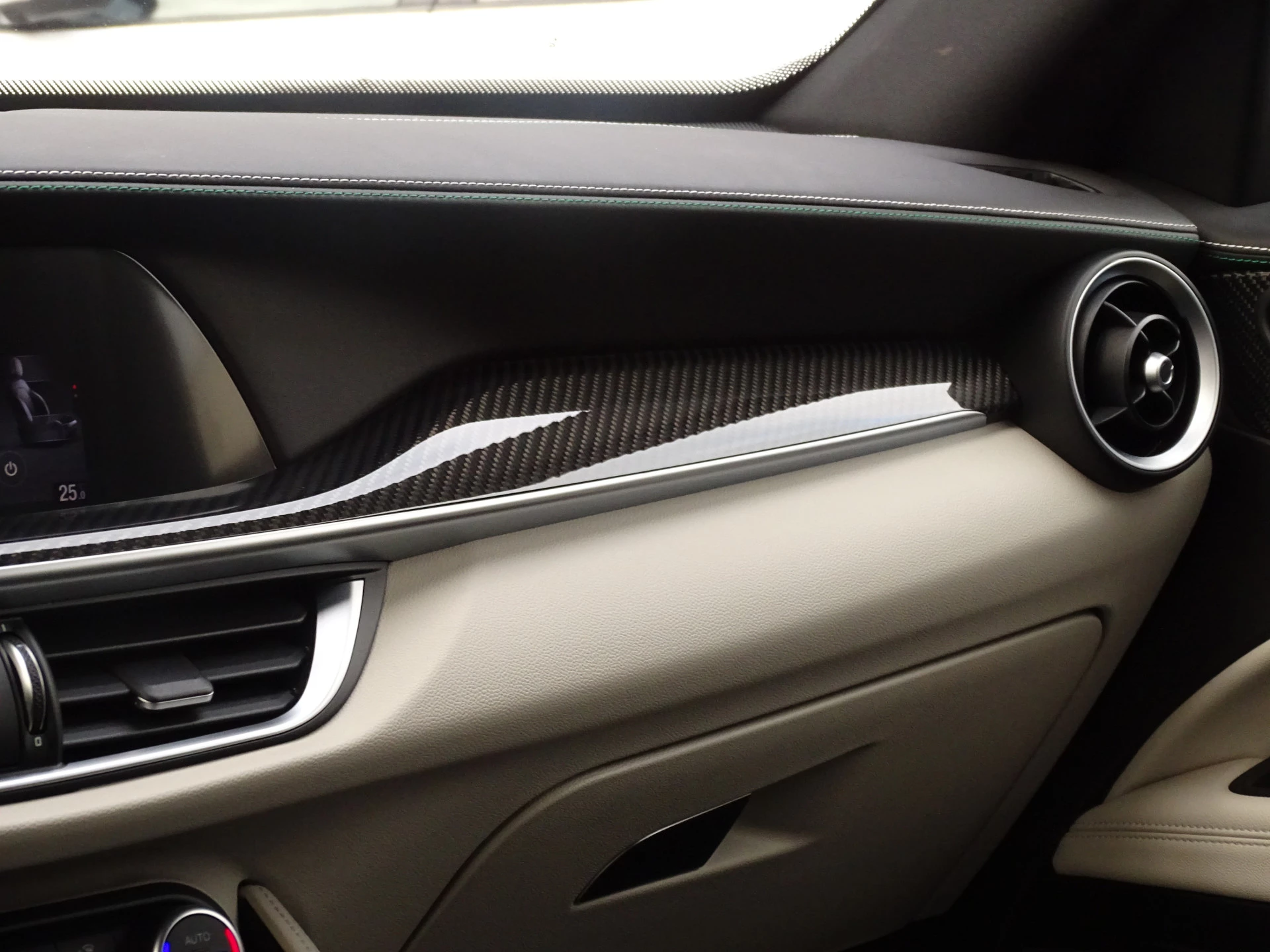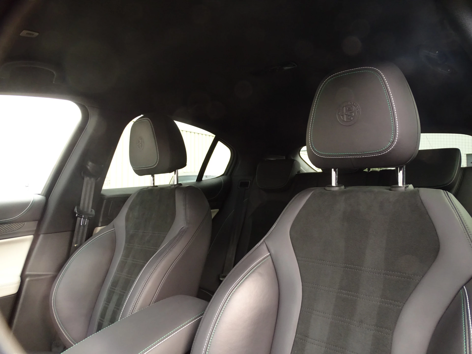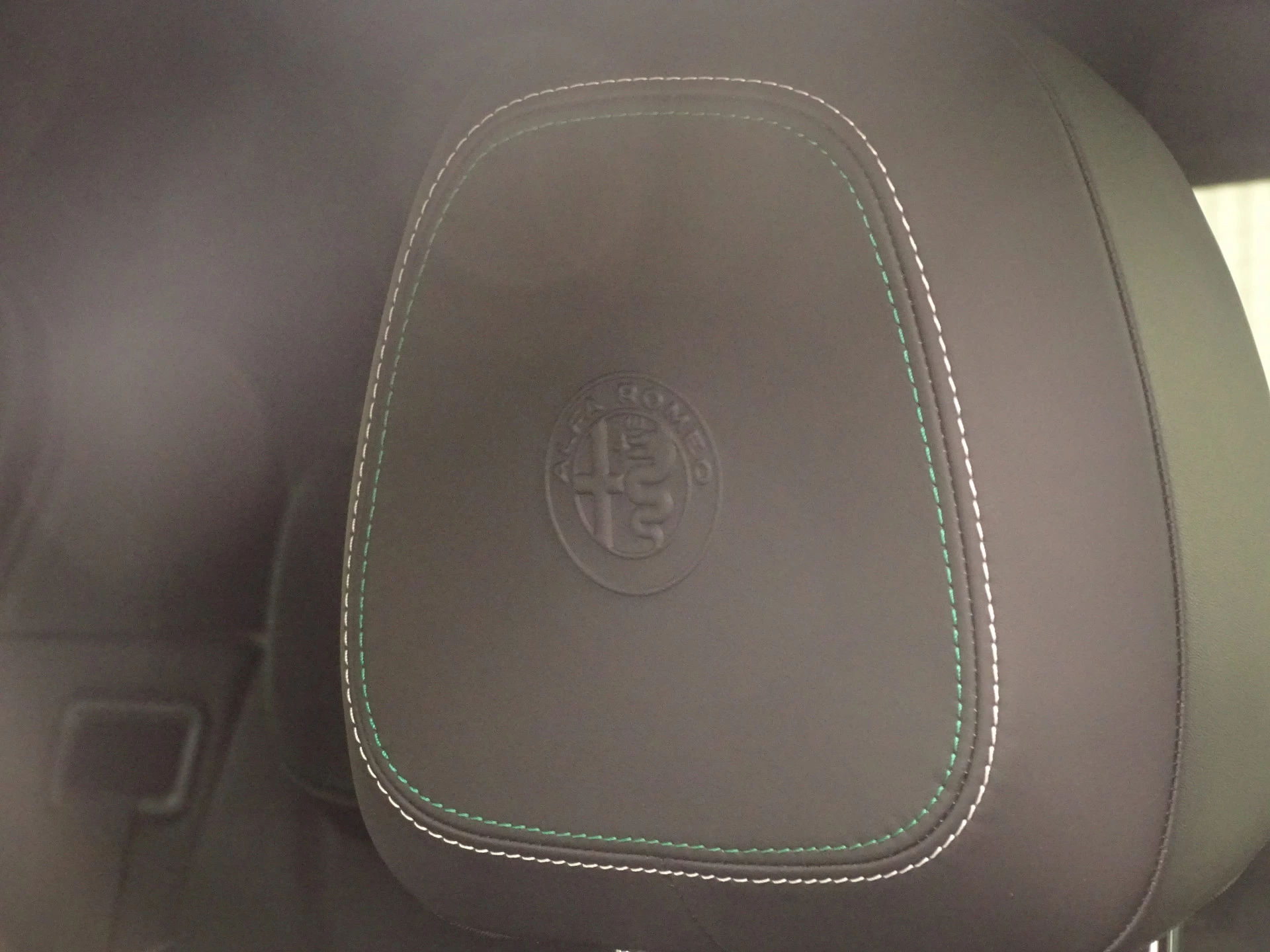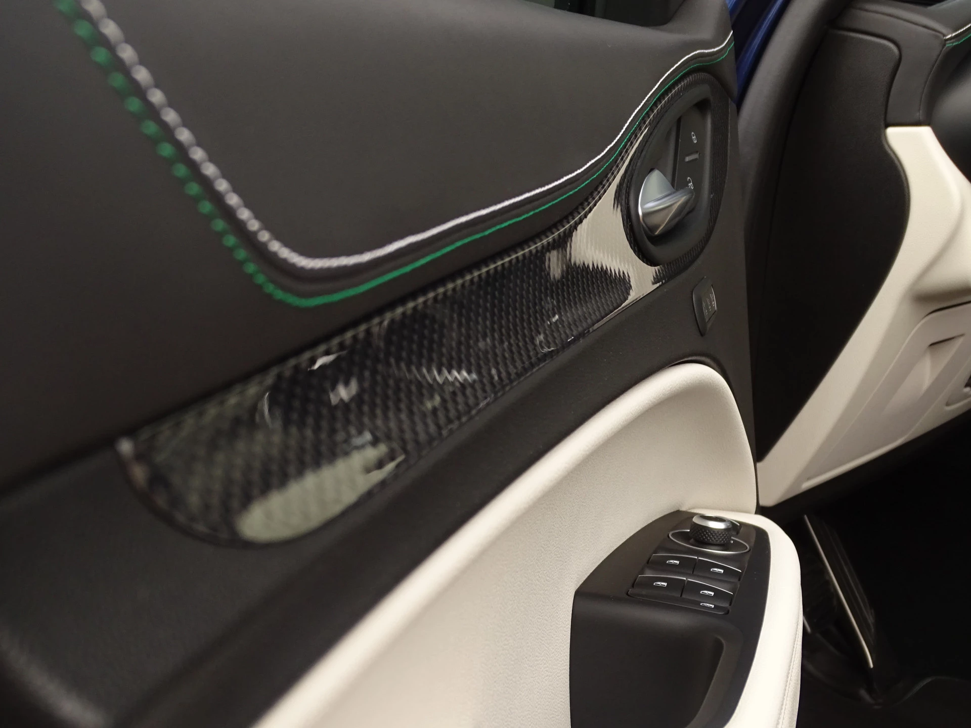 - witgrijze/groene stiksels op lederen dashboard en bekleding