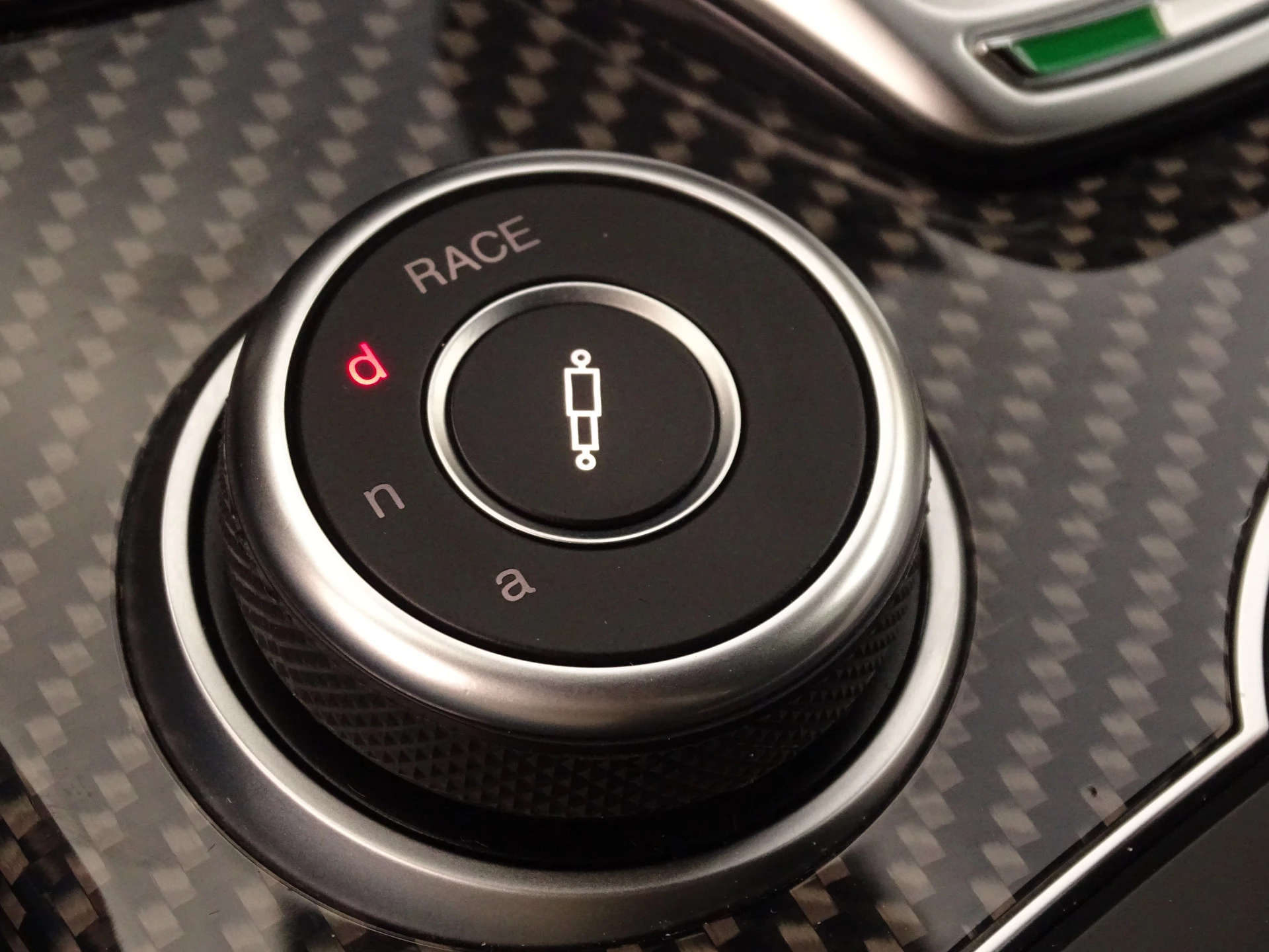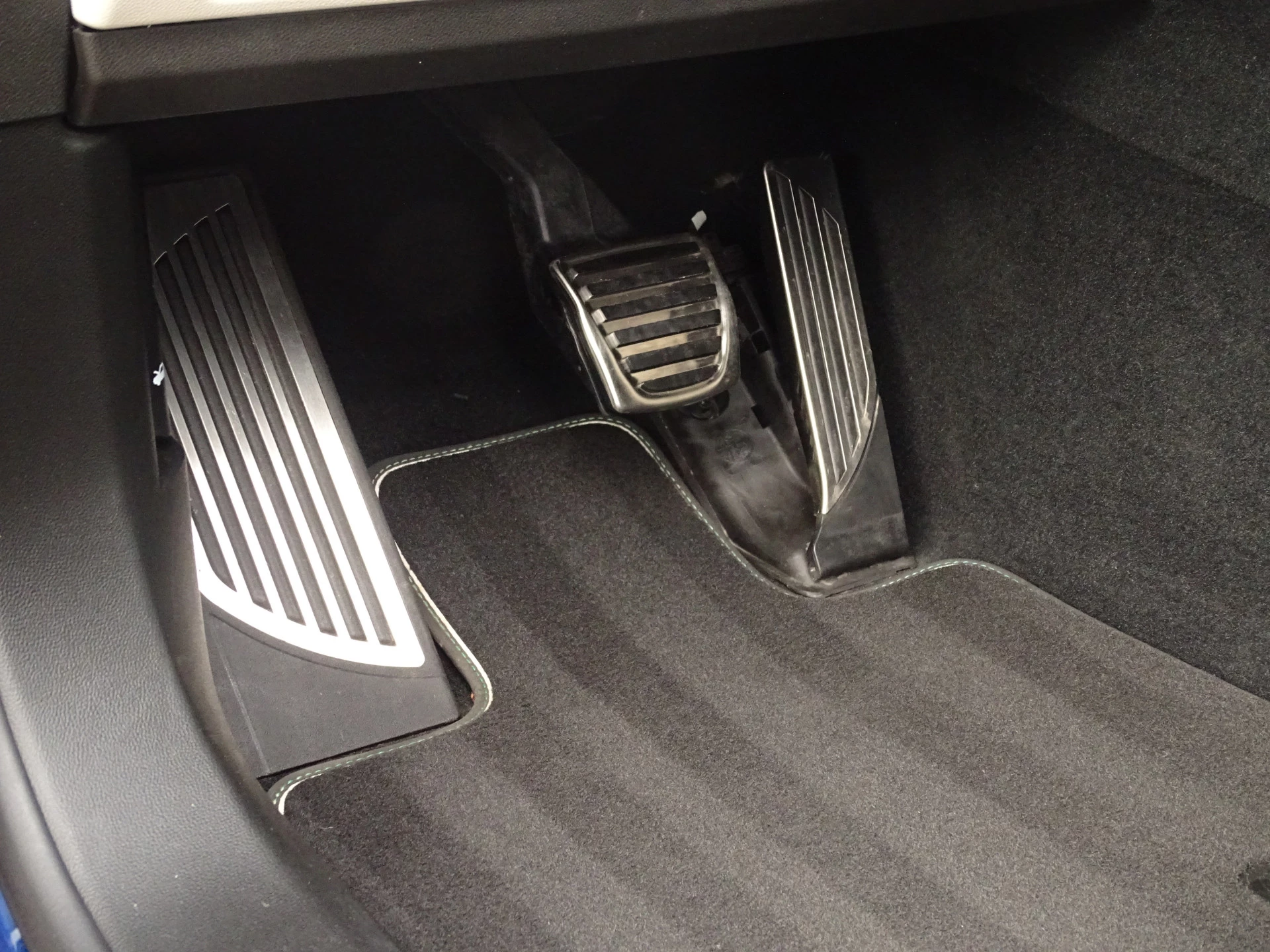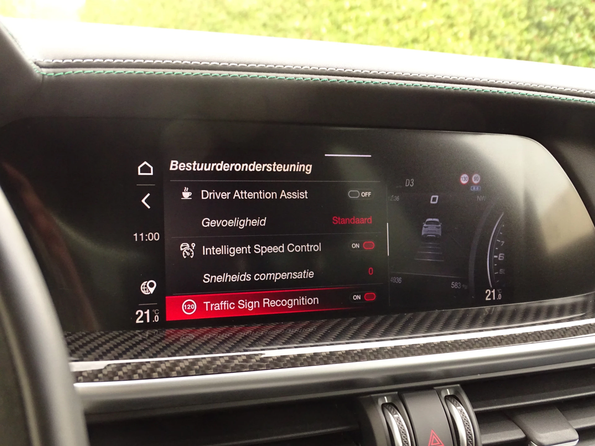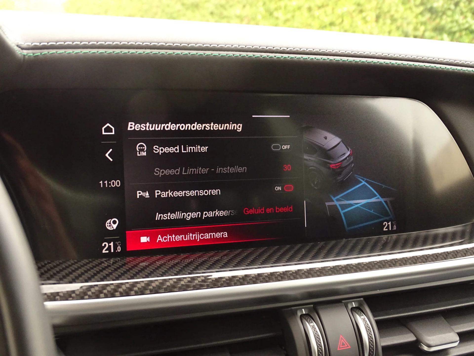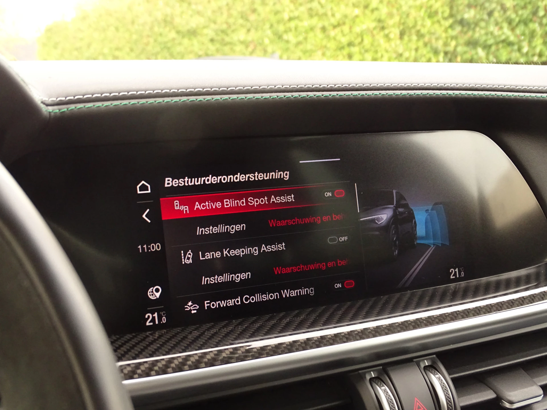 - witgrijze/groene stiksels op lederen dashboard en bekleding