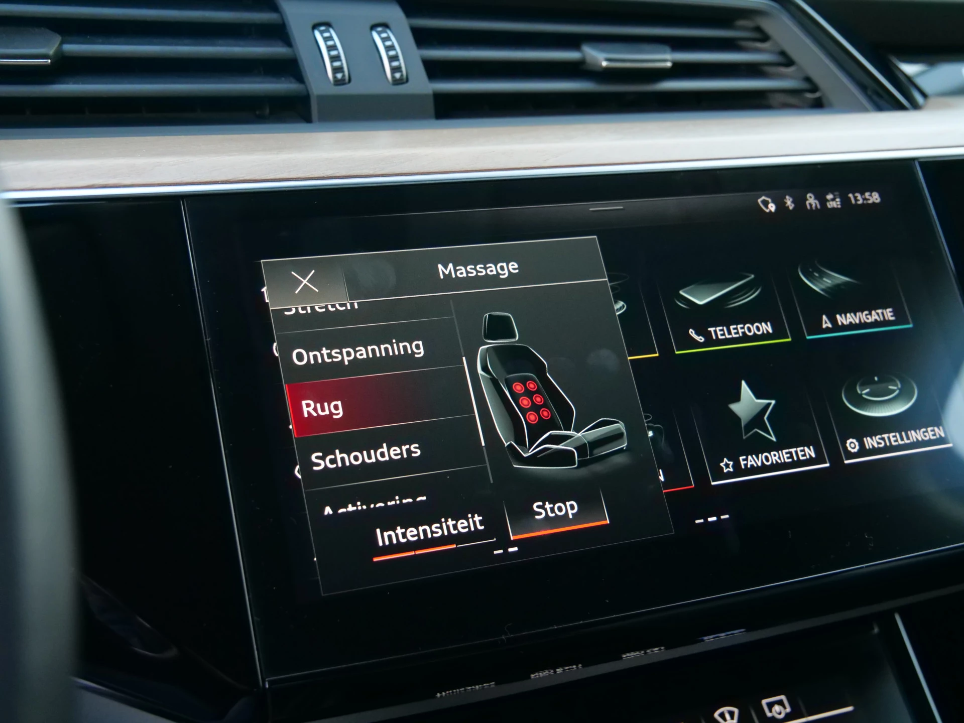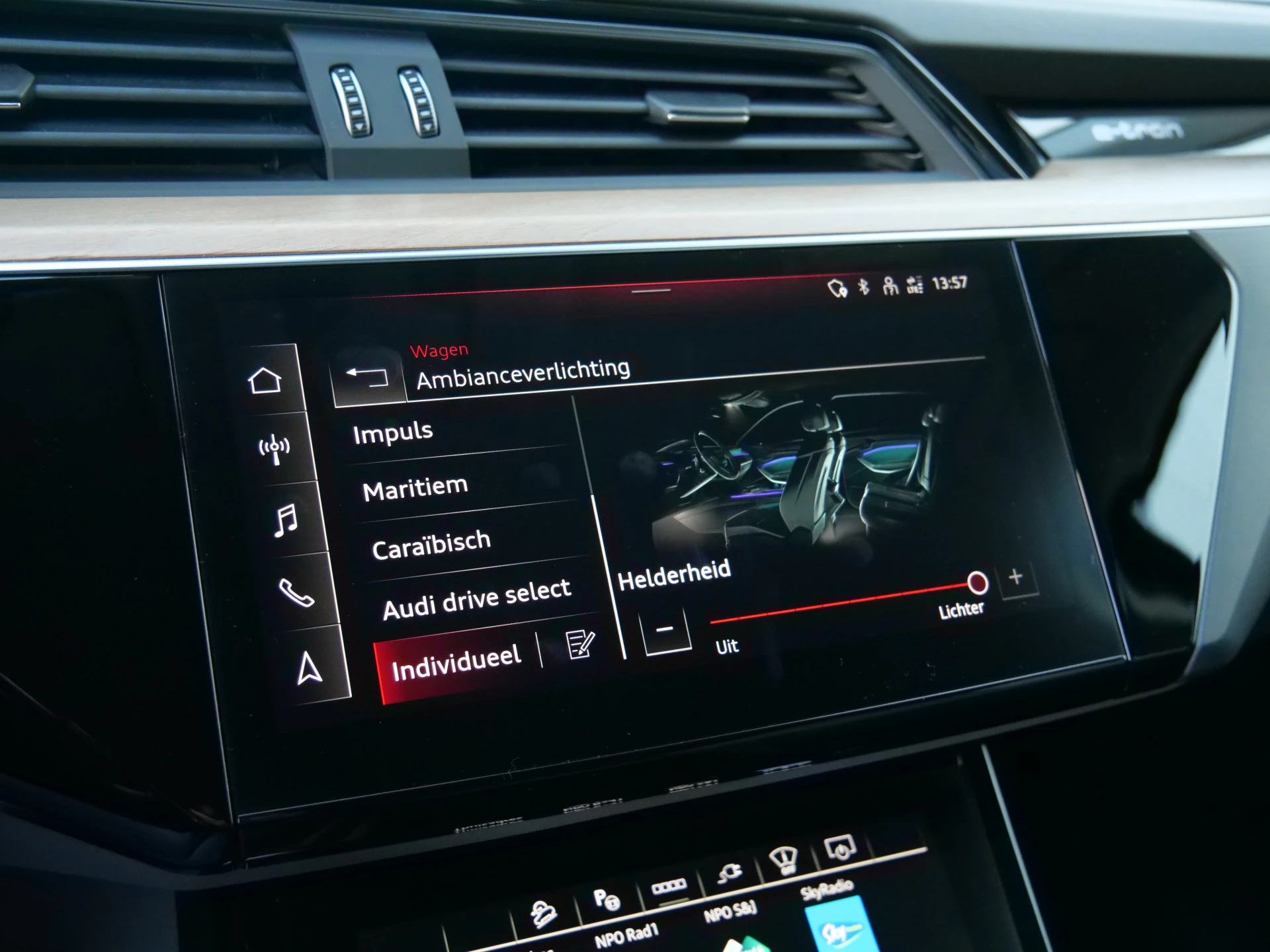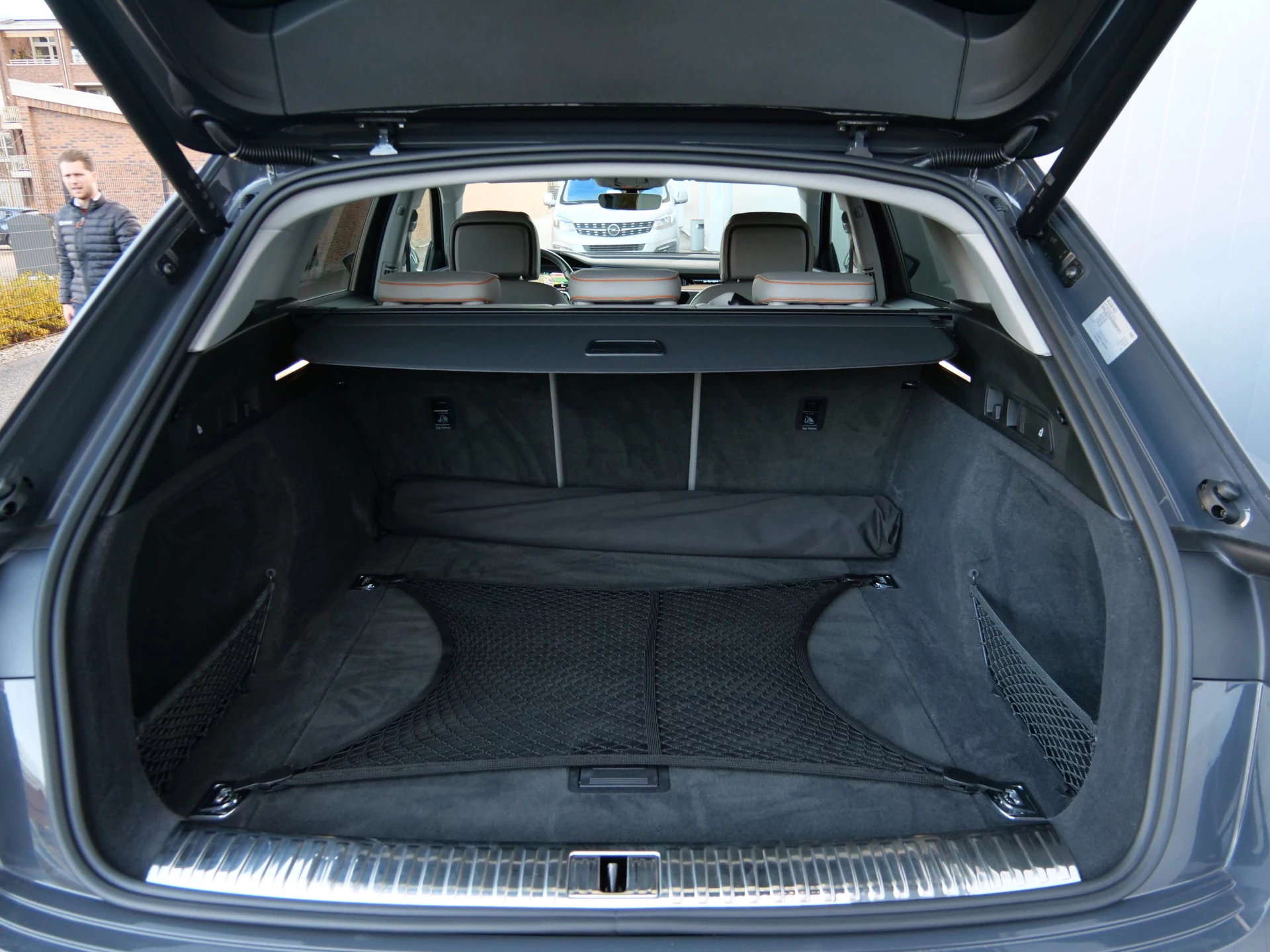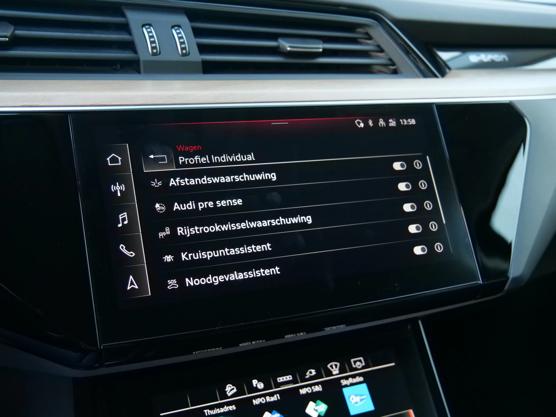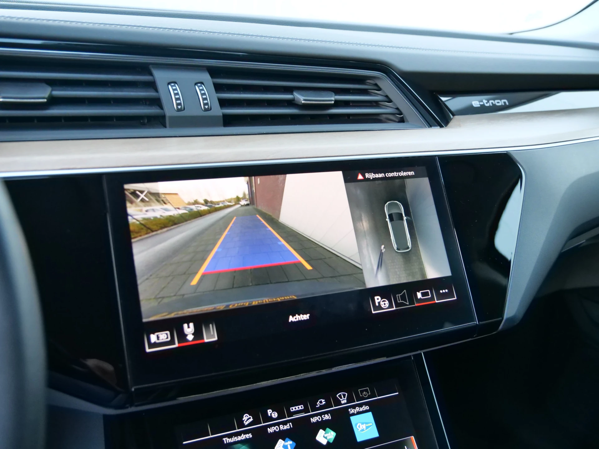 Zoals u mag verwachten van deze Audi Q8 e-tron is hij uitgerust met een reeks aan actieve veiligheidssystemen. Dankzij de head-up display krijg je de gewenste dashboardinfo op de voorruit geprojecteerd. Een belangrijke bijdrage aan de veiligheid onderweg levert de verkeersbord-detectie in deze Audi. Het Lane-keeping systeem zorgt dat u mooi binnen de lijntjes blijft. Ongemerkt buiten de rijstrook komen is er niet meer bij. Ook helpen het dodehoekdetectie, forward collision warning system, autonoom remsysteem en bandenspanningcontrolesysteem, uw rit tot een veilige rit te maken.