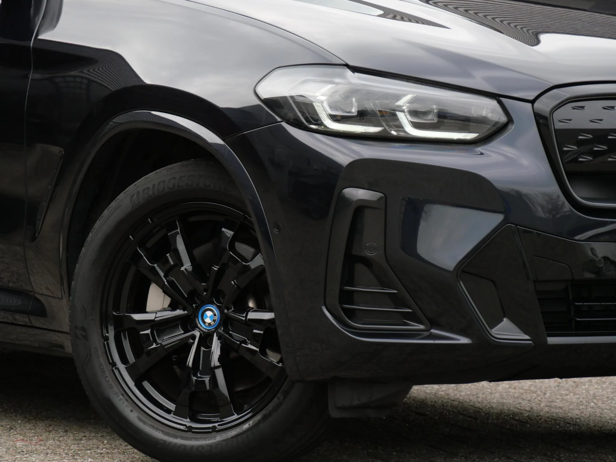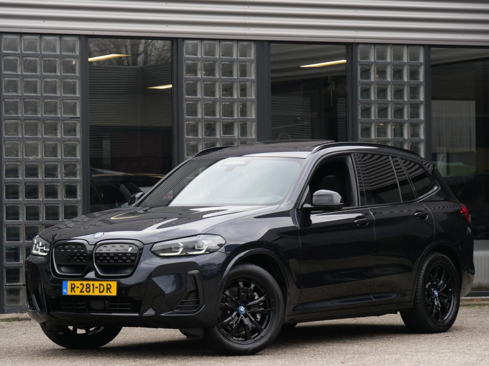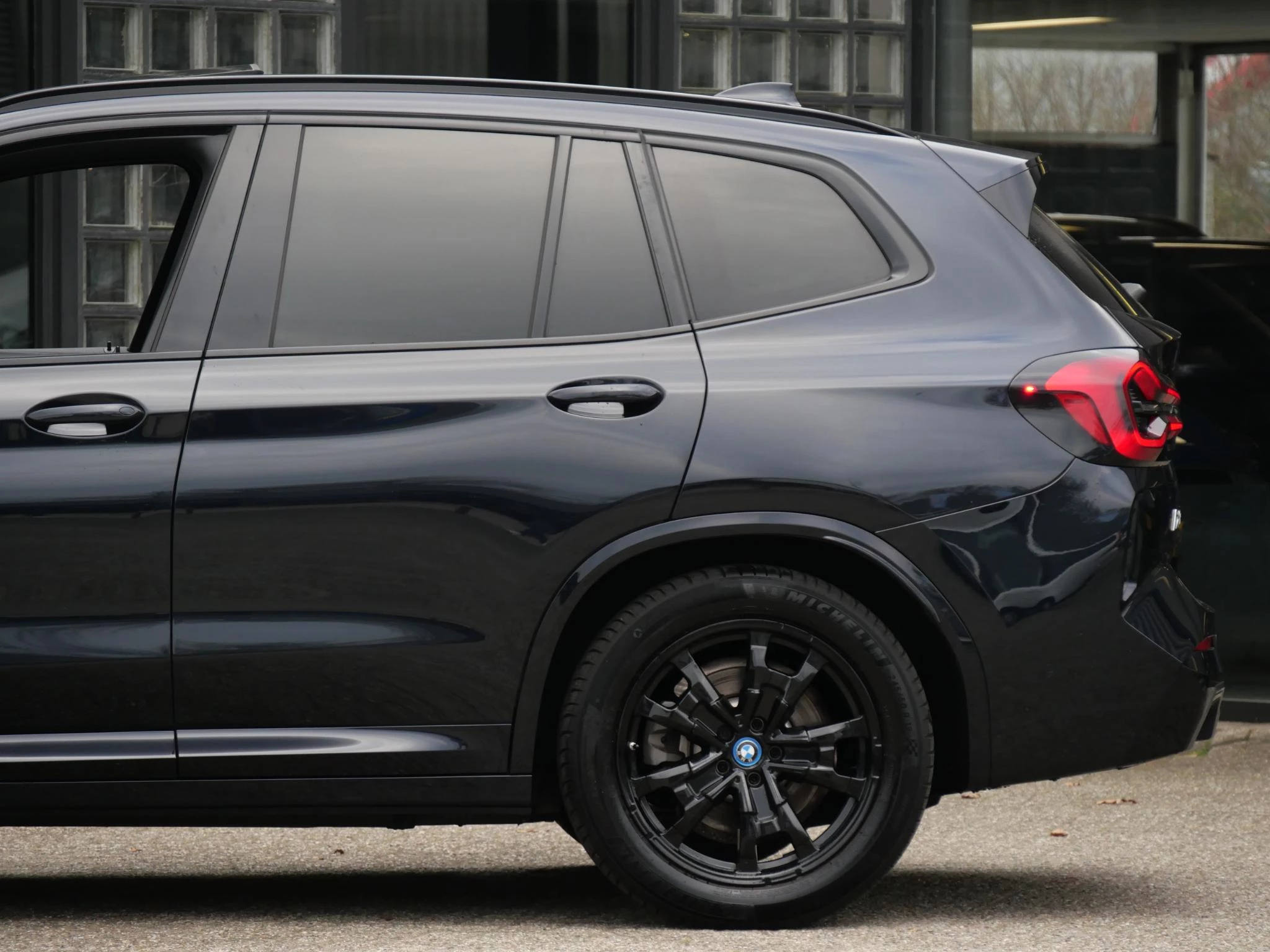 Erg fraai is de kleurstelling, wat ons betreft de ultieme configuratie voor de iX3. De carrosserie is gespoten in de populaire BMW M-Sport kleur 'Carbonschwarz Metallic'. Het interieur is volledig in zwart leder uitgevoerd. Als extra fabrieksoptie is dit exemplaar voorzien van het 'Shadow Line' pakket. Hierdoor zijn de achterste ramen extra getint uitgevoerd, is de iX3 voorzien van hoogglans zwarte exterieuraccenten zoals de raamlijsten, dakrails en grille en zijn de Matrix LED-koplampen donker uitgevoerd. De hemelbekleding is in het antraciet uitgevoerd voor een luxere uitstraling.