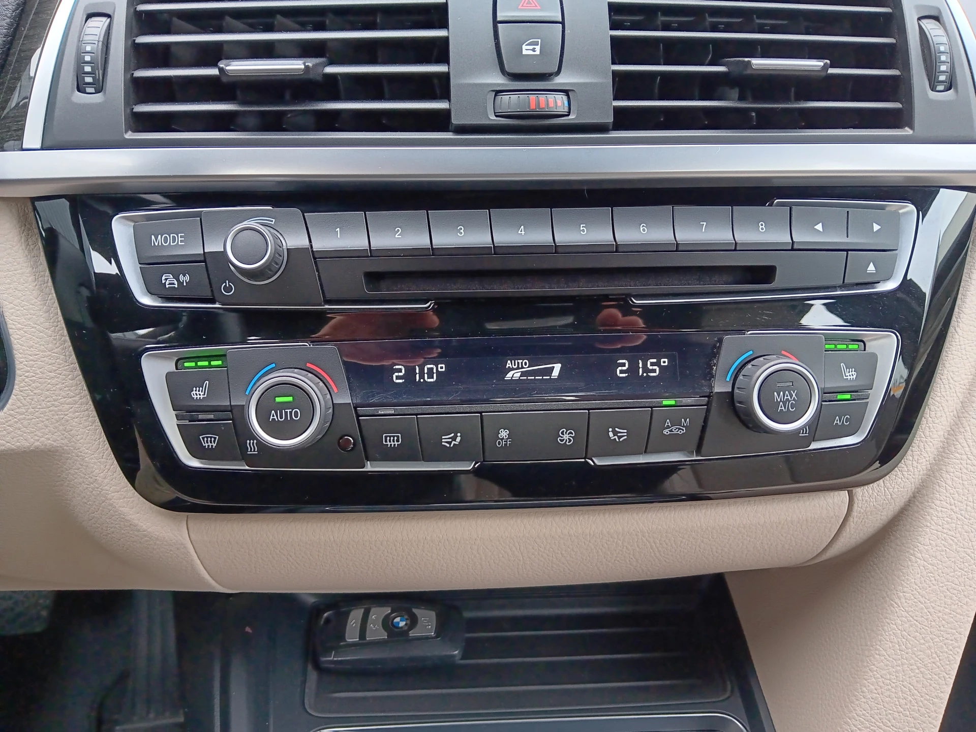 Onderaan de keuzehendel van deze top-automaat staat het knopje waar het in deze 330e allemaal om draait: “eDrive”. Daarmee kies je de rijmodus: “Auto eDrive” voor de combinatie van elektro- en verbrandingsmotor (tot 80 km/u), “Max eDrive” voor alleen de elektromotor (tot 120 km/u en met maximum 30 km rijbereik) en “Save Battery” voor alleen de verbrandingsmotor.