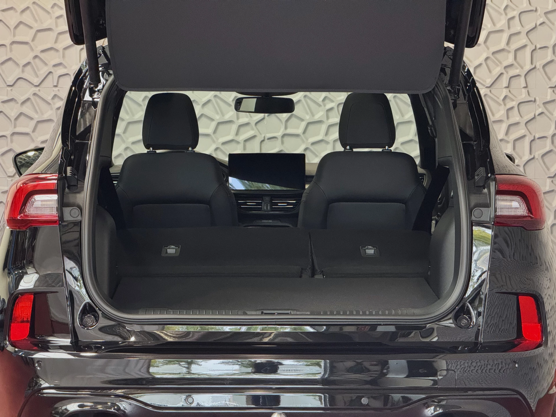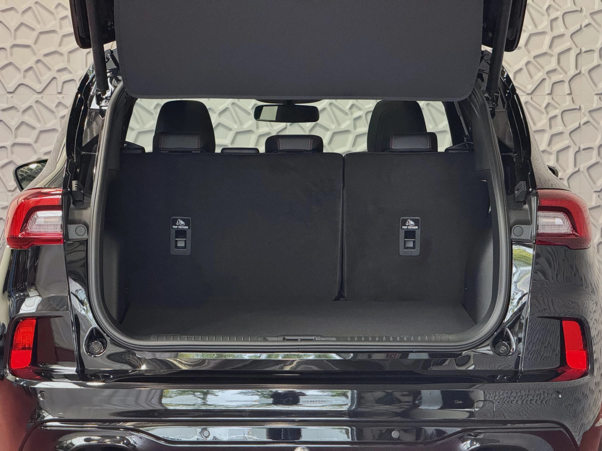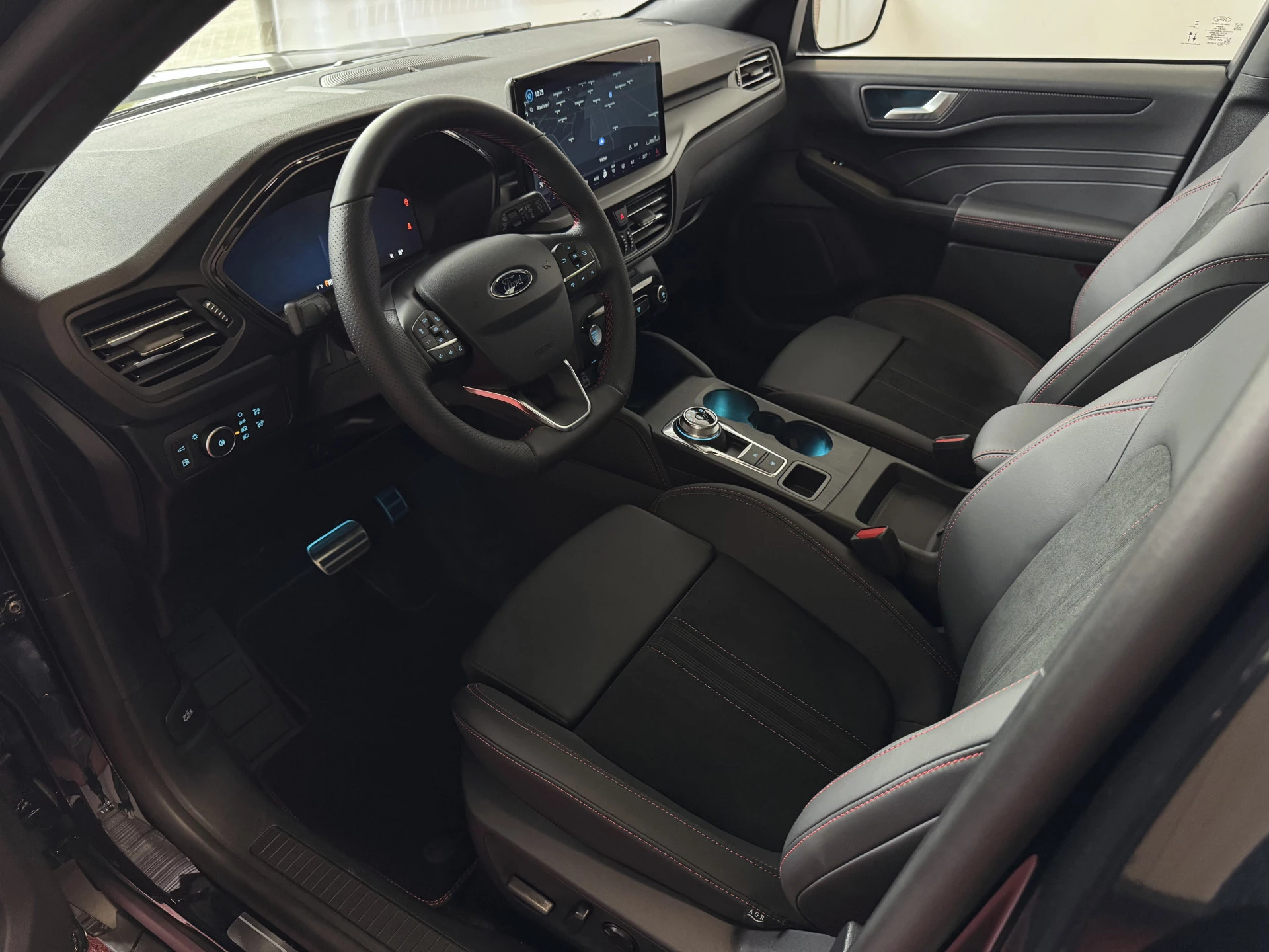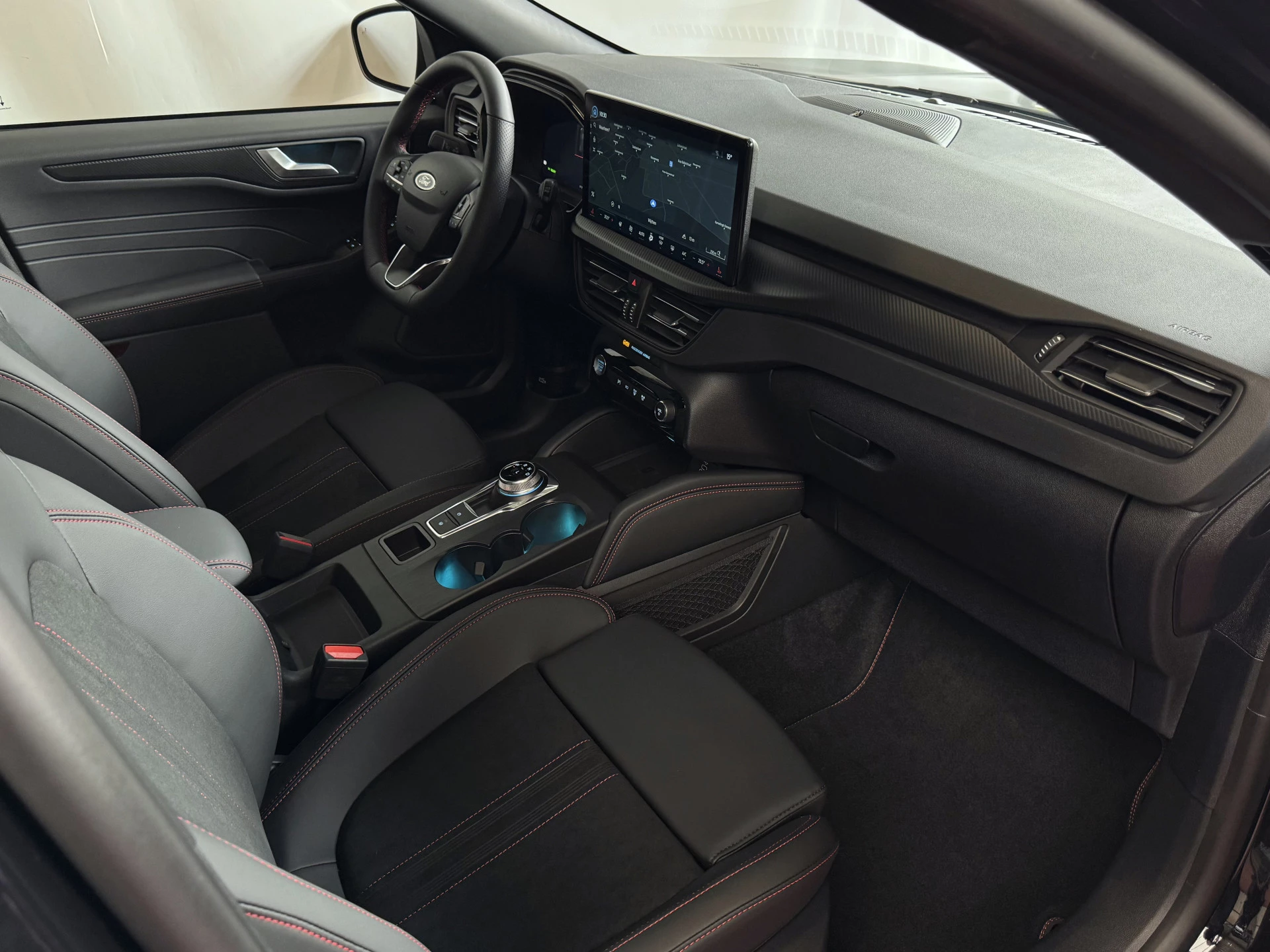 Donkere hemelbekleding en ST-design vloermatten: sportieve afwerking van het interieur.