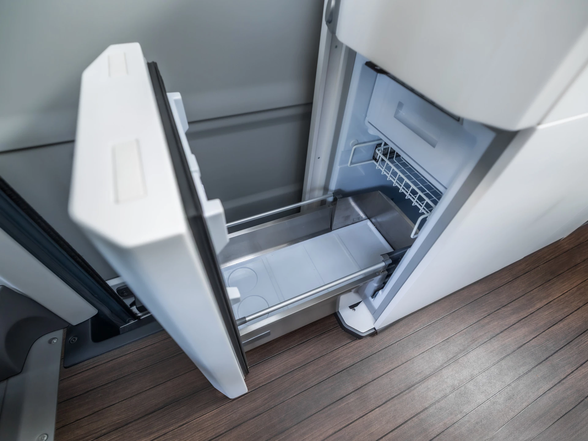 Het interieur is slim ontworpen en afgewerkt met hoogwaardige materialen. De camper biedt een prettige leefruimte met comfortabele zitplaatsen en een rustige, moderne uitstraling.
