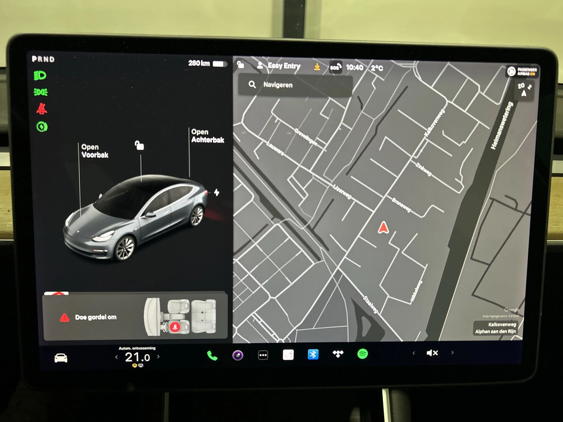 Adaptive cruise control houdt de ingestelde snelheid vast en houdt automatisch afstand tot uw voorligger. Wat wilt u onderweg horen? Er is volop keus, dankzij bluetooth. Het full map navigatiesysteem is met het audio-installatiesysteem gecombineerd. Of het buiten nu warm is of koud, dankzij electronic climate control is het binnen altijd behaaglijk. Met de keyless entry ontgrendelt deze Tesla Model 3 zich automatisch als u het portier wilt openen. Met de elektronische sleutel in uw zak en met één druk op de knop start u de auto. Dat is keyless start! De Tesla is standaard voorzien van: dashboard met spraakbediening, WIFI-hotspot en automatisch dimmende buitenspiegels.
