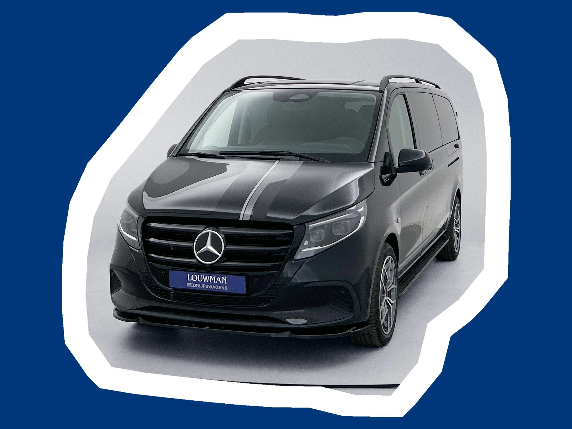 Het interieur is voorzien van een exclusieve leder/alcantara bekleding met witte stiksels – niet alleen op de voorstoelen, maar ook de volledig aangepaste tweede zitrij is in dezelfde hoogwaardige stijl uitgevoerd. Zo biedt deze dubbele cabine niet alleen ruimte, maar ook comfort en uitstraling voor alle inzittenden. De buitenkant is voorzien van een strakke striping in wit, zwart en grijs, wat het sportieve karakter van de Vito versterkt zonder over de top te gaan.