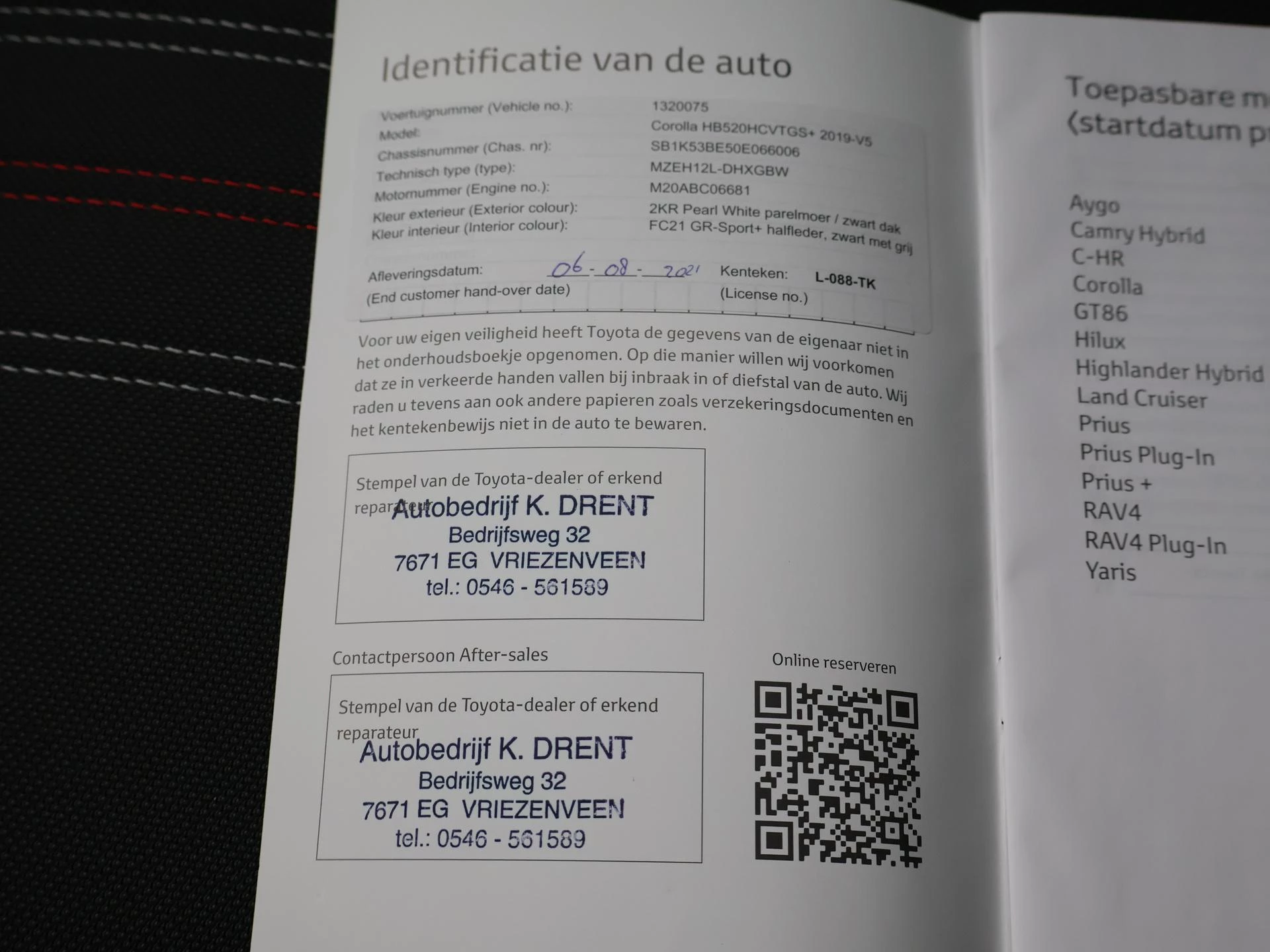 Origineel Nederlandse auto en 1e eigenaar met slechts 13.792 km, Volledig Toyota dealer onderhouden, onderhoud gehad bij 3.719 km, 7.918 km en 11.342 km. GR-Sport Plus Bi-Tone uitvoering in het wit parelmoer met zwart zak en zwarte spiegels, 18 inch lichtmetalen velgen, Half leder sportinterieur, Head-up display, Adaptive cruise control, Dodehoek assistentie, Privacy glass, Full LED koplampen, LED achterlichten, Navigatie, Apple Carplay / Android Auto appstreaming Google Maps, Flitsmeister, Whatsapp, Spotify etc, Stoelverwarming, Climate control, Parkeersensoren voor + achter, Digitale cockpit / tellers, Achteruitrijcamera, Draadloze telefoonlader, Lijnassistentie, Leder stuurwiel, Zwarte hemelbekleding, Keyless-entry en keyless-drive, Bluetooth telefoon met audiostreaming.