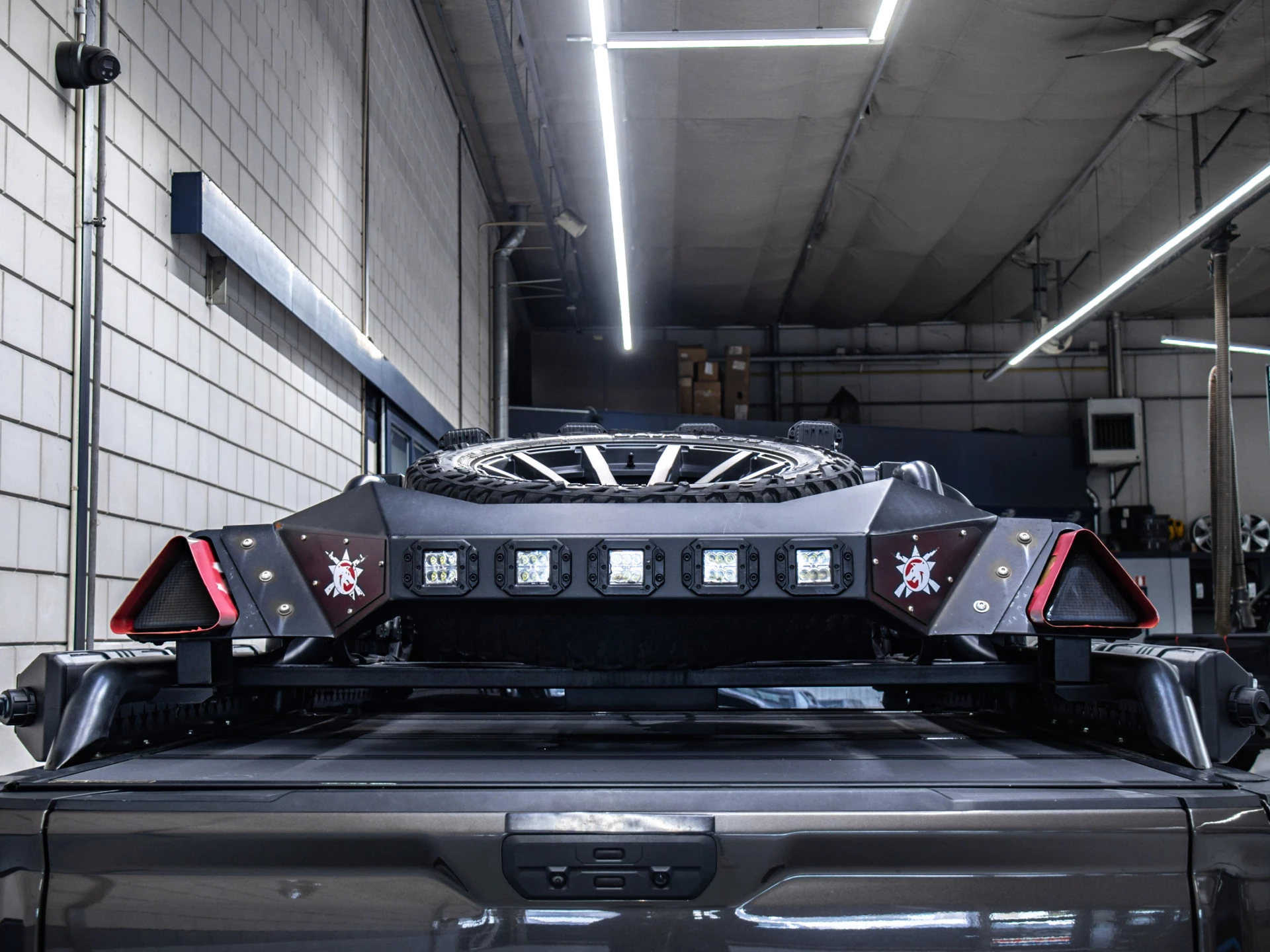 De truck is uitgerust met een stoer roof rack inclusief reservewiel, wat direct de robuuste uitstraling versterkt. De vier daklampen geven niet alleen extra zicht in het donker, maar maken het geheel ook visueel af. In combinatie met de custom velgenset en offroad banden staat hier een Sierra die echt opvalt, waar je ook komt. De auto heeft ook een BDS lift kit wat hem echt de finishing touch geeft.