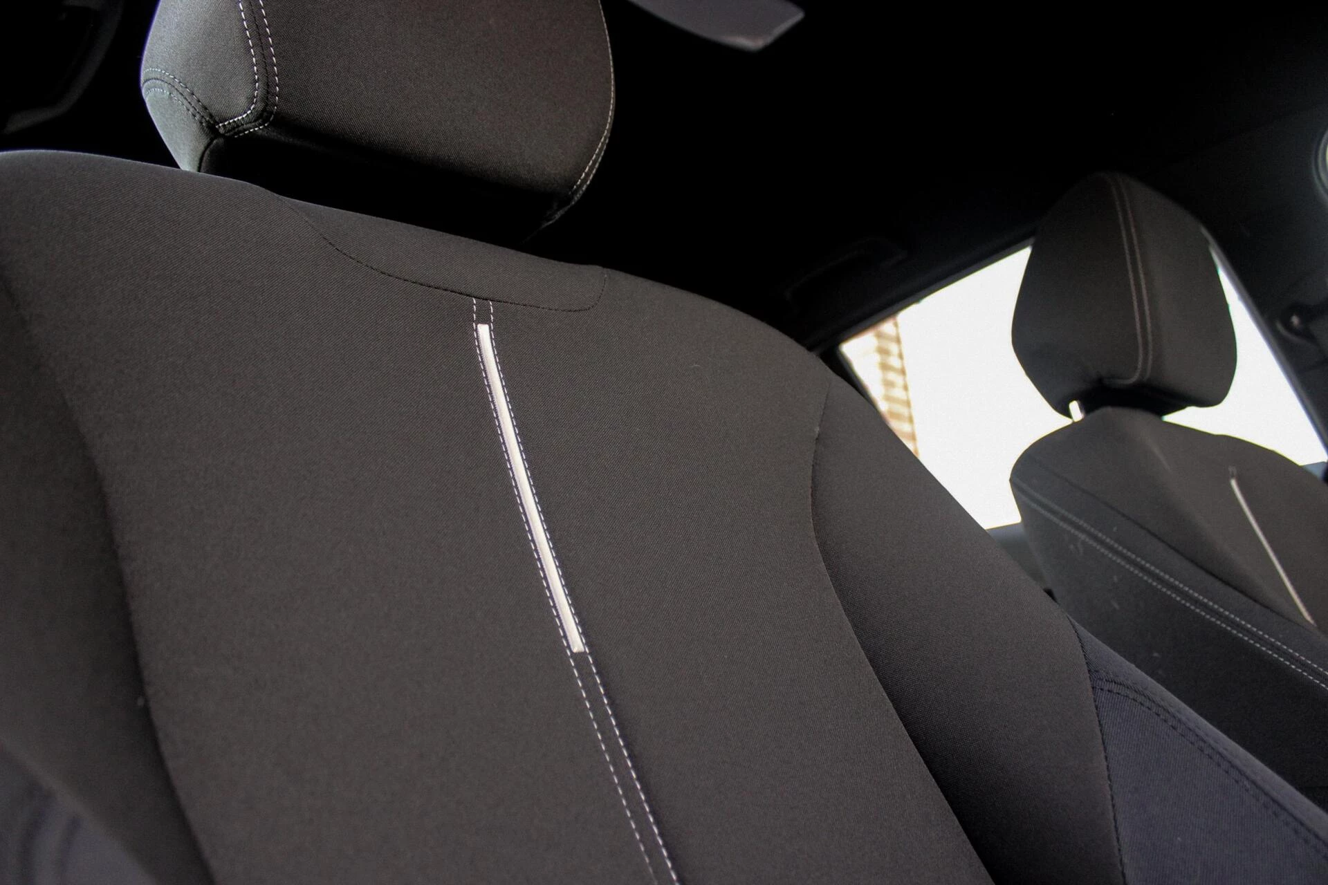 Van binnen een zwart Sport-interieur met aluminium dashboard inleg en zwart kleurige hemelbekleding. Achterin een deelbare achterbank met ISO-fix aansluitingen.