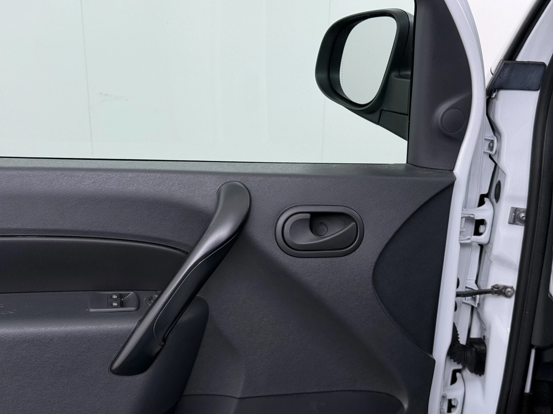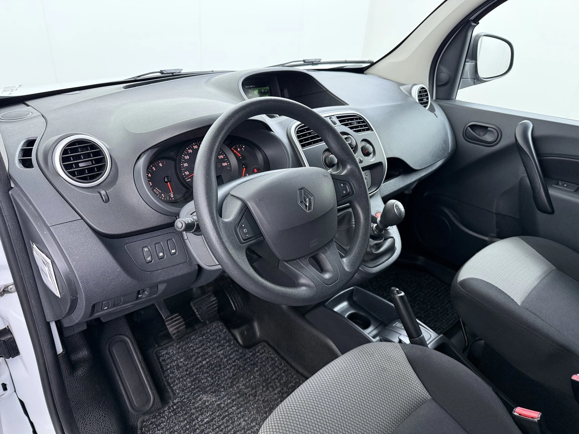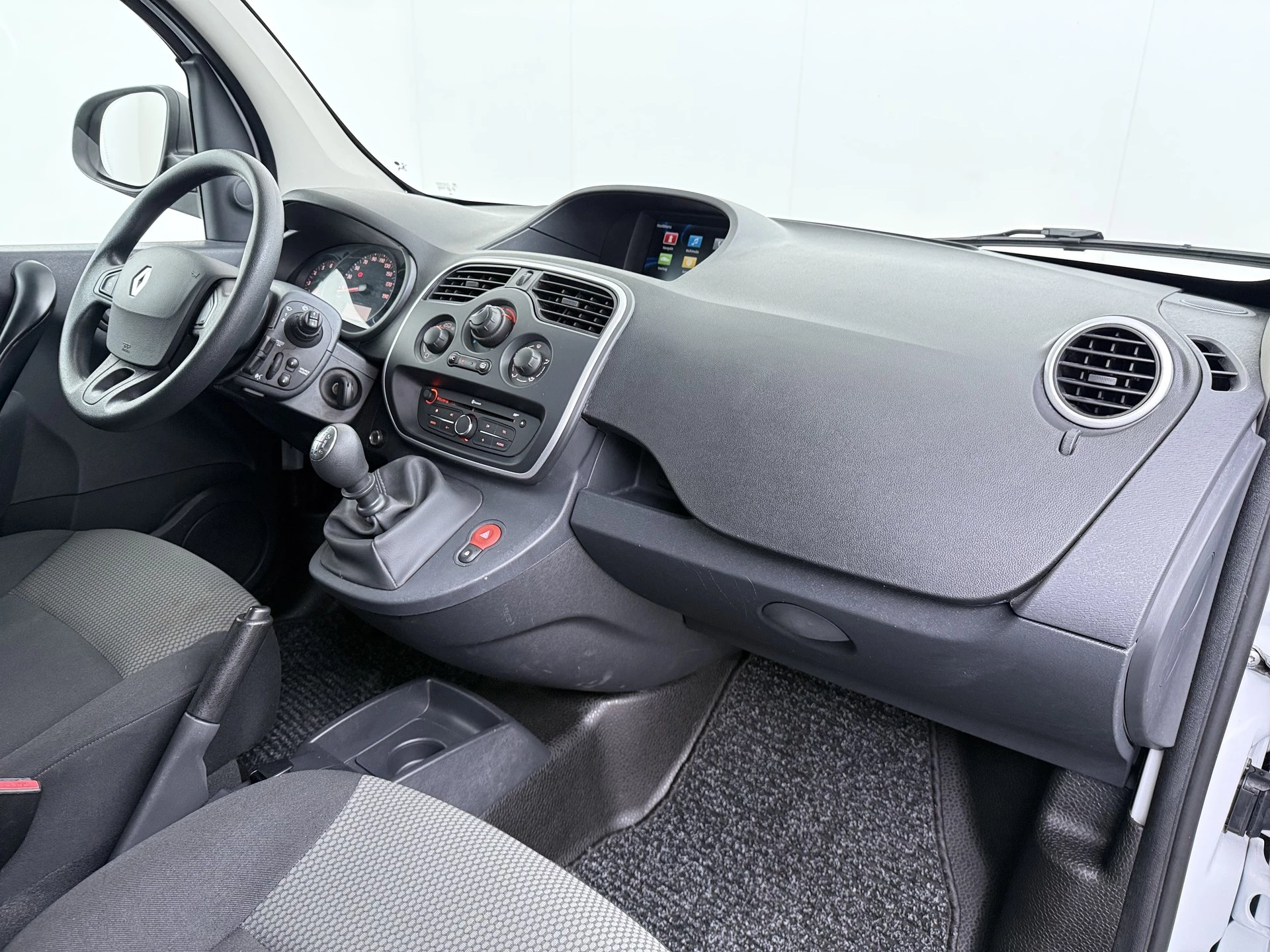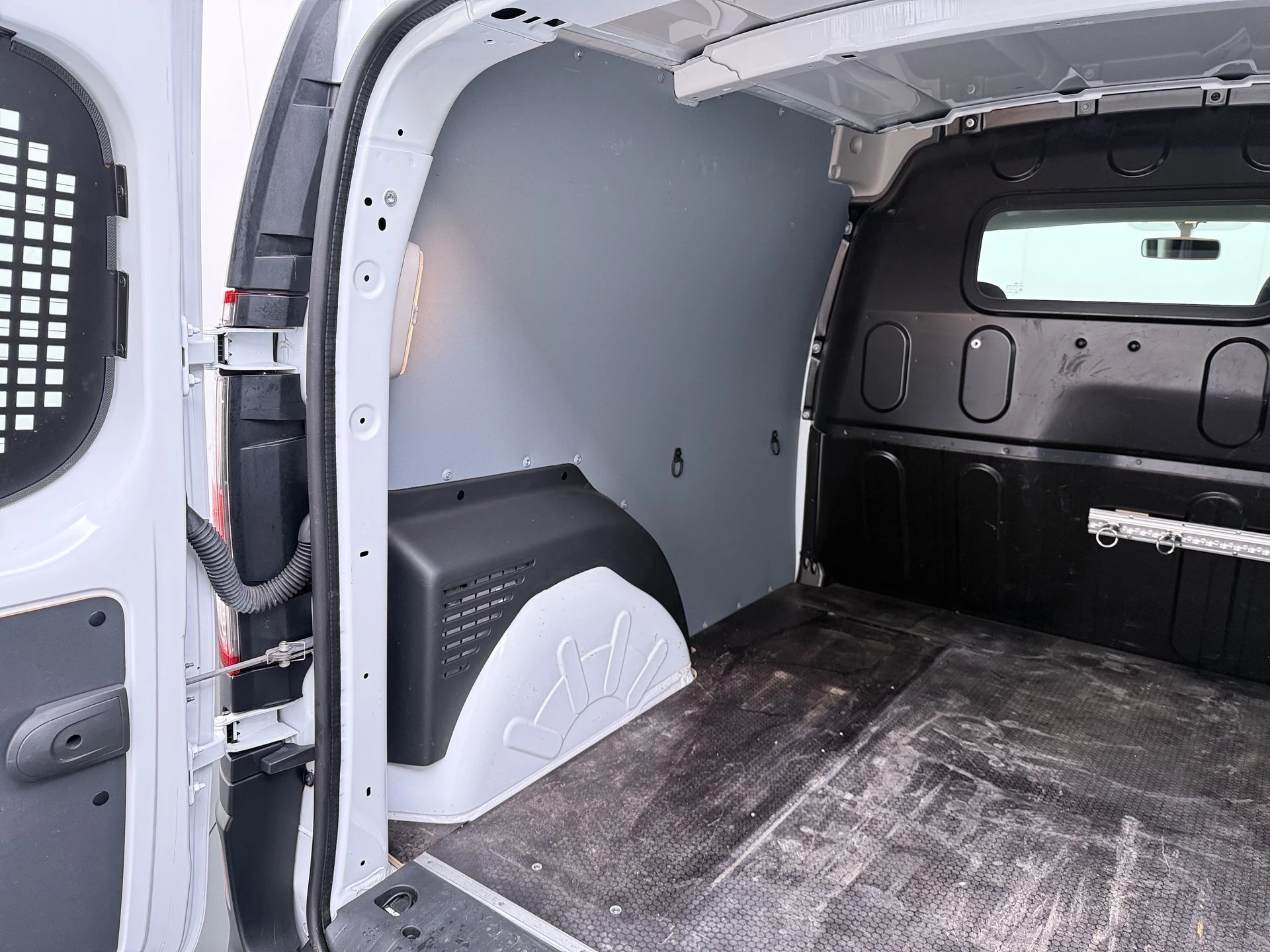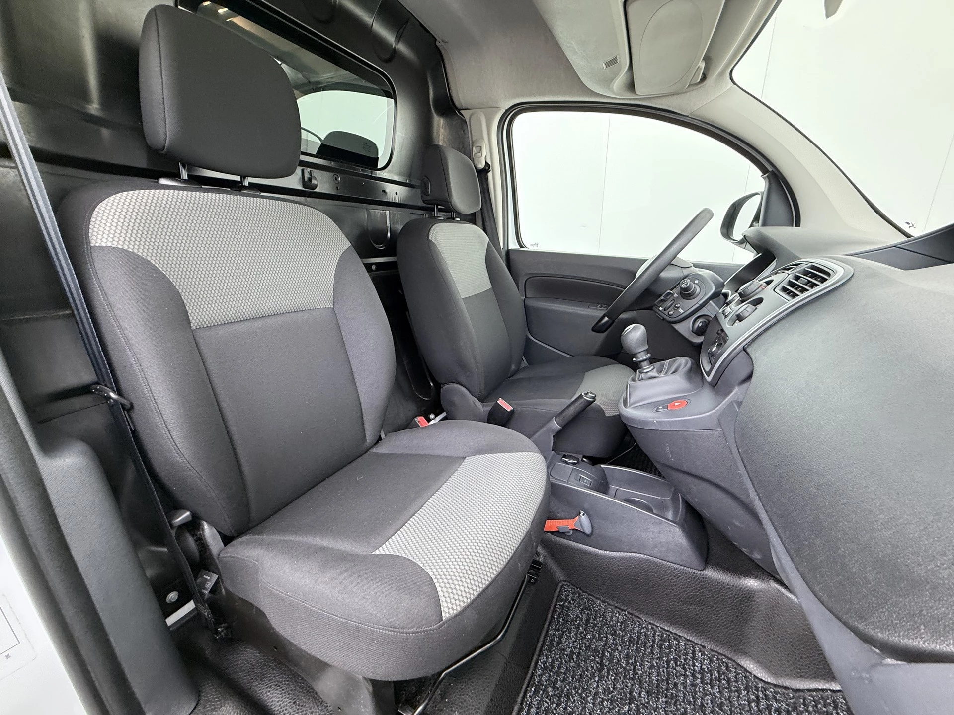 Het tussenschot heeft een ruit en de achterdeuren en de schuifdeuren hebben ramen. Hierdoor veel zicht voor een bedrijfswagen. De laadruimte van deze Kangoo is netjes betimmerd en voorzien van een professionele betonplex vloer.