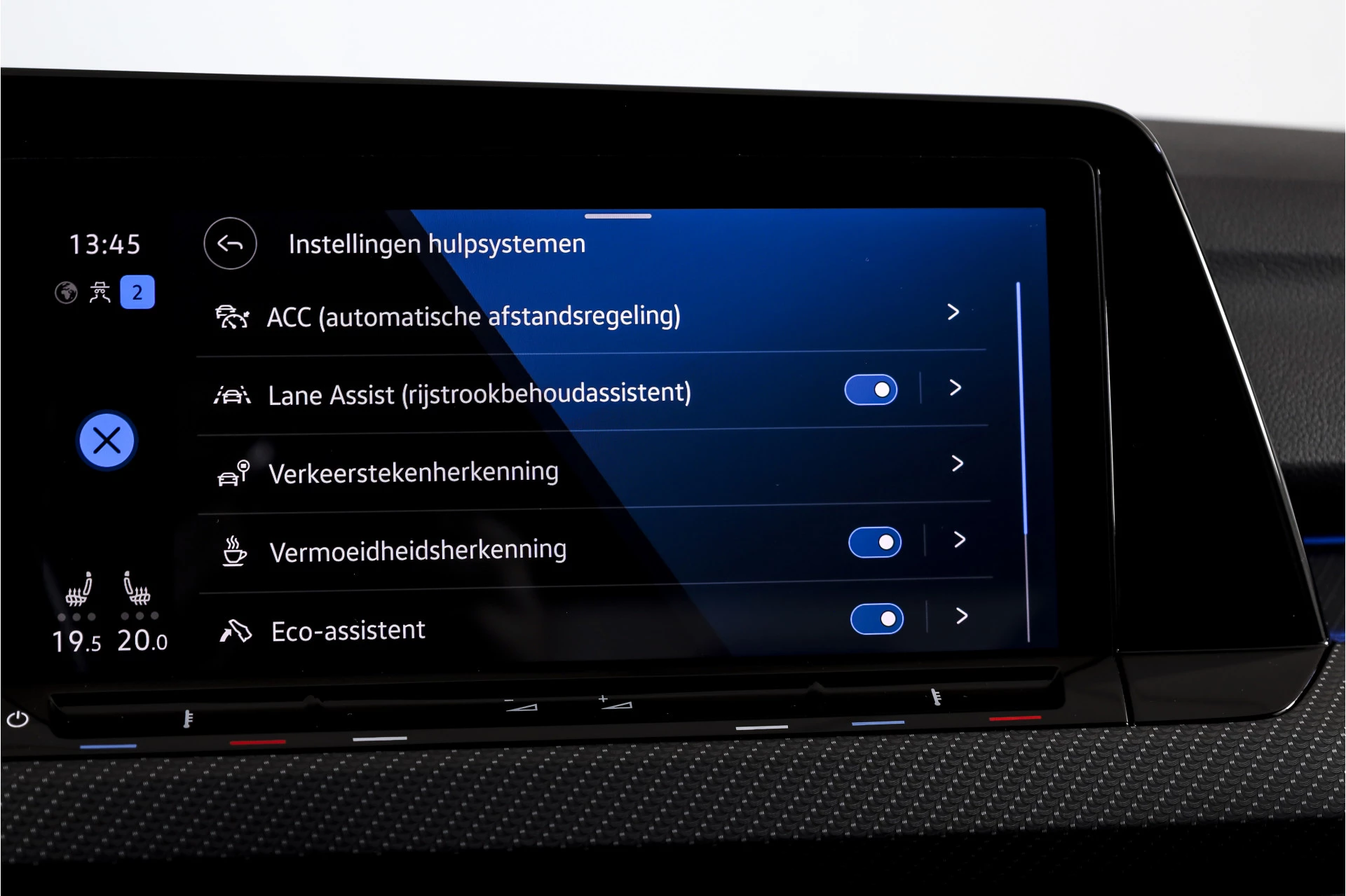 Een duidelijk pluspunt in de praktijk zijn de parkeersensoren voor en achter, die samen met de achteruitrijcamera helpen bij het inparkeren, ook in krappe situaties. Het rijden zelf wordt ondersteund door adaptieve cruise control met stop&go en stuurhulp, wat vooral op langere ritten voor rust zorgt.