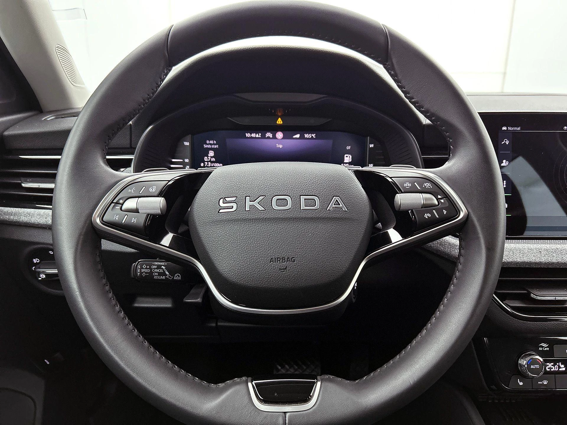 Een cockpit, een informatiecentrum... Wat is de cabine eigenlijk niet? Dankzij het digitale dashboard bent u van alles op de hoogte. Altijd achter zicht, nooit meer nekkramp! De achteruitrijcamera maakt het supermakkelijk. Adaptive cruise control is een comfortabele en veilige optie. Het systeem reguleert de snelheid en houdt automatisch afstand tot uw voorligger. Uw smartphone is tegenwoordig de sleutel tot heel veel. Ook voor deze auto. Remote services, noemen we dat. Waar u ook bent, contact houden is een eitje. De bediening van het audiosysteem en het navigatiesysteem met harde schijf gebeurt met knoppen op het stuur en als u wilt zelfs met uw stem. De audio is overigens voorzien van DAB-radio voor een altijd heldere ontvangst. Deze Skoda is voorzien van electronic climate control, draadloos opladen, regensensor, automatisch dimmende binnenspiegel, isofix-aansluiting en centrale deurvergrendeling met afstandsbediening.