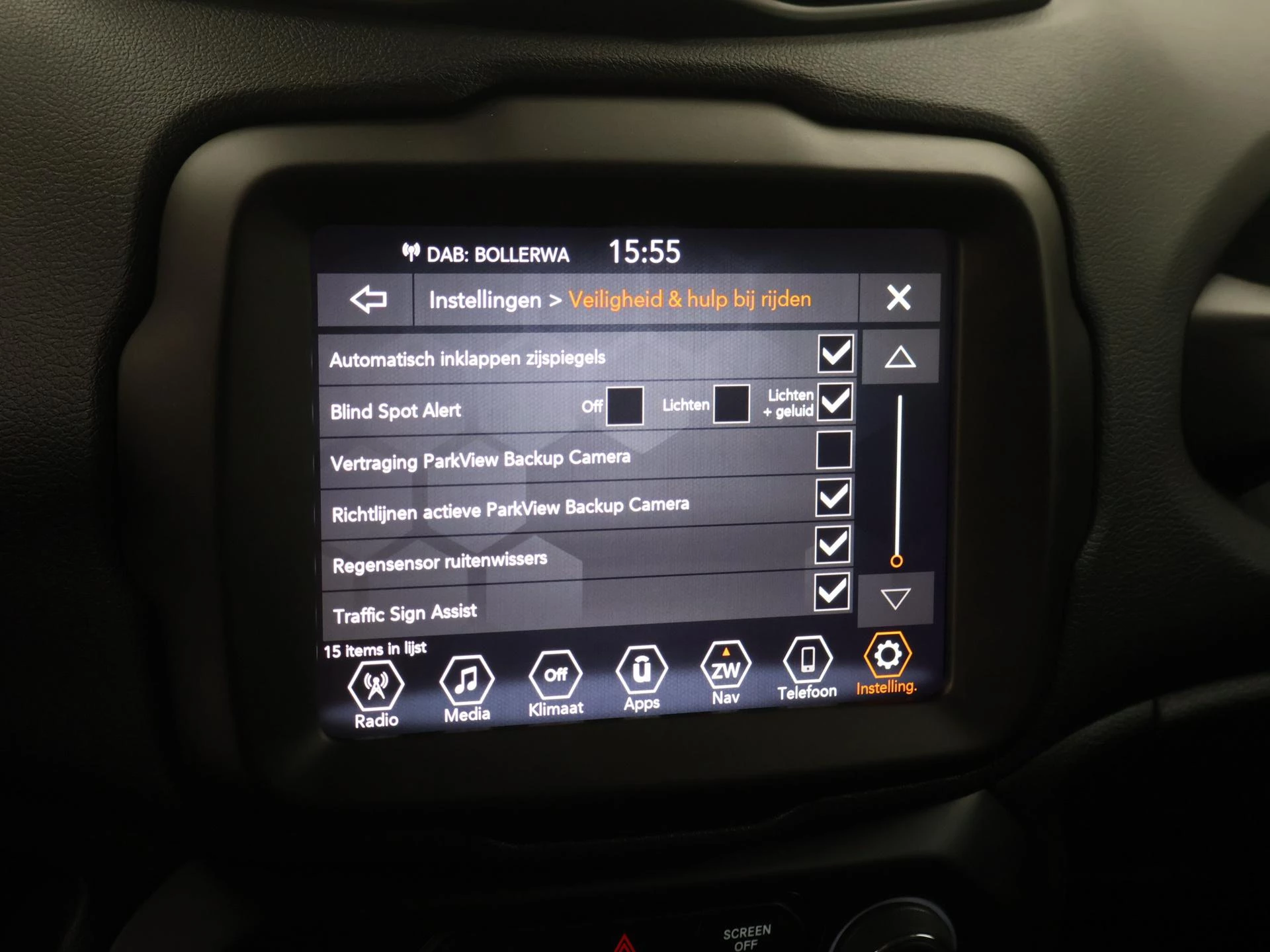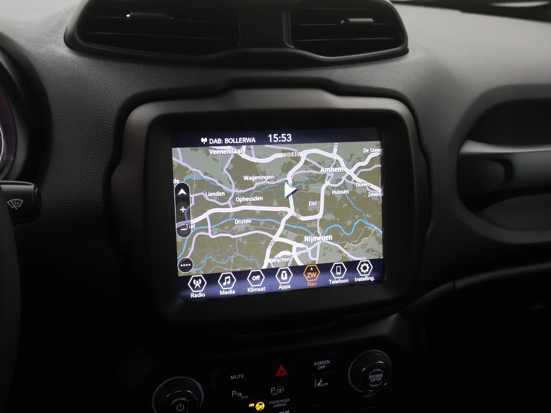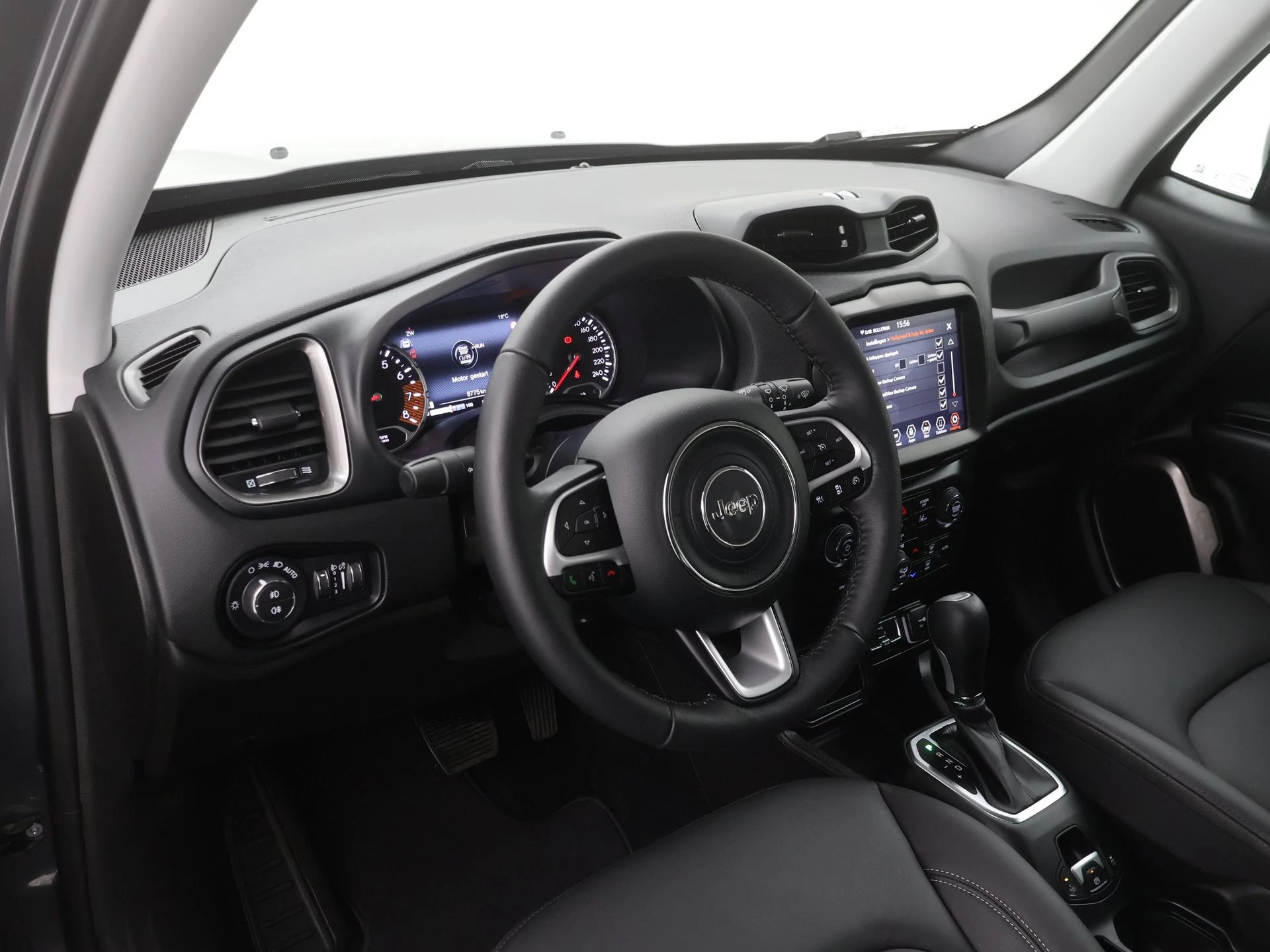 De achteruitrijcamera geeft u duidelijk zicht op de ruimte achter de auto. Adaptive cruise control houdt de ingestelde snelheid vast en houdt automatisch afstand tot uw voorligger. In deze Renegade vindt u schakelaars op het stuur om het full map navigatiesysteem te bedienen en het audiosysteem met DAB-ontvangst. Dankzij automatische airconditioning is het interieur behaaglijk warm of verfrissend koel. Het hoort bij een intelligente auto als deze dat hij zelf in staat is om zijn omgeving in de gaten te houden. Dat doet deze Jeep met een automatisch inschakelbare verlichting en een regensensor. De uitrusting van deze auto is met keyless entry, automatisch dimmende binnenspiegel, centrale deurvergrendeling met afstandsbediening en lederen versnellingspook behoorlijk compleet.