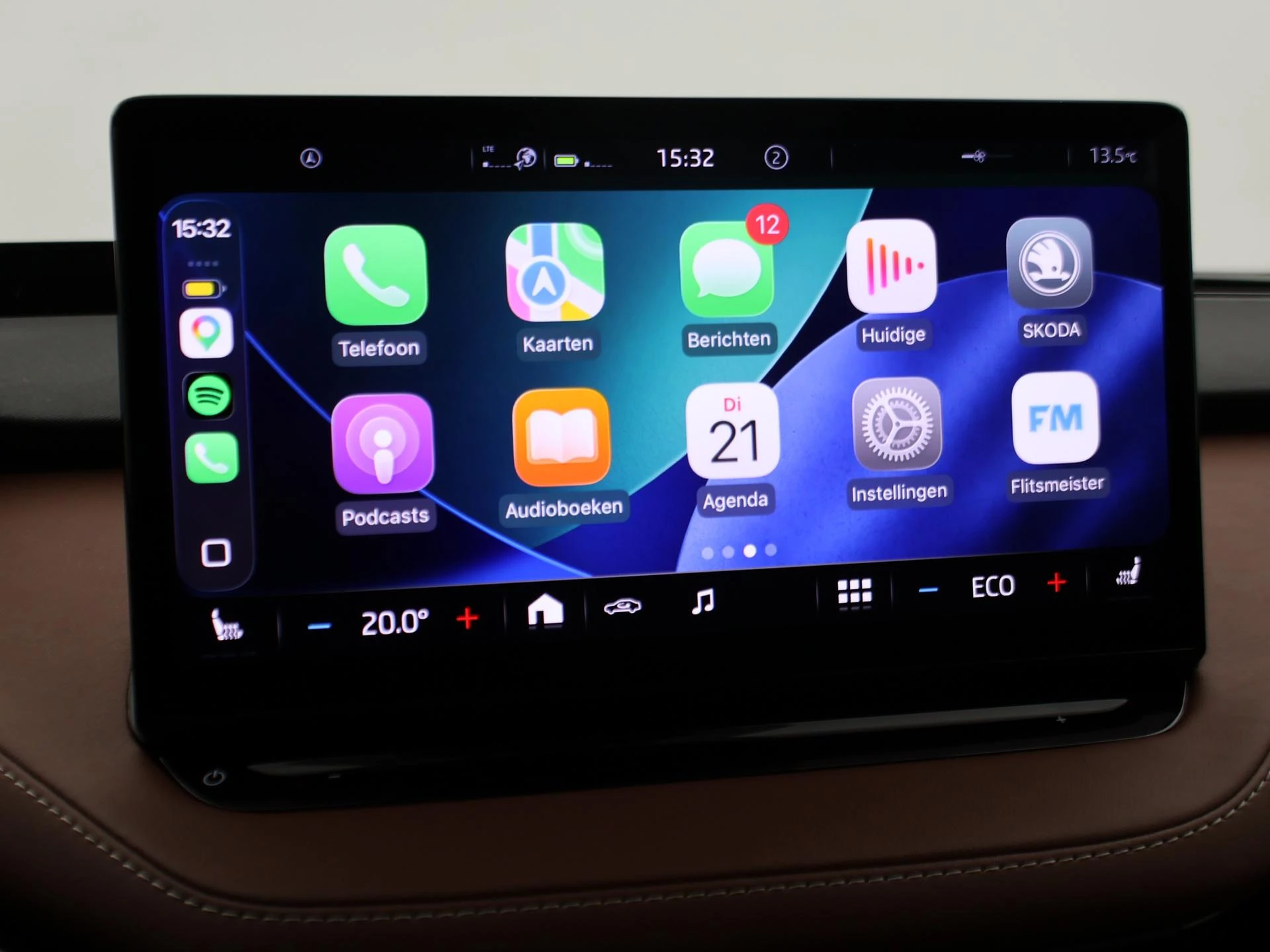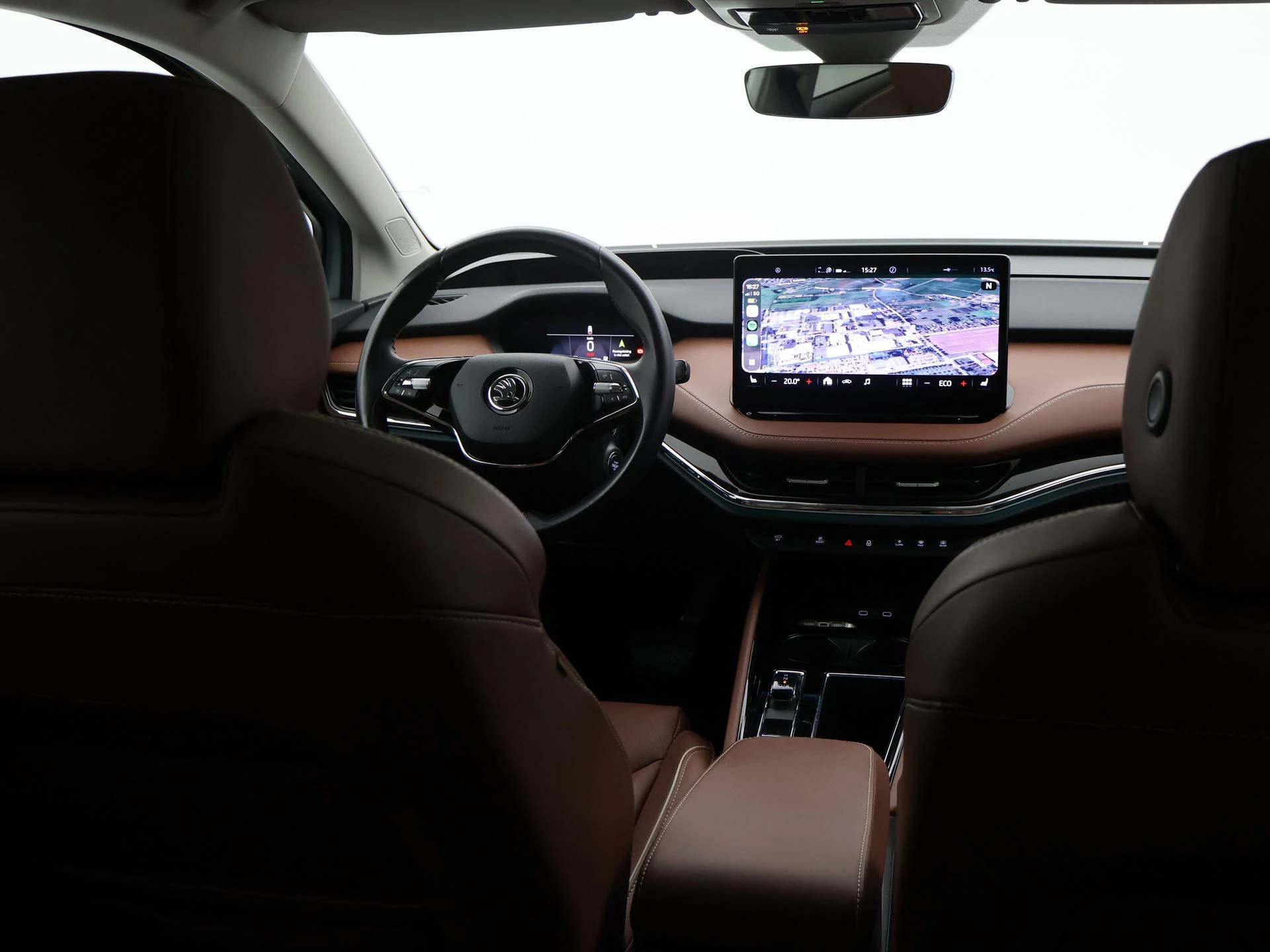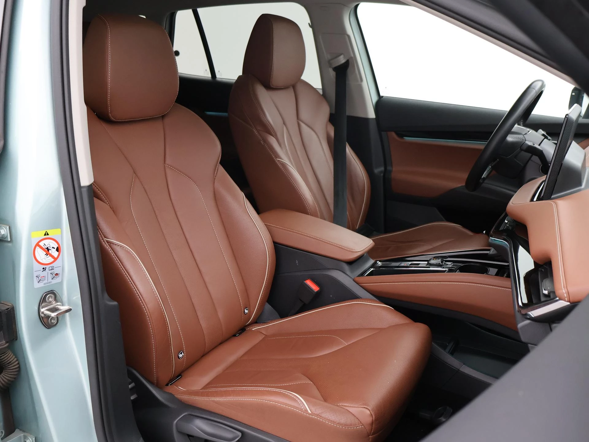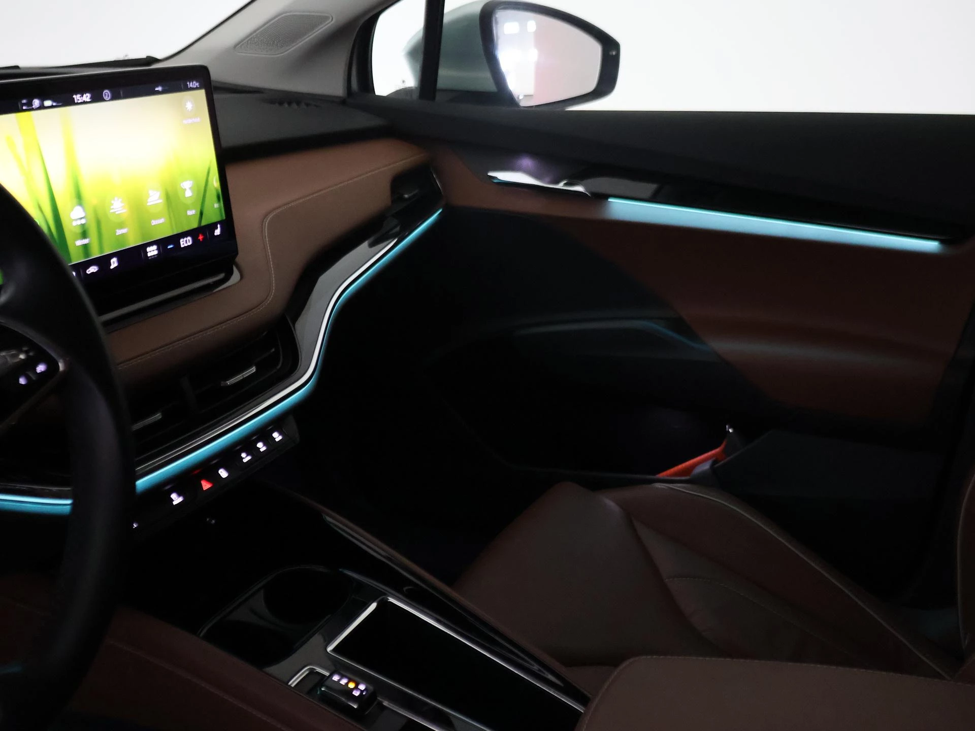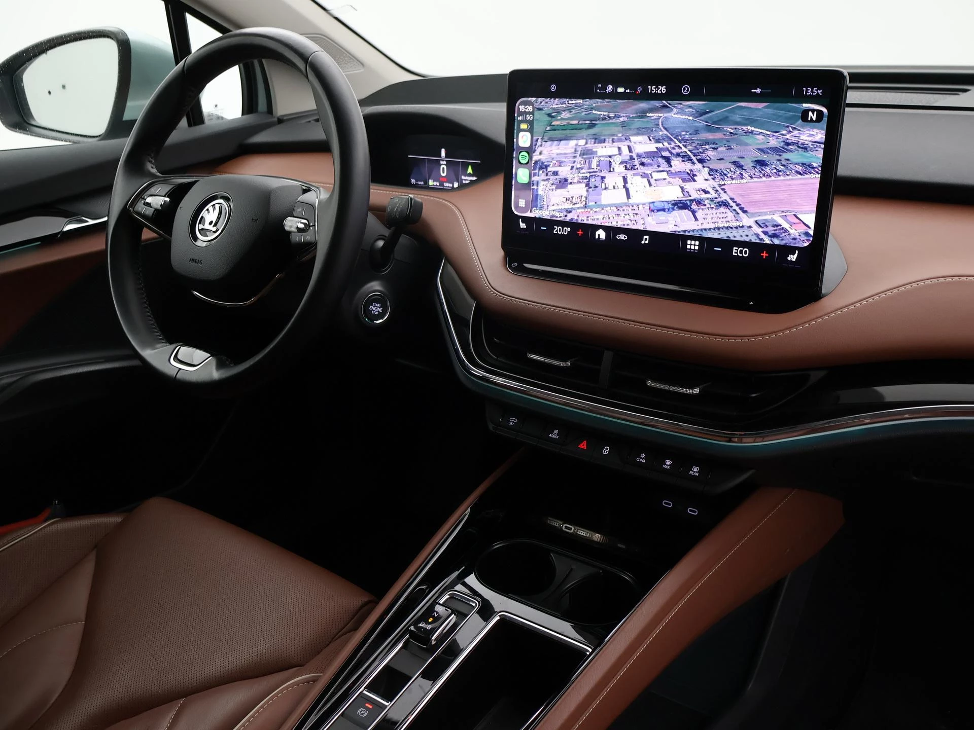 Origineel Nederlandse Enyaq IV van 2021 in het Arctic Silver (lichtgroen) met Cognac volledig leder interieur (top kleurcombinatie), SOH 93% zie rapport tussen de foto's, Elektrische trekhaak, Elektrisch panorama-dak, Achteruitrijcamera, Sfeerverlichting met verschillende kleuren, Botsherkenning, Head-up display, Stoelverwarming, Lijnassistentie, Verkeersbordenherkenning, Navigatie, Apple Carplay, Android Auto, DAB Digitale radio, Bluetooth, Climate control, Elektrische achterklep, Standkachel/Voorklimatiseren, Cruise control, 19 inch lichtmetalen velgen.