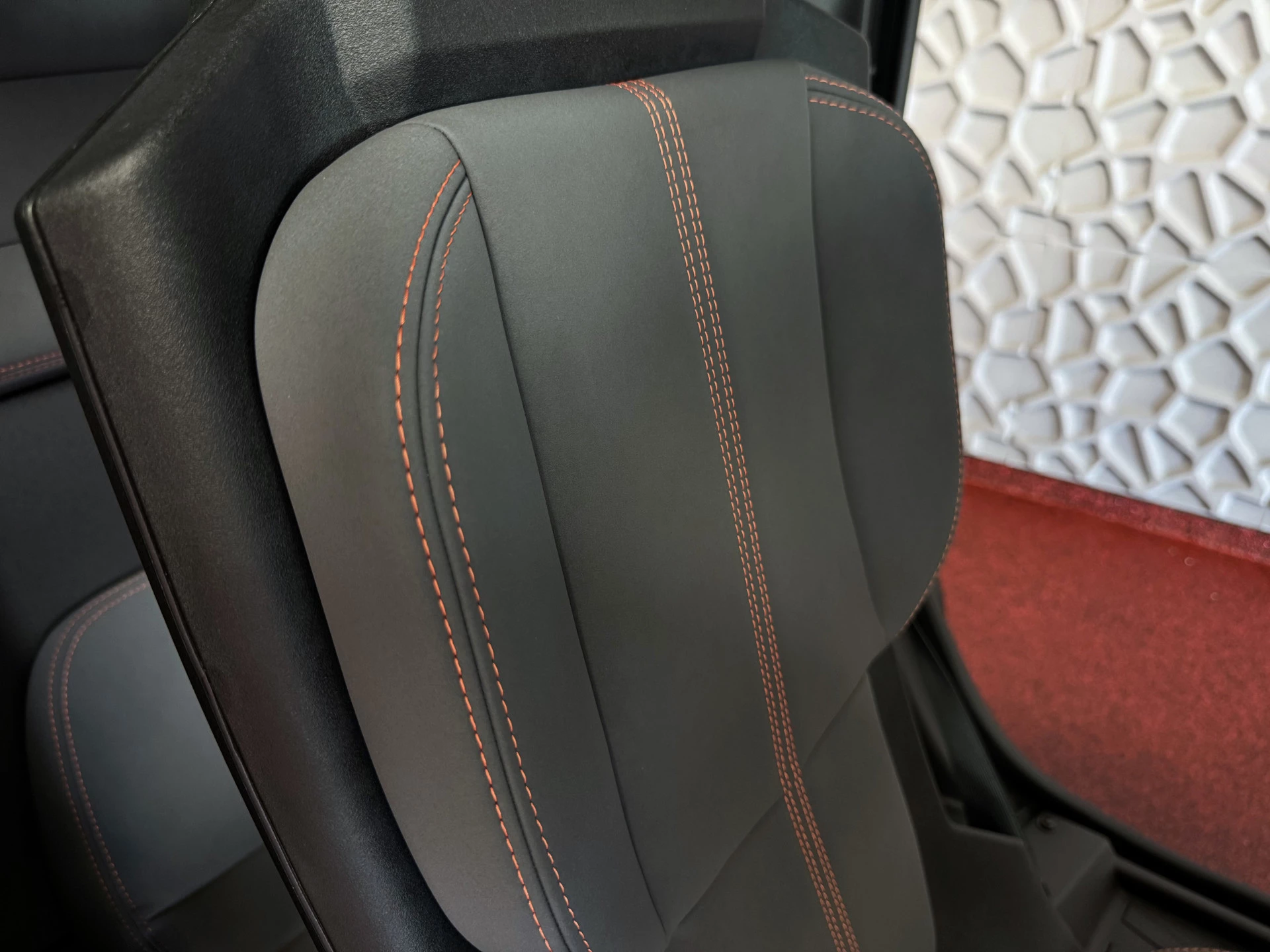 De Mobilize Duo is uitgerust met een premiumstoel. Deze stoel is ontworpen voor comfort en duurzaamheid, met grijze TEP-bekleding en oranje stiksels.