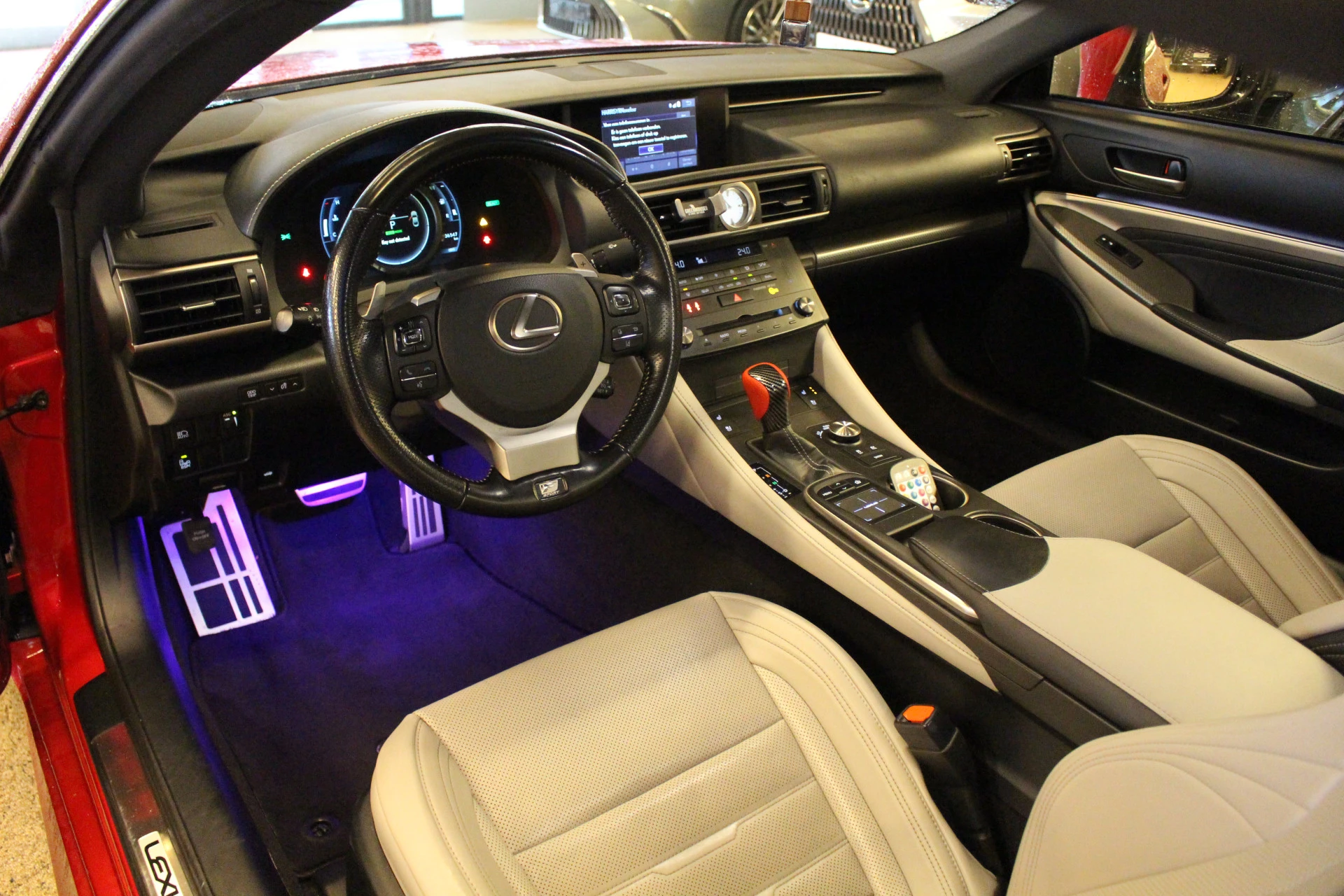 Zeer unieke Lexus RC300h Hybride in de F-Sport Line uitvoering van het bouwjaar 2018 met 136.458 aantoonbare kilometers! Prachtige liefhebberswagen, Lexus dealeronderhouden. Uitgerust in een zeer chique kleurstelling: Infrared Metallic met white nulux leder bekleding (licht grijs). Wat deze mooie RC nog unieker maakt is de sterrenhemel met maar liefst 850 sterren in verschillende kleuren, deze zijn te bedienen via een App op uw telefoon. Geïnspireerd door de ''Rolls Royce Starlight Headliner'' om het interieur nog aangenamer en luxer te maken. Daarnaast is deze Lexus Coupé voorzien van een carbon look front spoiler, carbon look rear spoiler en een remlicht diffuser! Vanwege de kleurstelling oogt deze mooie RC300h nog sportiever, naast zijn mooie looks biedt deze coupe u nog vele luxe opties o.a. elektrisch verstelbare bestuurdersstoel met geheugen, premium navigatie (mocht u applecarplay willen toevoegen dan is dat ook mogelijk via ons), lane keep assist, stoelverwarming, stoelventilatie, multi-led koplampen, dodehoekdetectie en nog meer! Bent u op zoek naar een coupe die zowel een luxe als sportieve uitstraling heeft, betrouwbaar is, zuinig en comfortabel rijdt met vele luxe? Dan is dit wellicht de Lexus voor u!