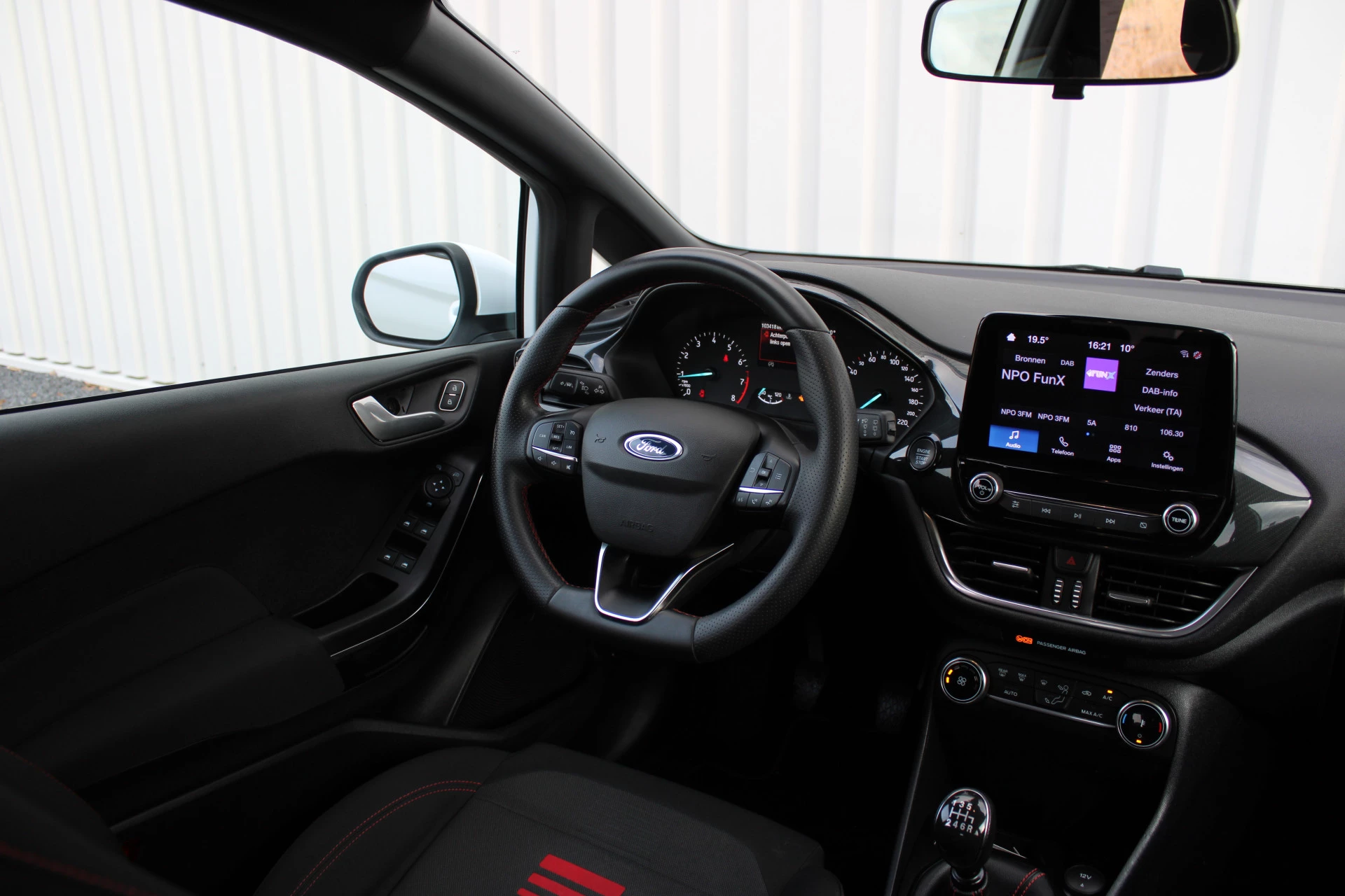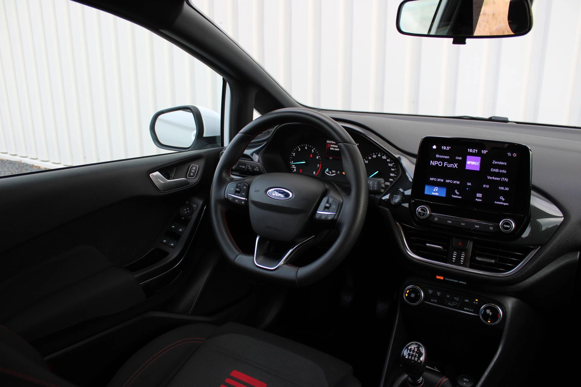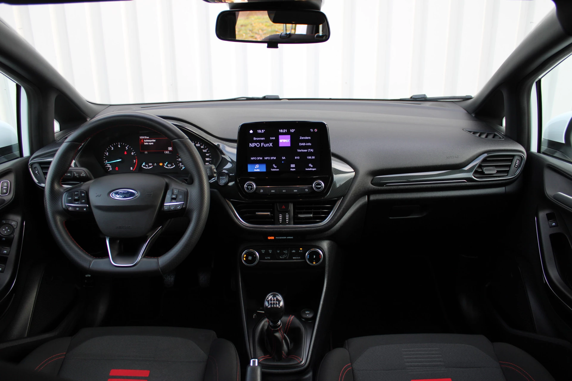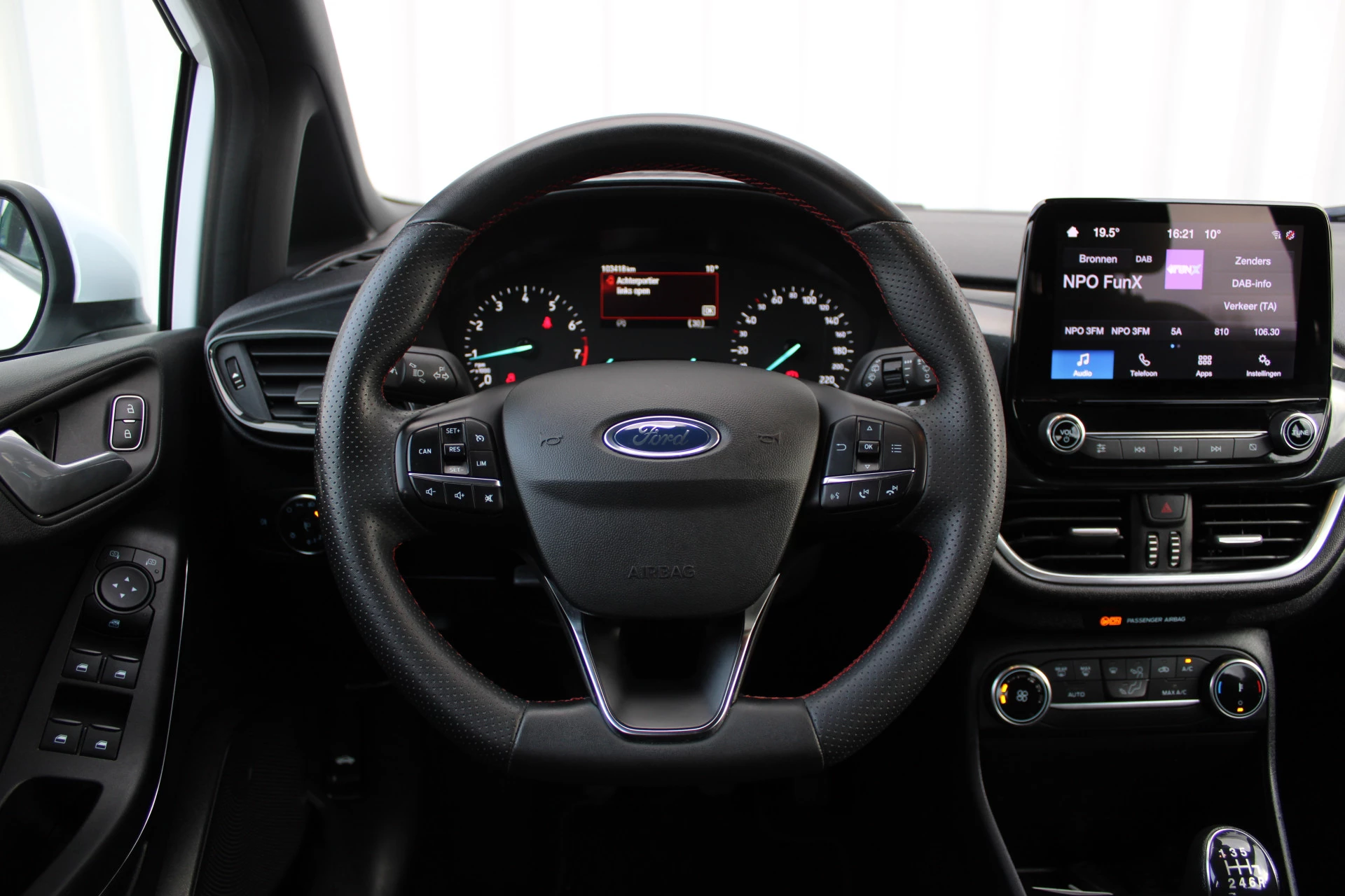 Ingebouwde spraakbediening maakt het mogelijk om de auto te bedienen zonder dat uw aandacht wordt afgeleid. Mocht zich een probleem voordoen, dan krijgt u via remote services op uw smartphone te zien wat er precies aan de hand is, waar u ook bent. Omdat u nu eenmaal niet overal ogen heeft, is deze Ford Fiesta voorzien van een achteropkomend verkeer waarschuwing die registreert wanneer de afstand tot uw achterligger te krap is. Met de automatische airconditioning selecteert u de gewenste temperatuur. Het systeem doet de rest. Voor een storingvrije radio-ontvangst zorgt de ingebouwde DAB-ontvanger. En dan is deze auto ook nog eens voorzien van parkeersensoren achter, cruise control, sportstuurwiel, keyless entry, centrale deurvergrendeling met afstandsbediening en boordcomputer.