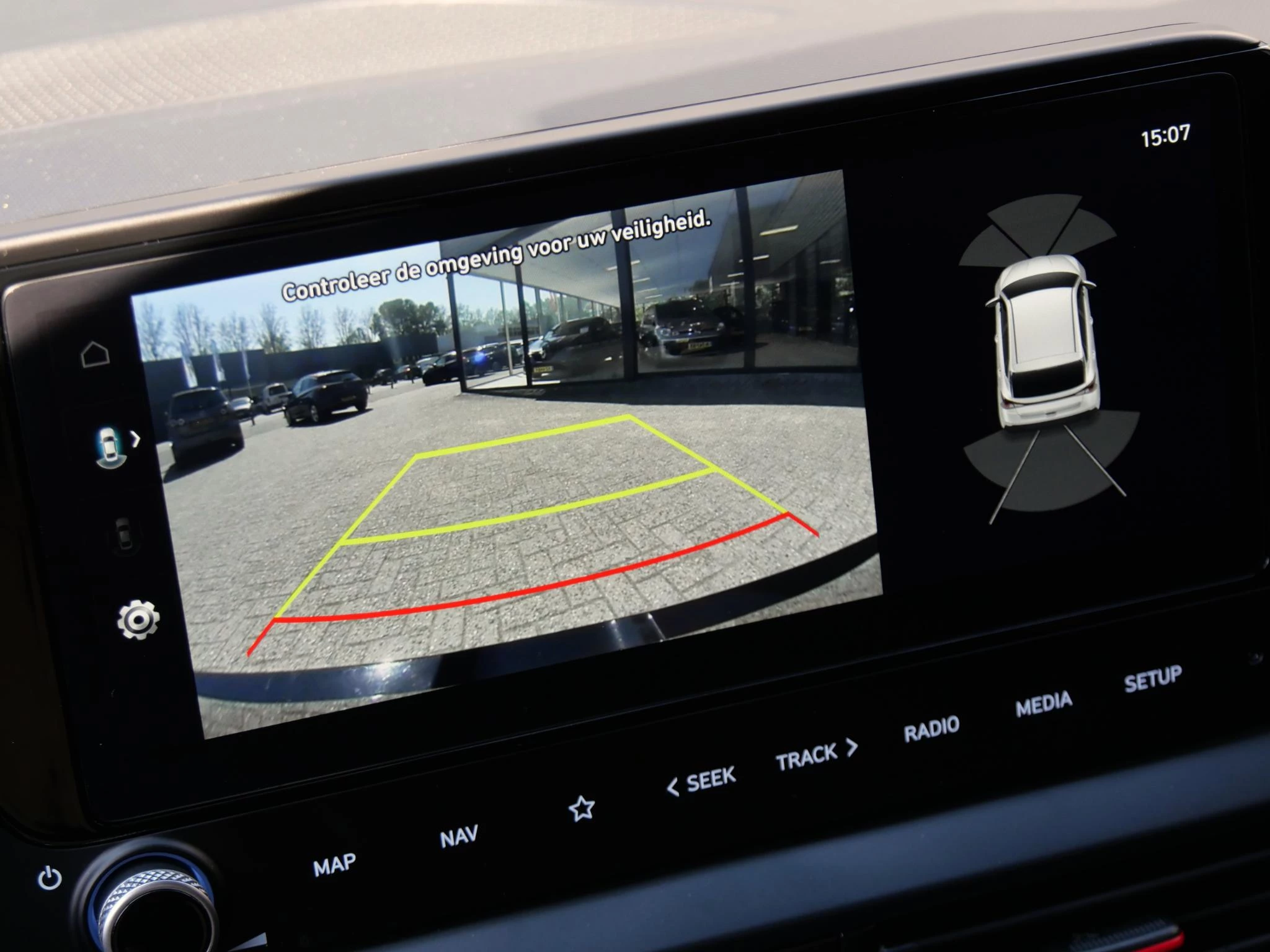 Inparkeren wordt via dit scherm ondersteund door parkeersensoren voor en achter met optische weergave en de achteruitrijcamera.